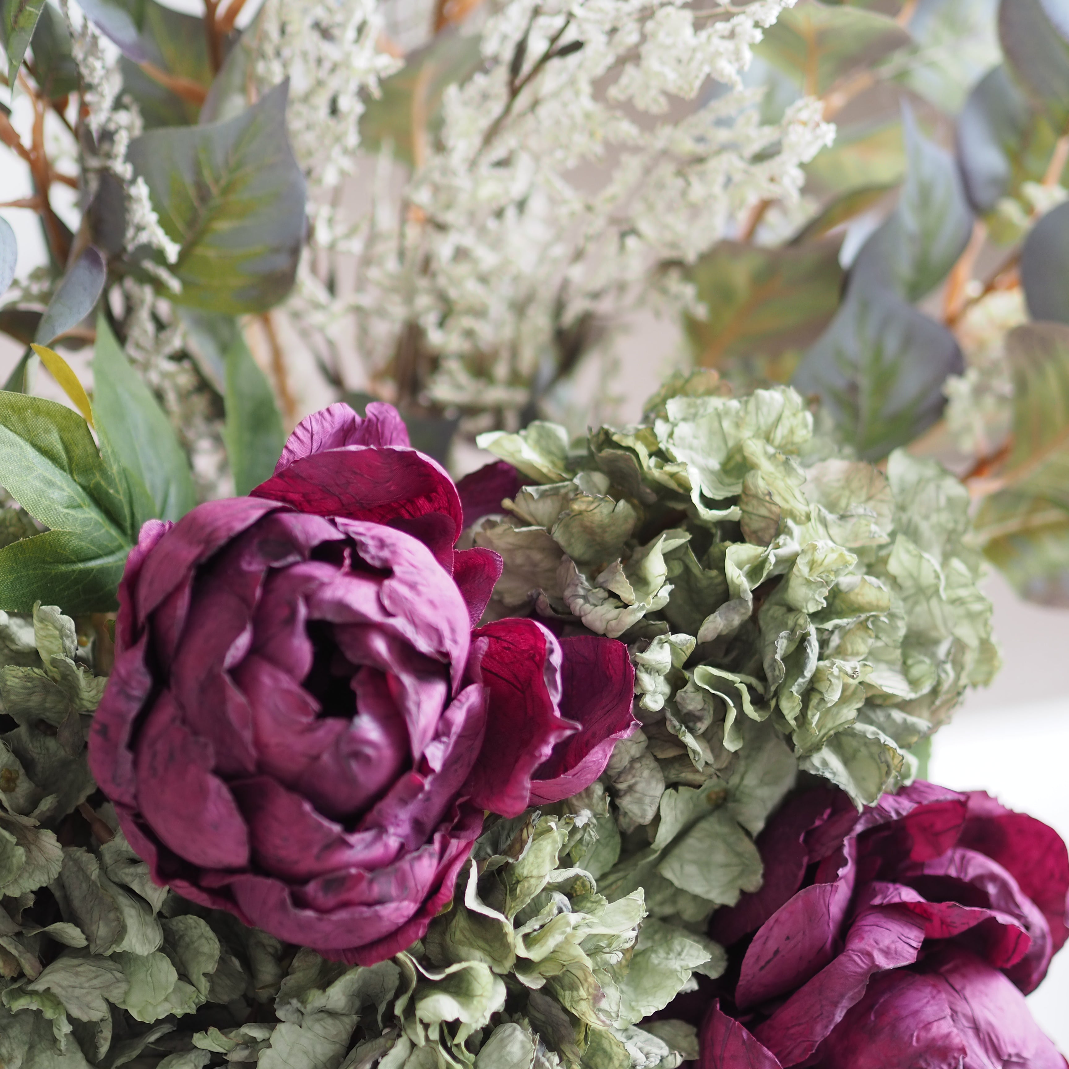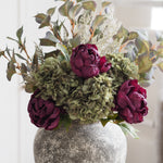 A stunning addition to our bouquet collection, these dried touch stems are perfect for creating a dramatic floral display in your home. The heads of the hydrangea and peony are frilled with beautiful detailed petals and ultra realistic leaves, in a deep mulberry purples and greens, designed to look like they have been air-dried. Teamed with our classic seeded Noah leaf and limonium stems. Style in your favourite vase in multiples for a stunning display.