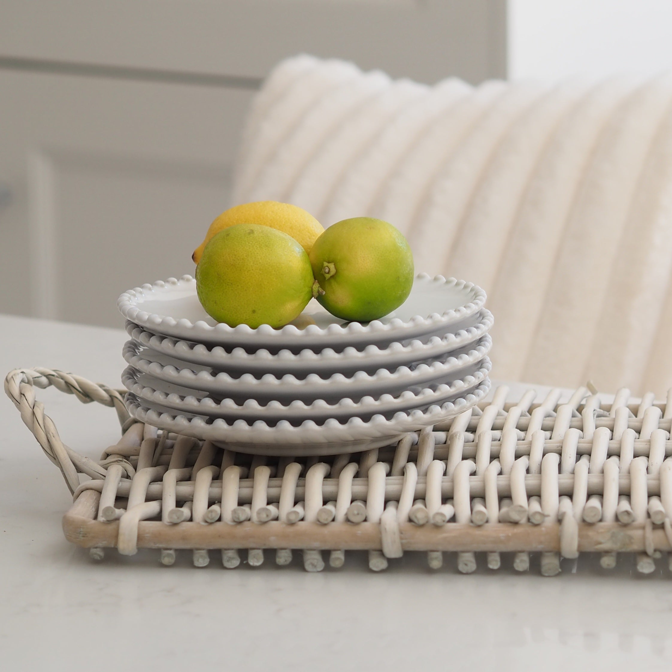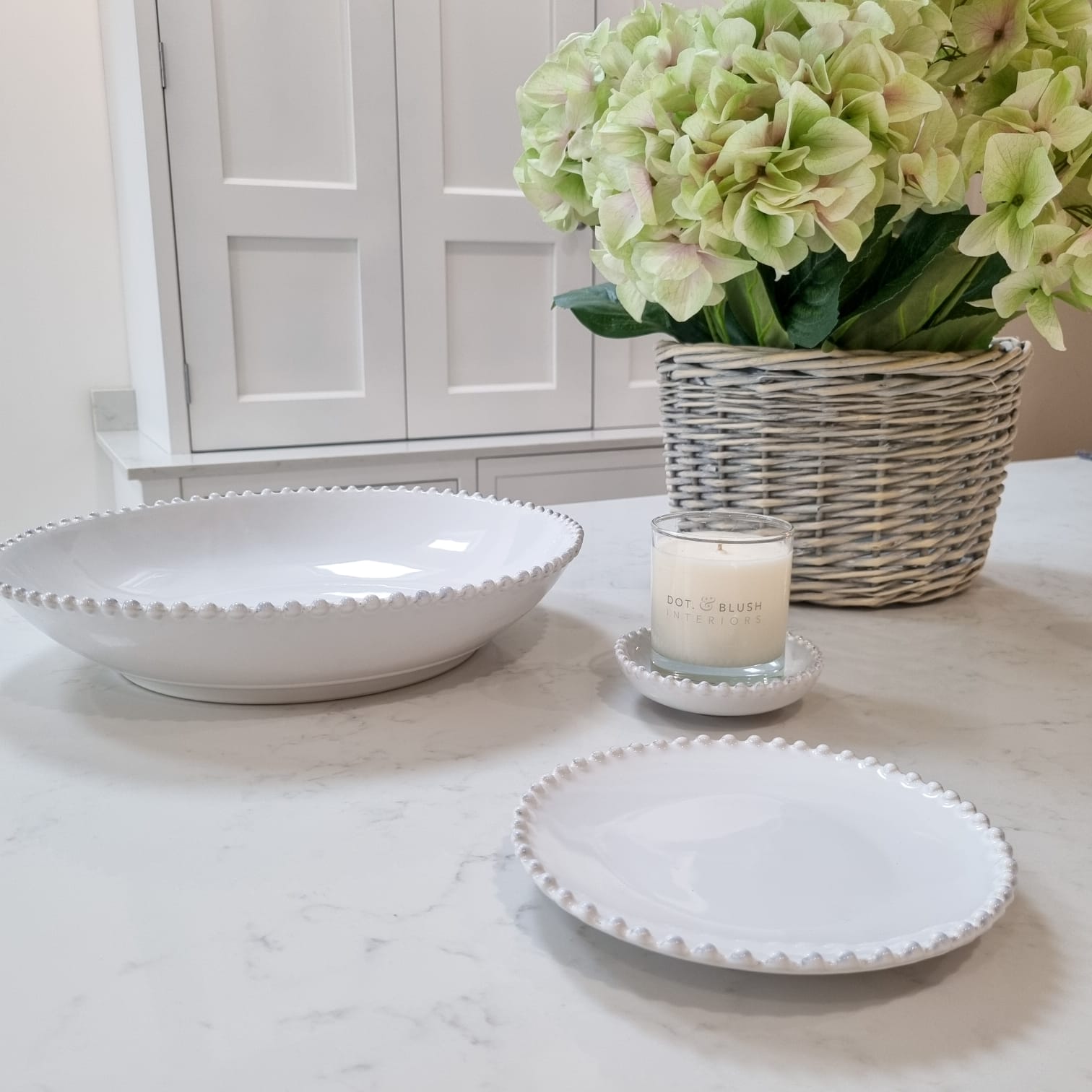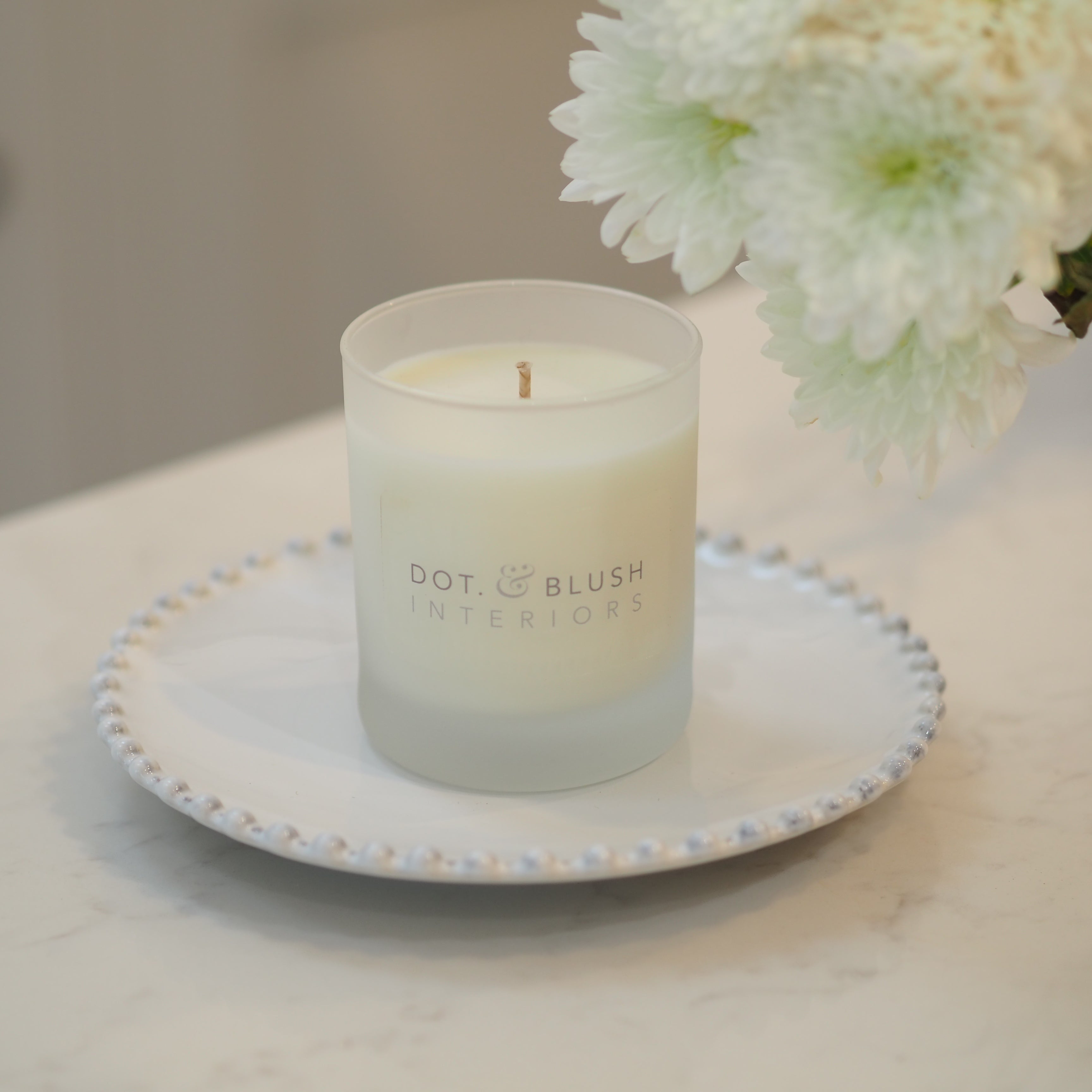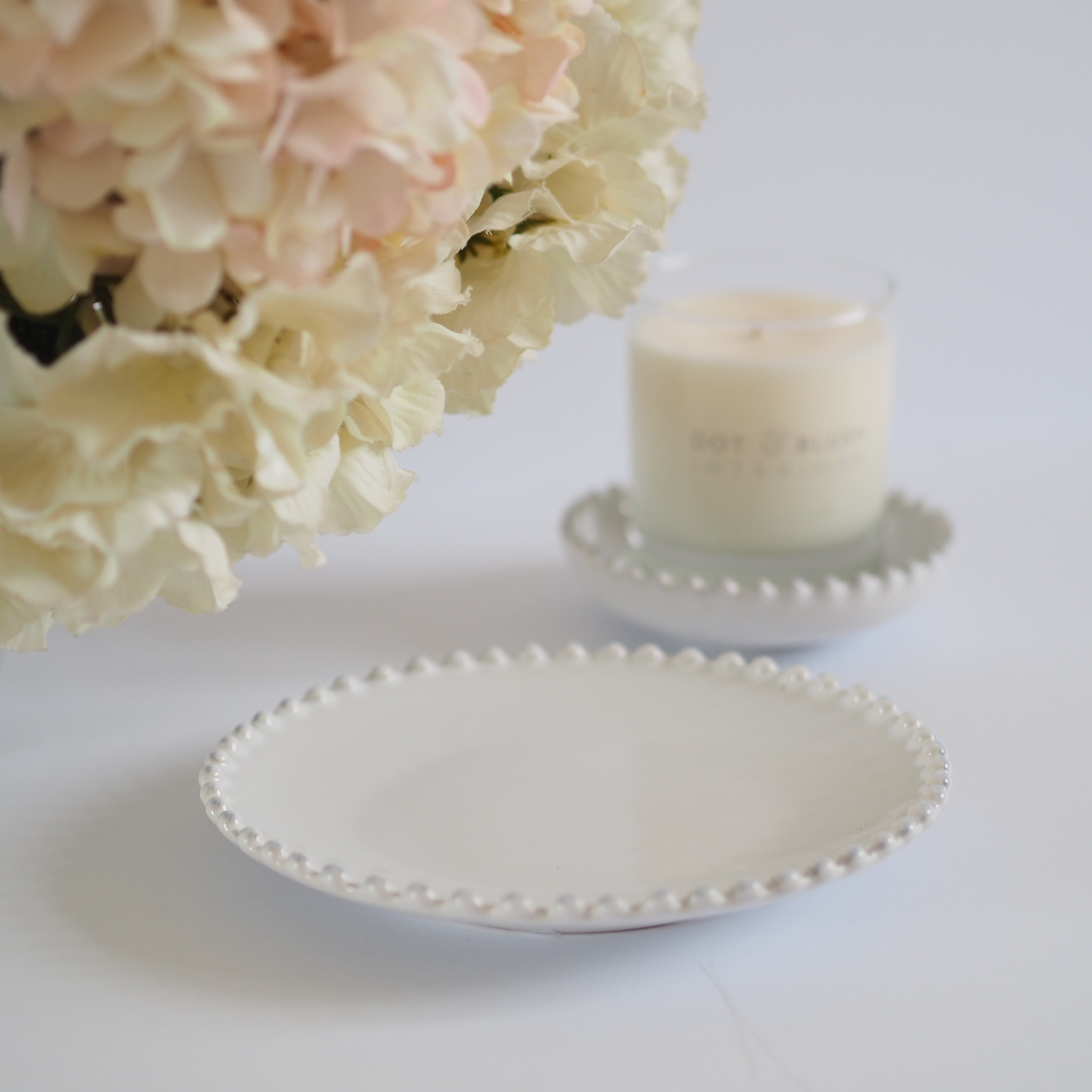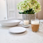 This versatile small white ceramic plate is a beautiful addition to any area of your home. The stunning pearl detailing showcases the classic white design. Use as a side plate, food display plate or as a candle holder for our signature Dot & Blush candles.