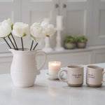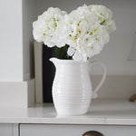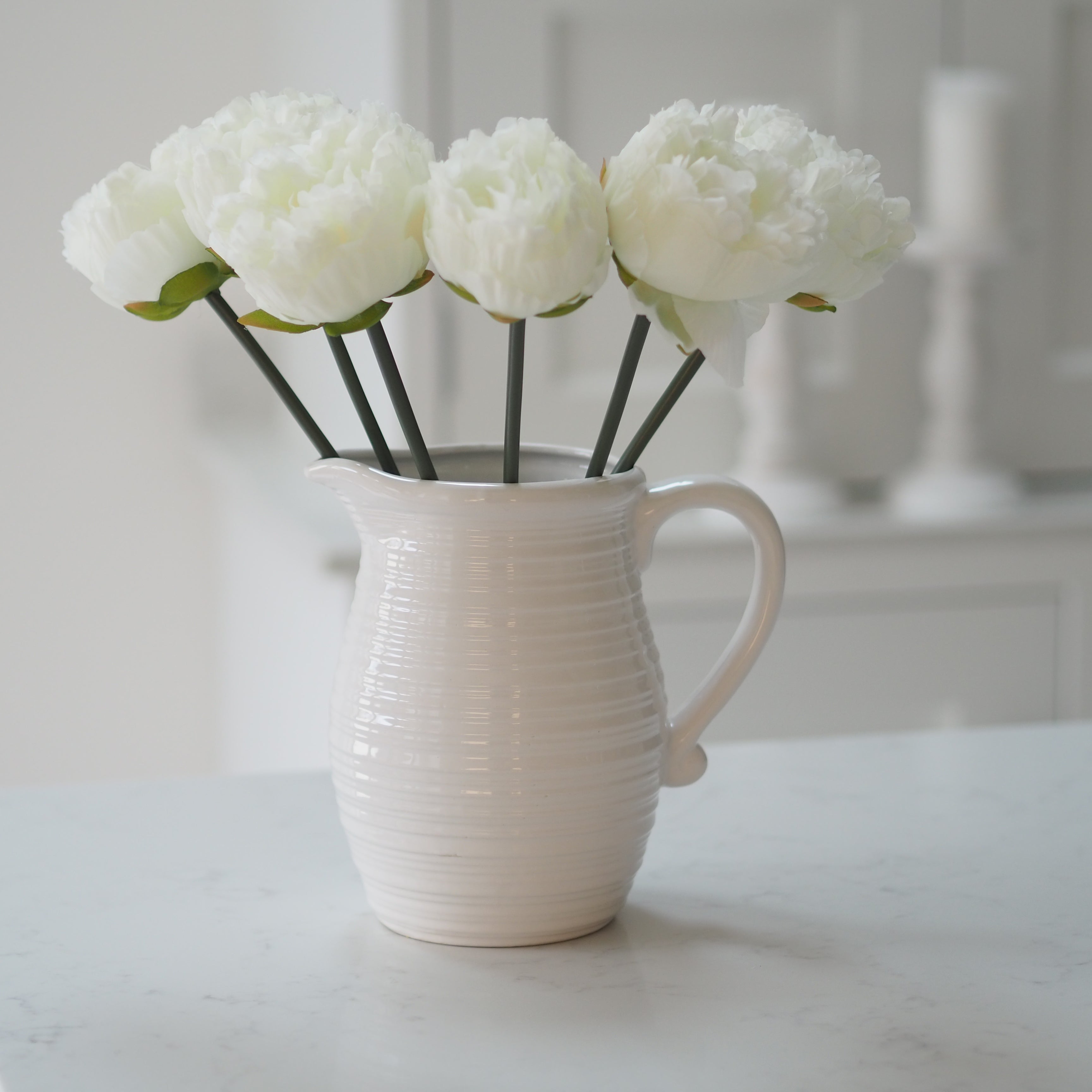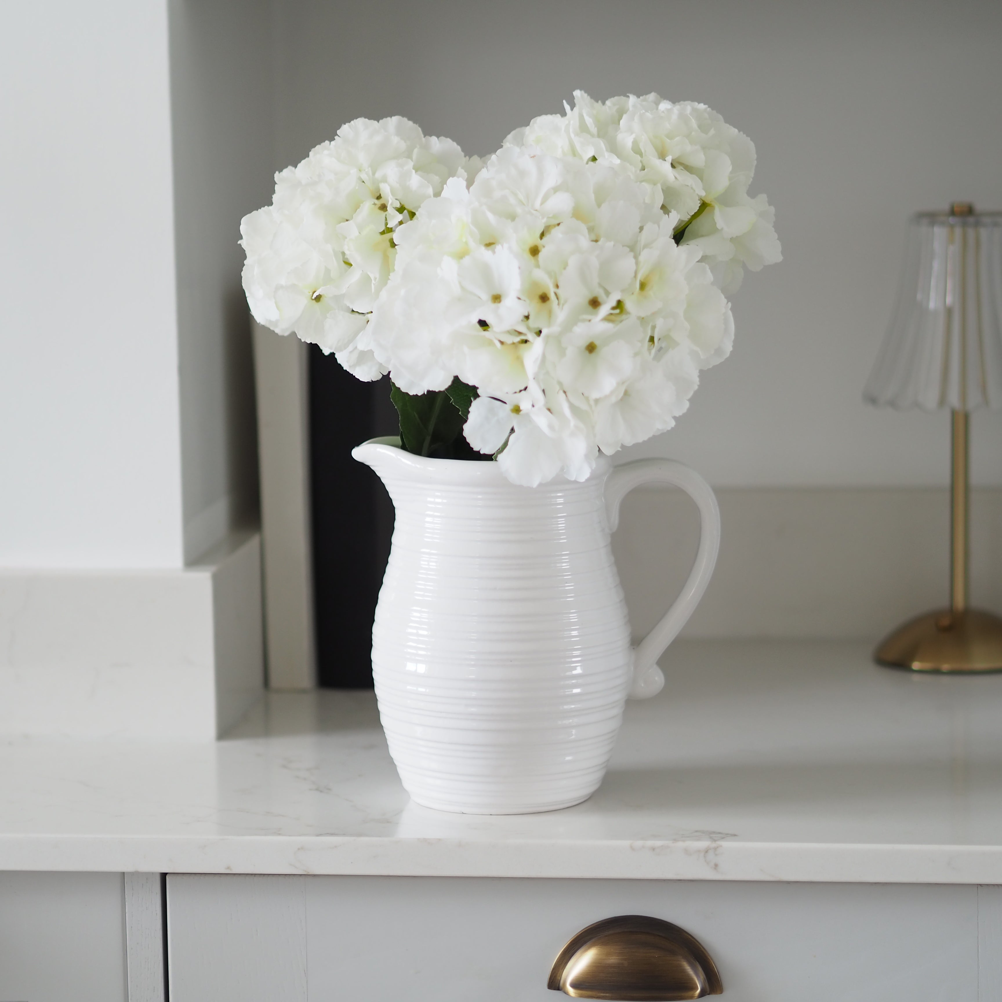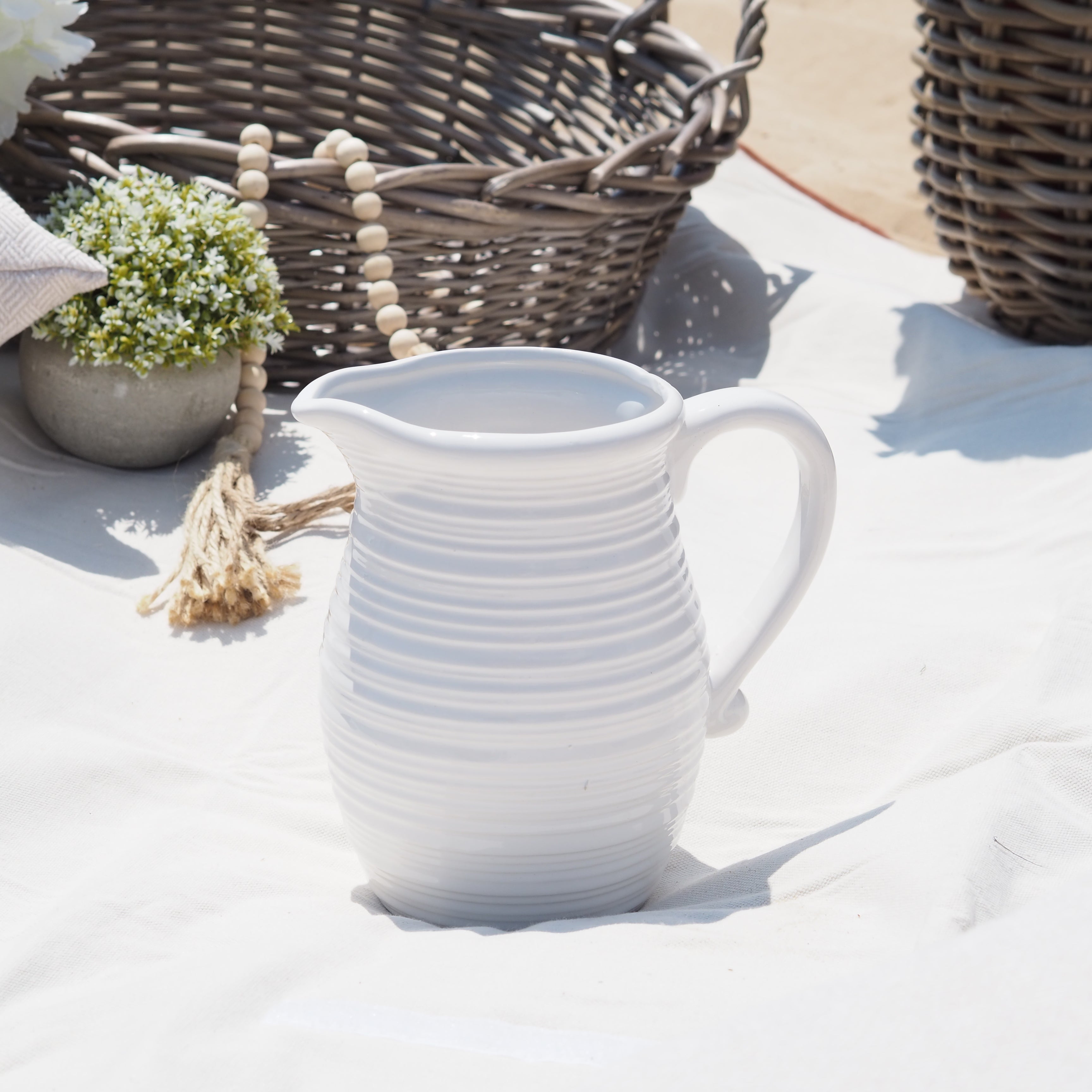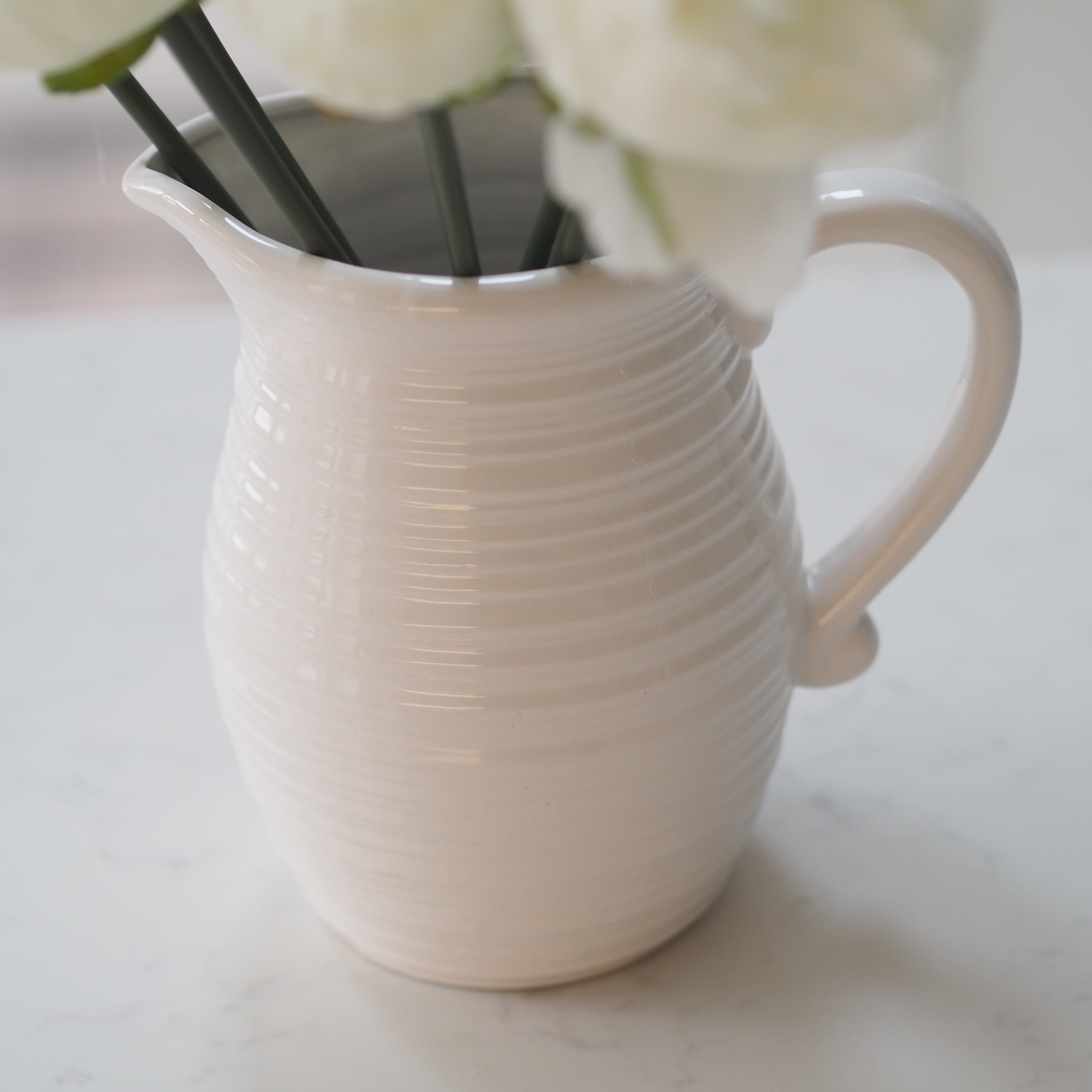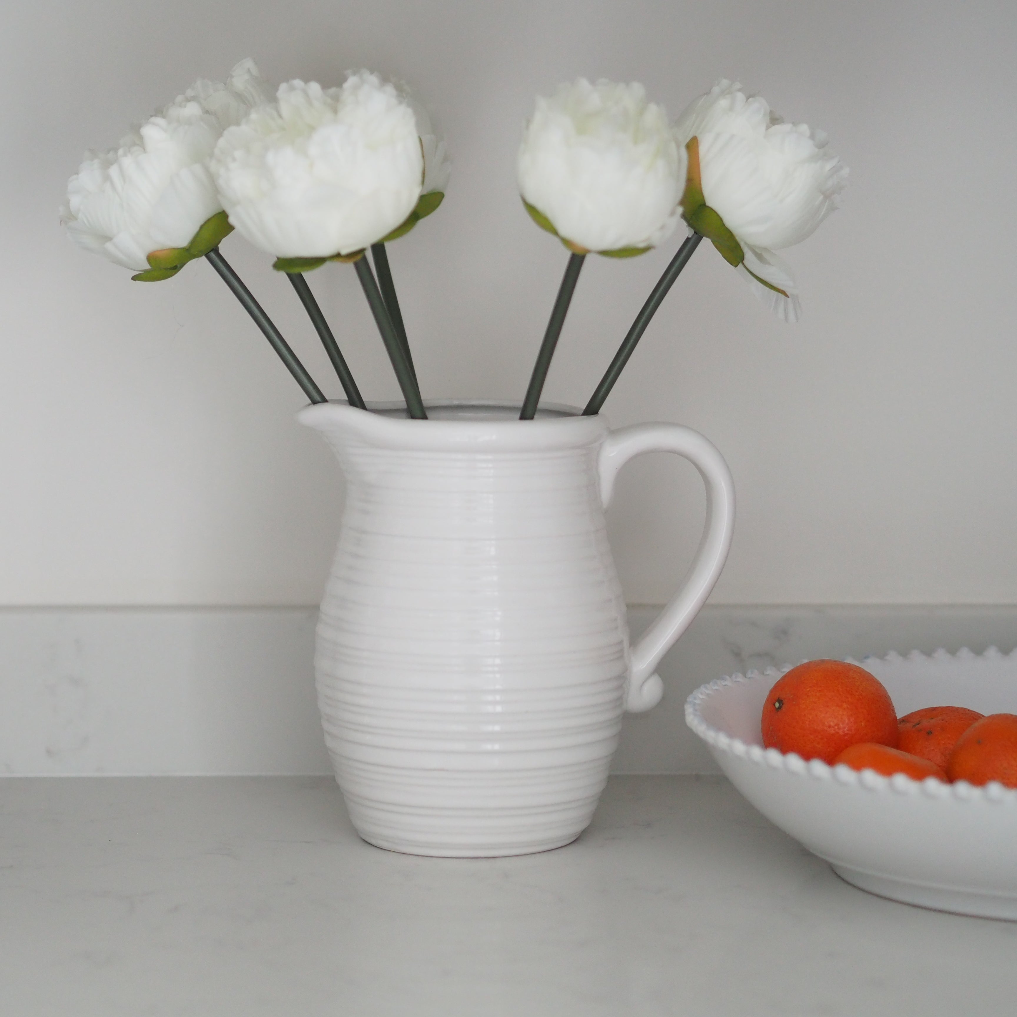 This white ceramic ribbed handle jug showcases a timeless design. The perfect accessory for your kitchen, floral display or summer soiree. This jug easily transitions from season to season with is classic and elegant design.