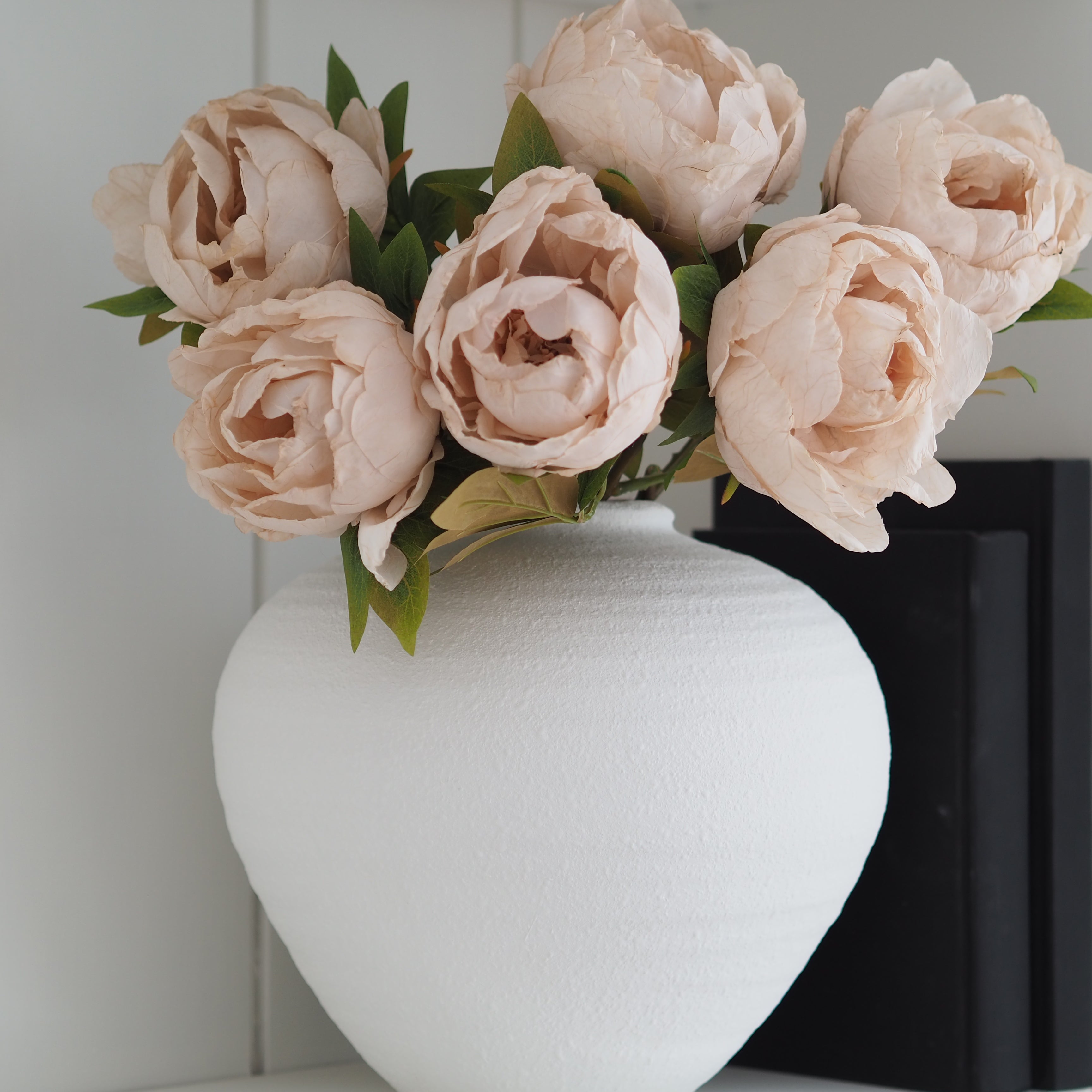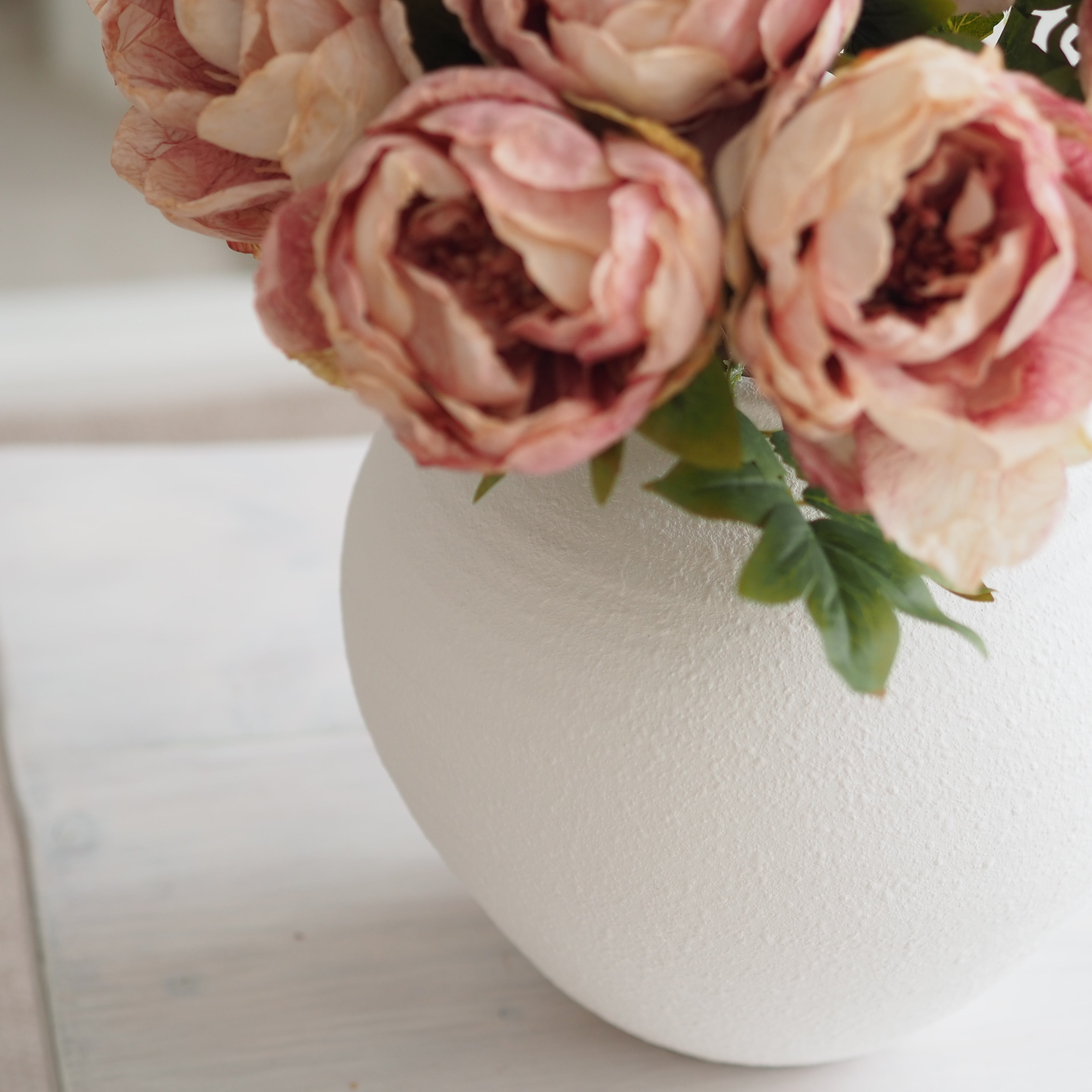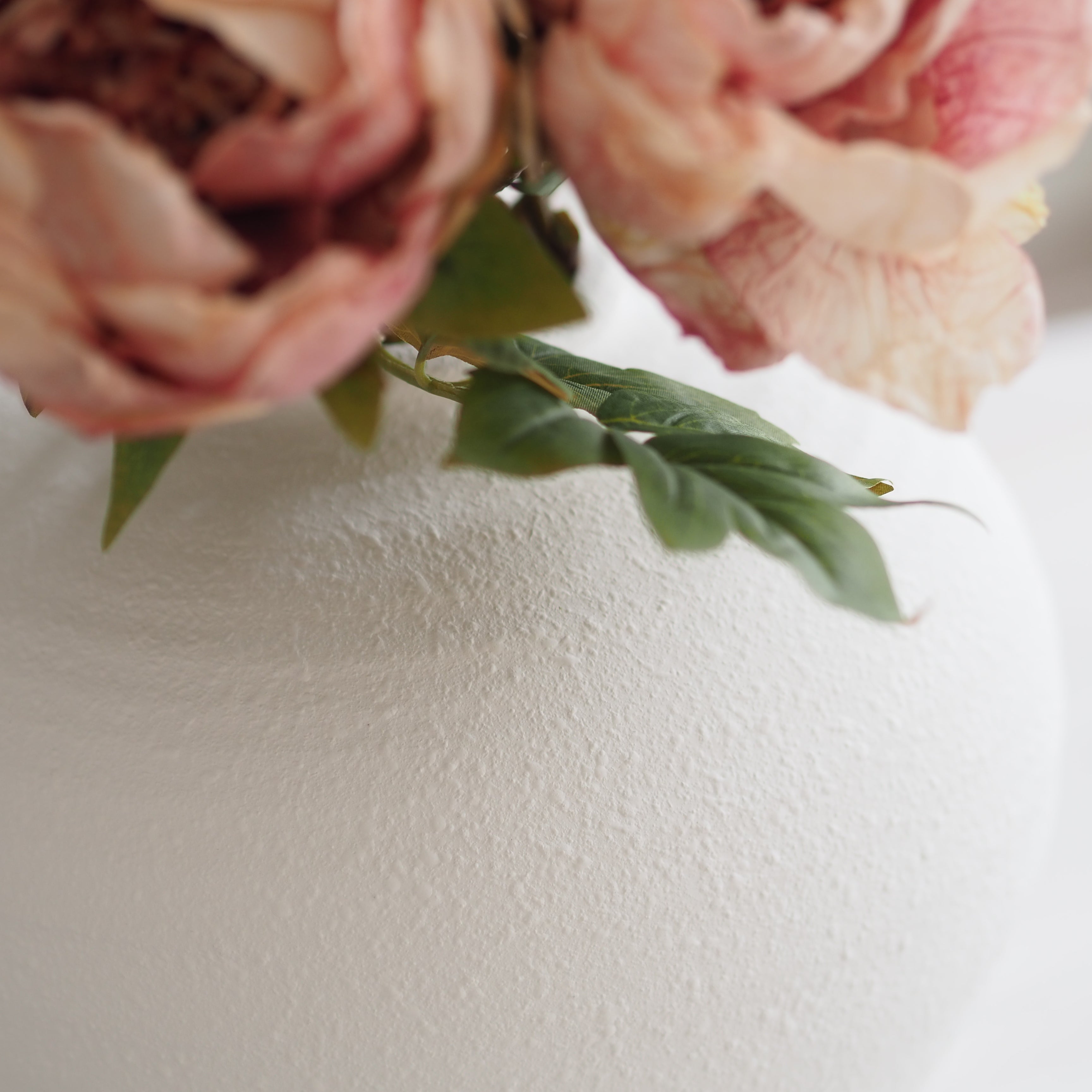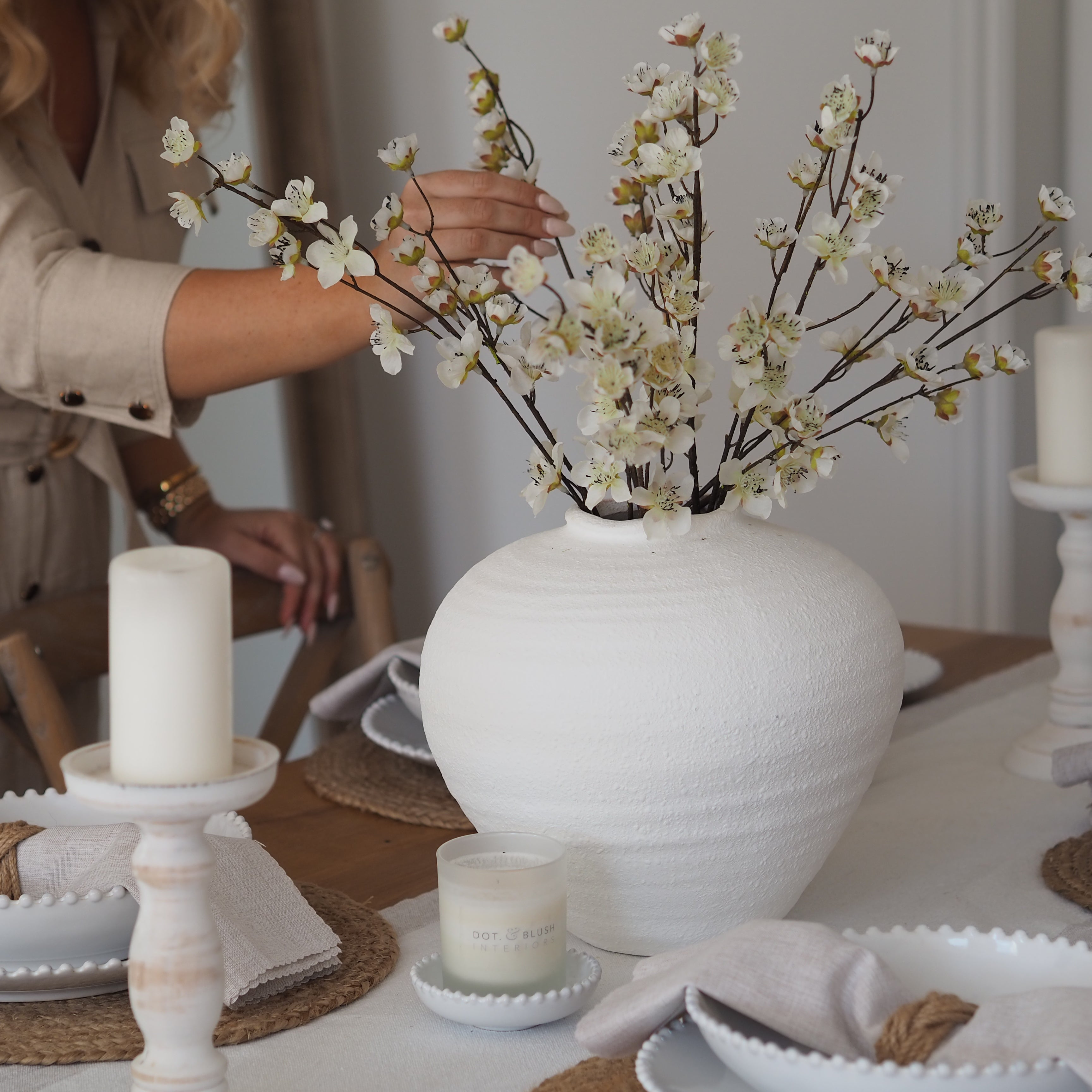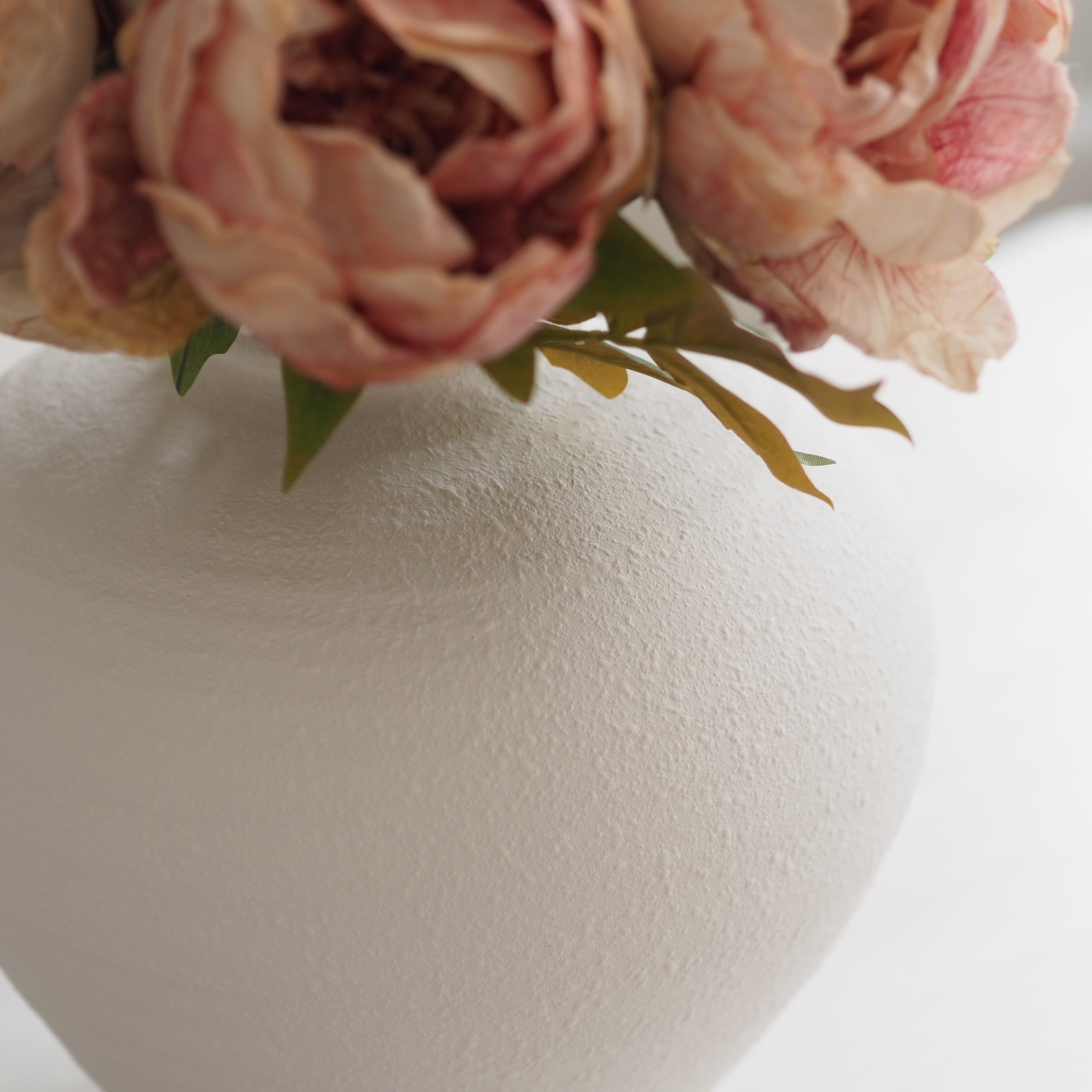 The perfect statement piece. This matte textured white vase is a wonderfully earthy and neutral piece with an eye-catching design that is both timeless yet modern. With stunning naturally occurring texture, this beautiful vase will add texture and depth to any space. The waved edge opening adds a unique touch and is perfect for accommodating your favourite Dot & Blush bouquets and stems.
