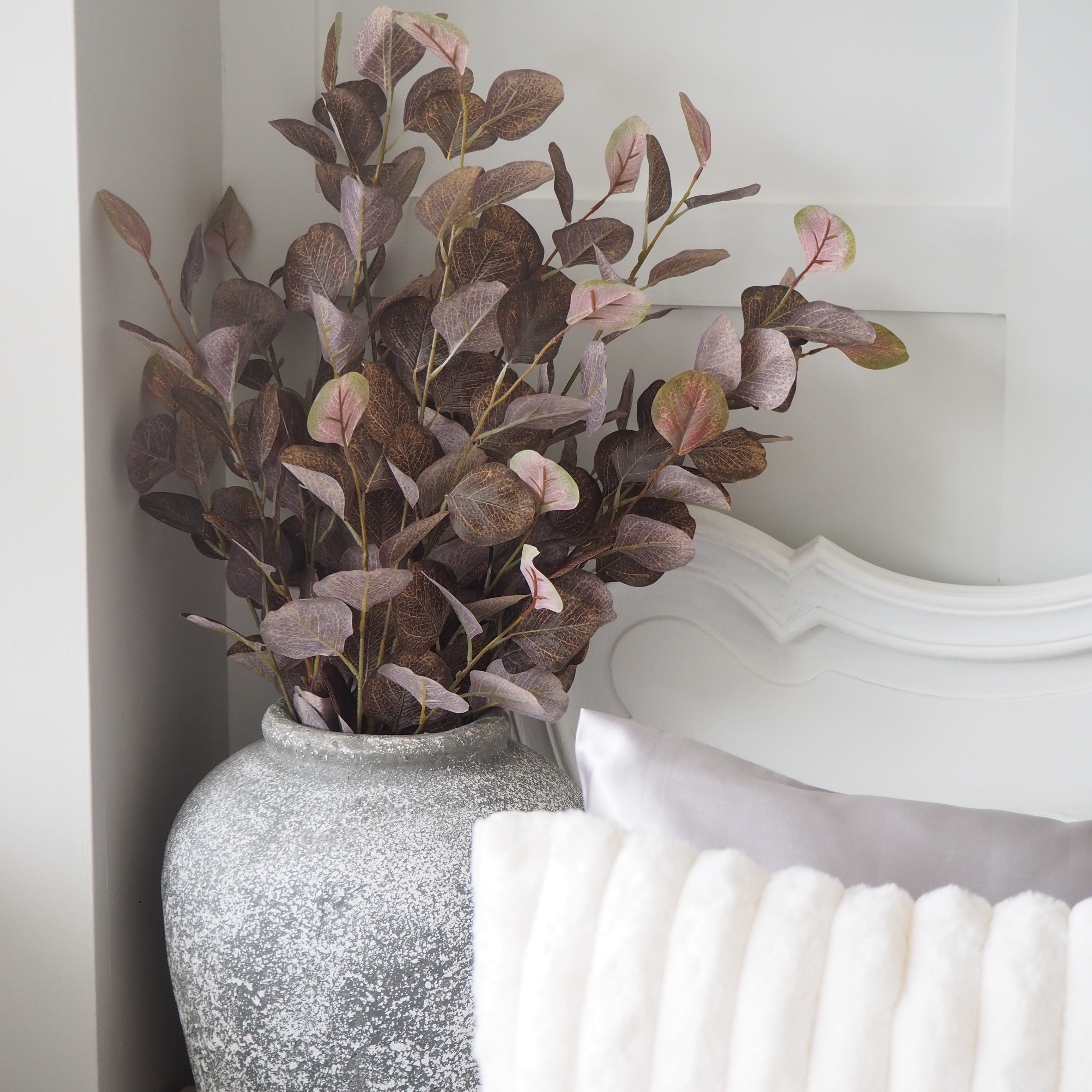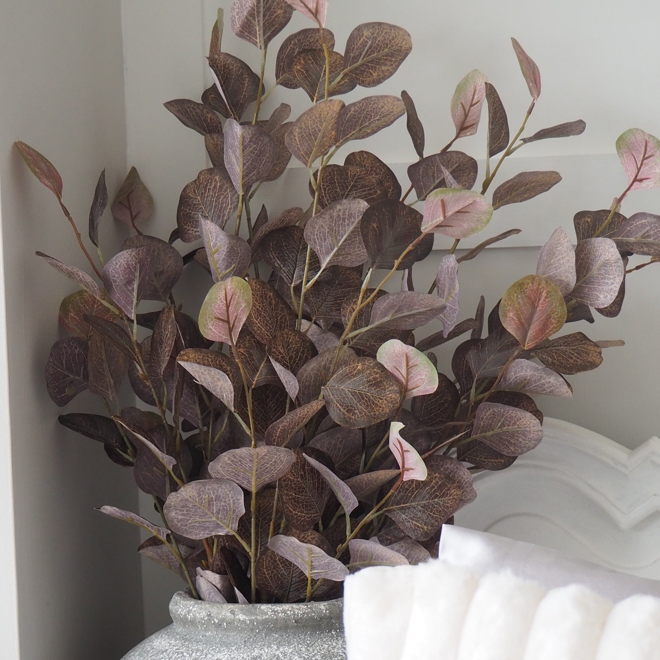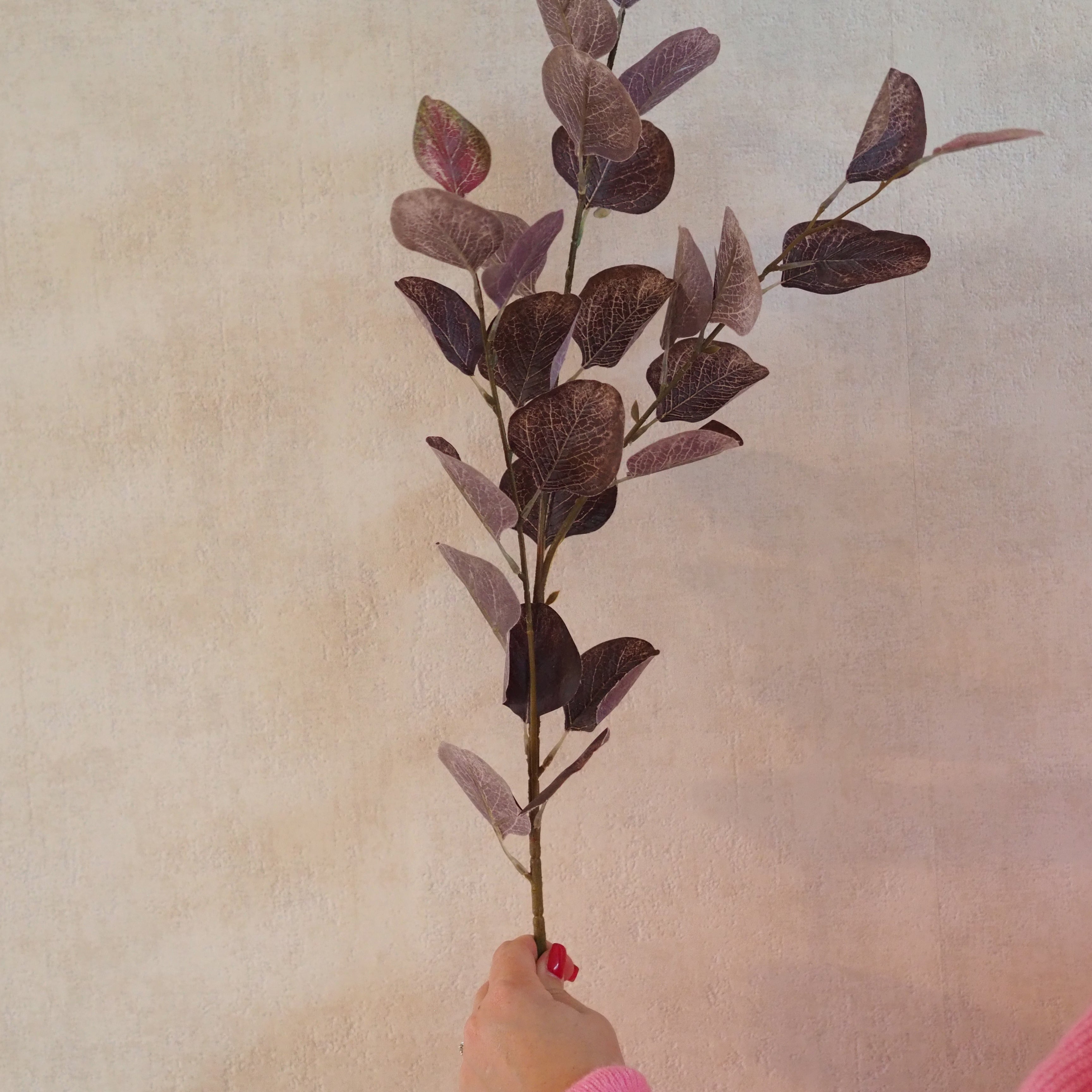 Un impresionante ramo clásico color borgoña, perfecto para adornar tu jarrón o combinar con otras flores. Los tallos de eucalipto Silver Dollar color borgoña crean una presentación completa y atemporal durante todo el año. Las hojas de color tierra tienen un diseño ultra realista . Nuestros ramos atados a mano son el complemento perfecto para tu hogar. Todos los tallos están alambrados a mano y la altura se puede ajustar doblando suavemente la base para adaptarla al jarrón de tu elección.