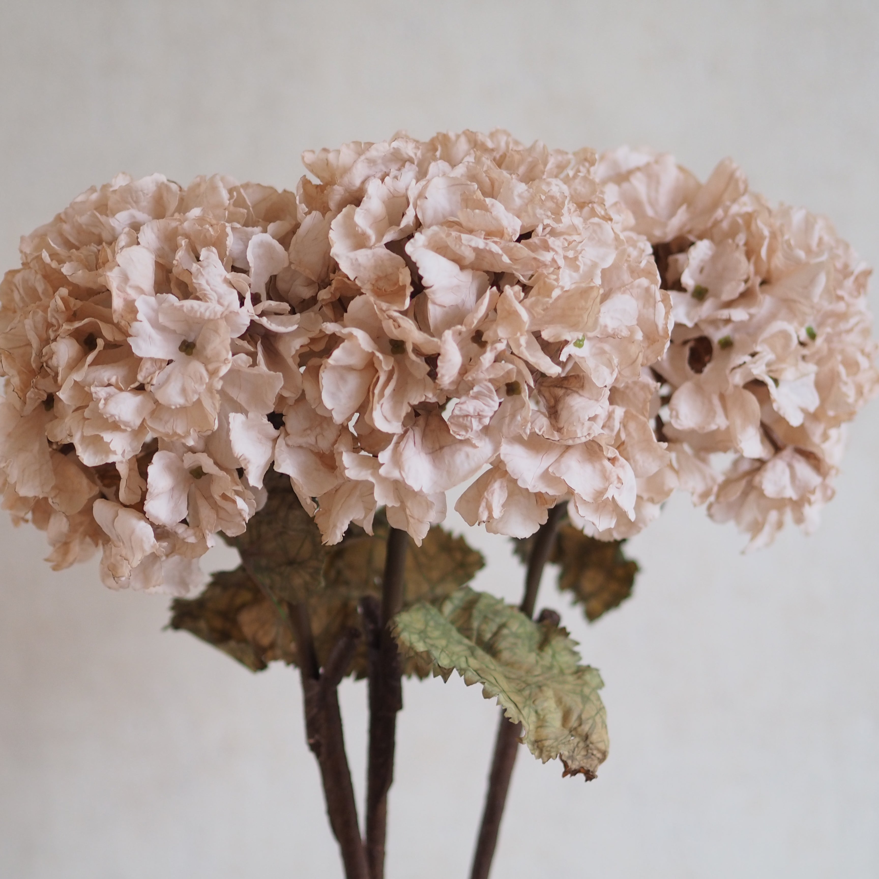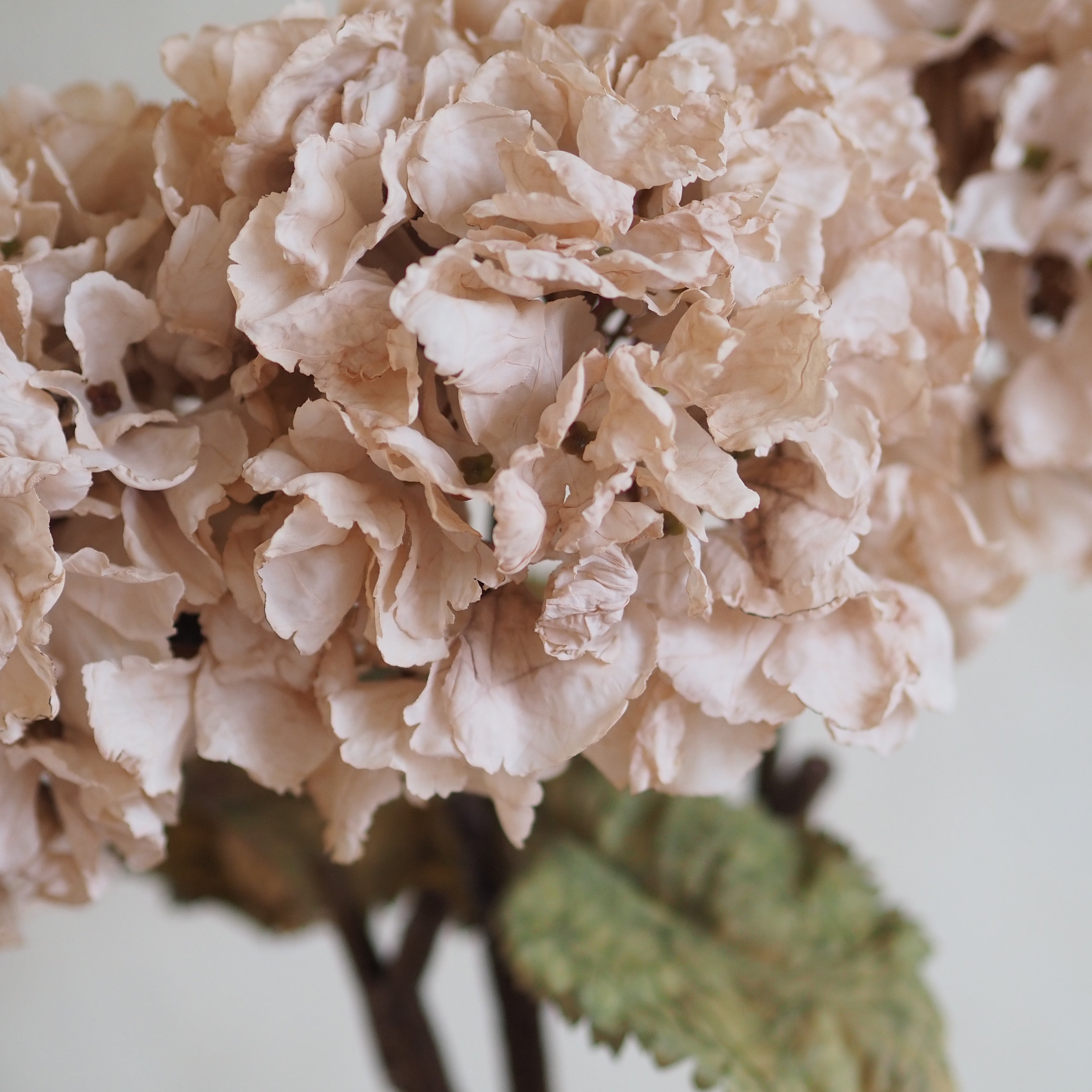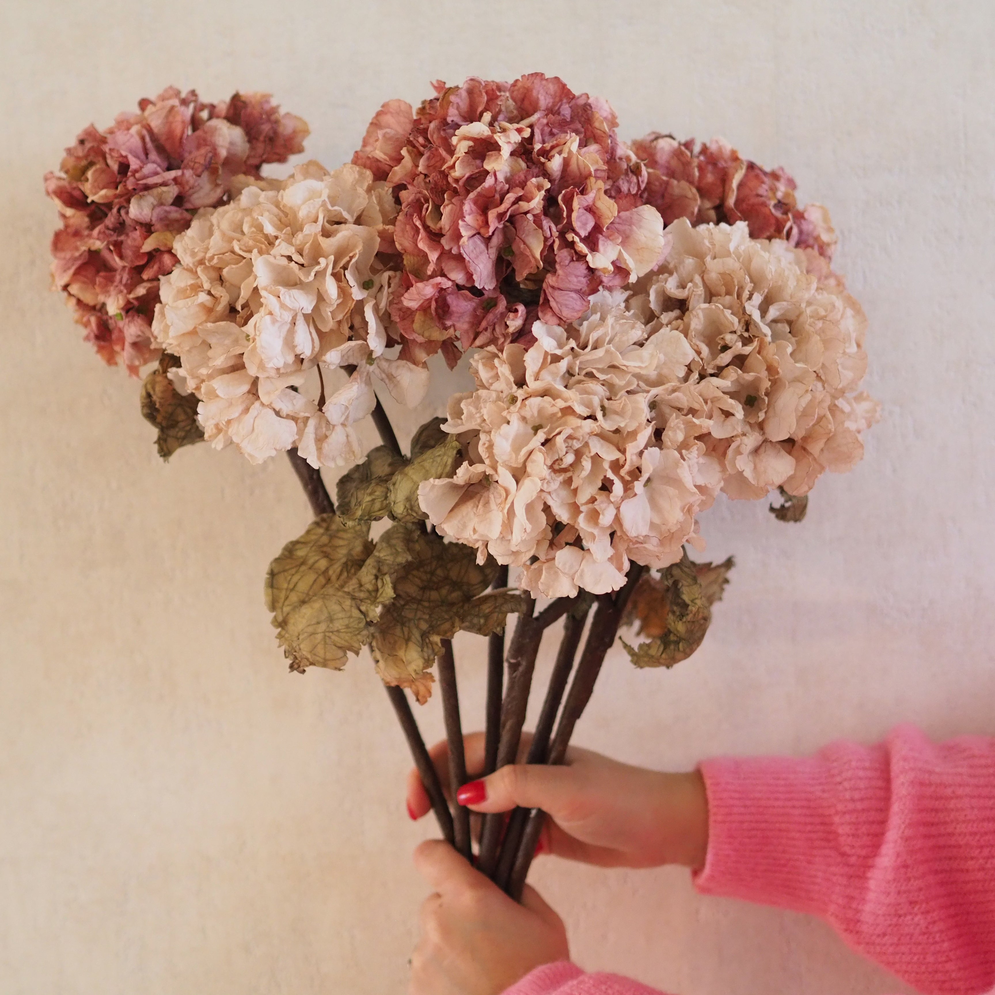 Una impresionante adición a nuestra colección de tallos artificiales, estas hortensias secas de color neutro ruborizado son perfectas para crear un arreglo floral espectacular en tu hogar. Las cabezas están adornadas con hermosos pétalos y hojas detalladas , y su diseño imita el secado al aire . Colócalas en tu jarrón favorito en varias unidades para una presentación espectacular.