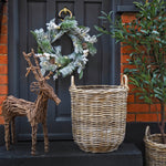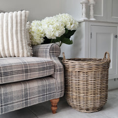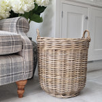 Elaborada con ratán tejido con acabado antiguo, con una forma clásica de cesta. Nuestra cesta rústica y natural es la manera perfecta de exhibir tus troncos, tu planta favorita, un olivo o mantas, y añade un toque rústico y acogedor a tu hogar.