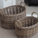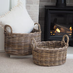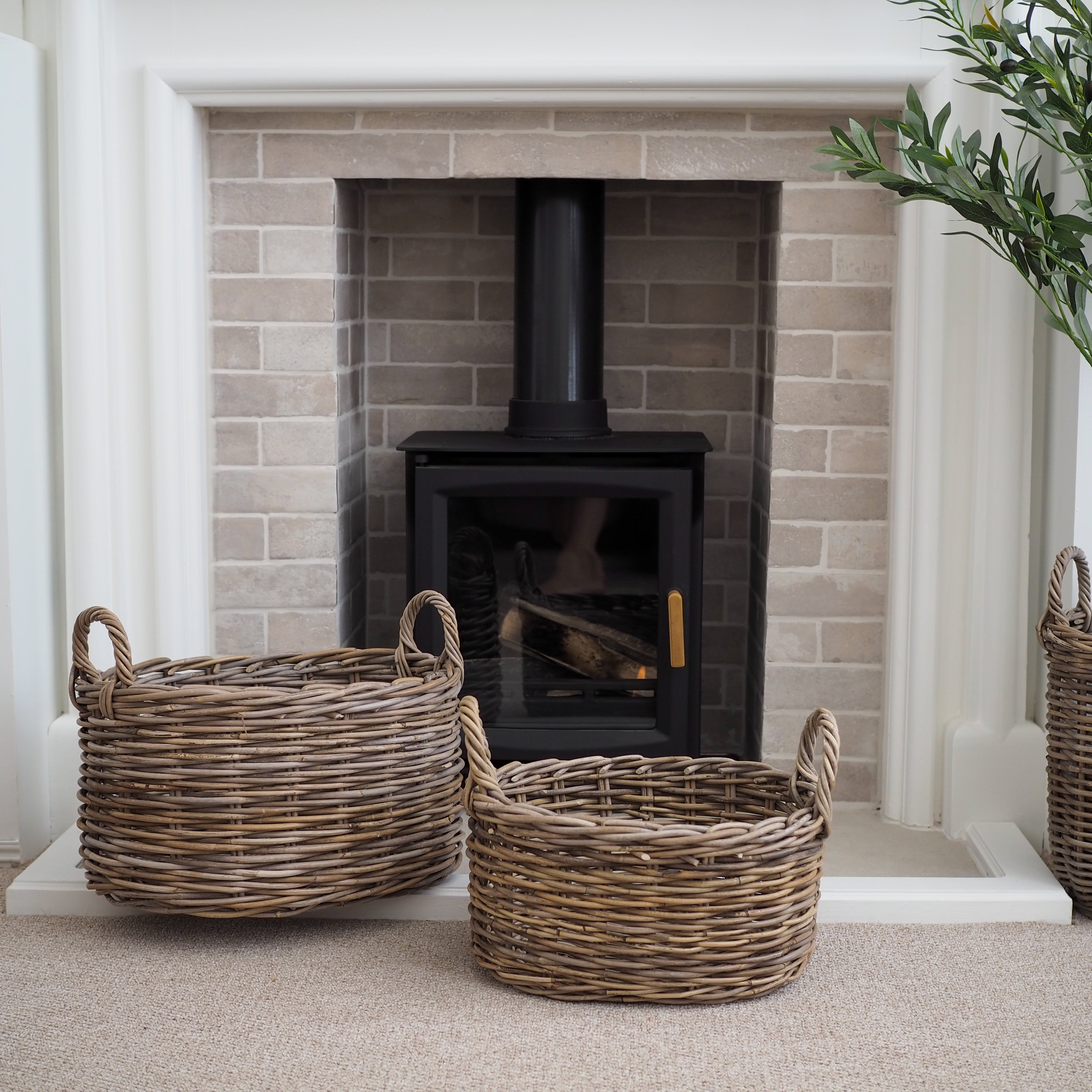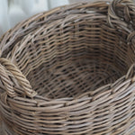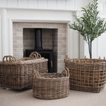 Elaborada con ratán tejido con acabado antiguo y una forma ovalada única, nuestra cesta rústica y natural es perfecta para exhibir leña, mantas favoritas o como práctico elemento de almacenamiento. Perfecta para añadir un toque rústico y acogedor a tu hogar.