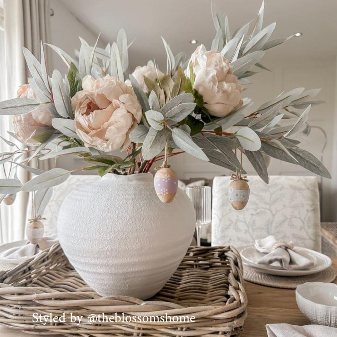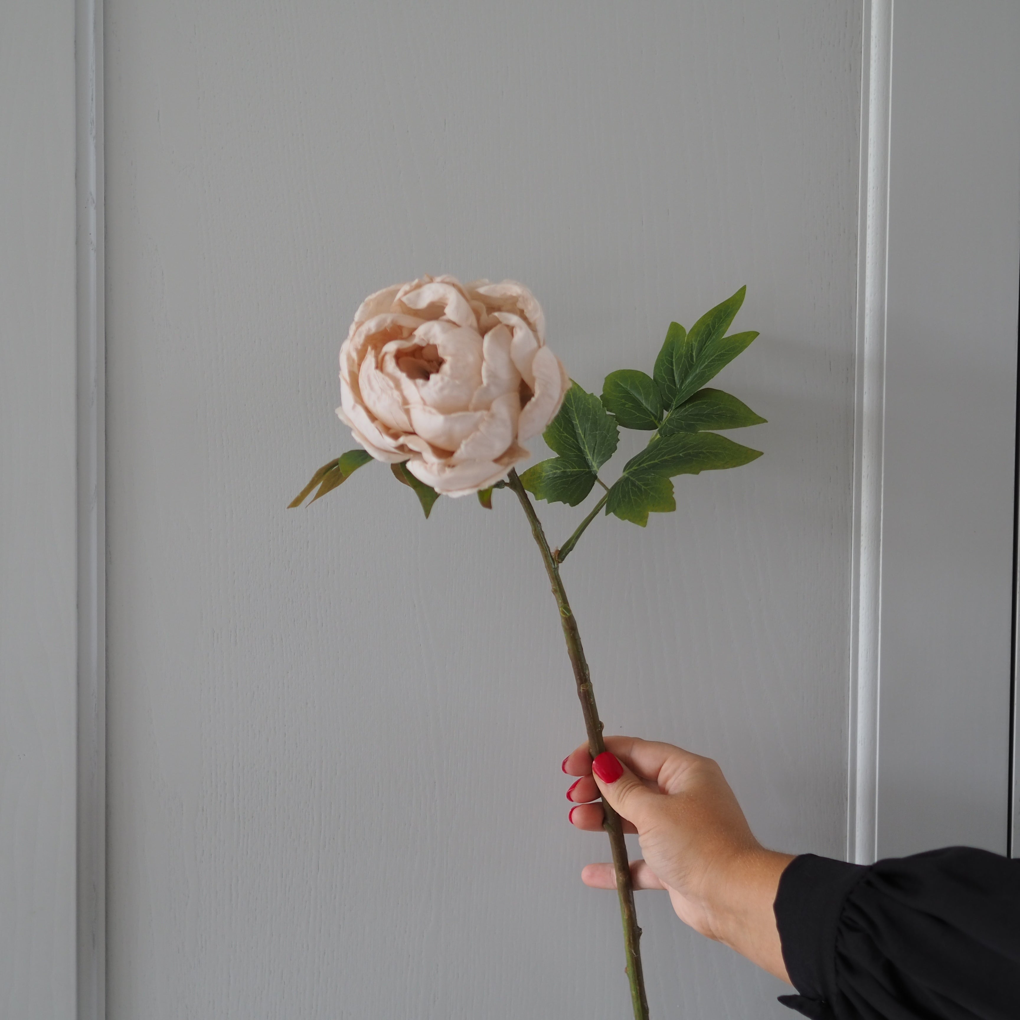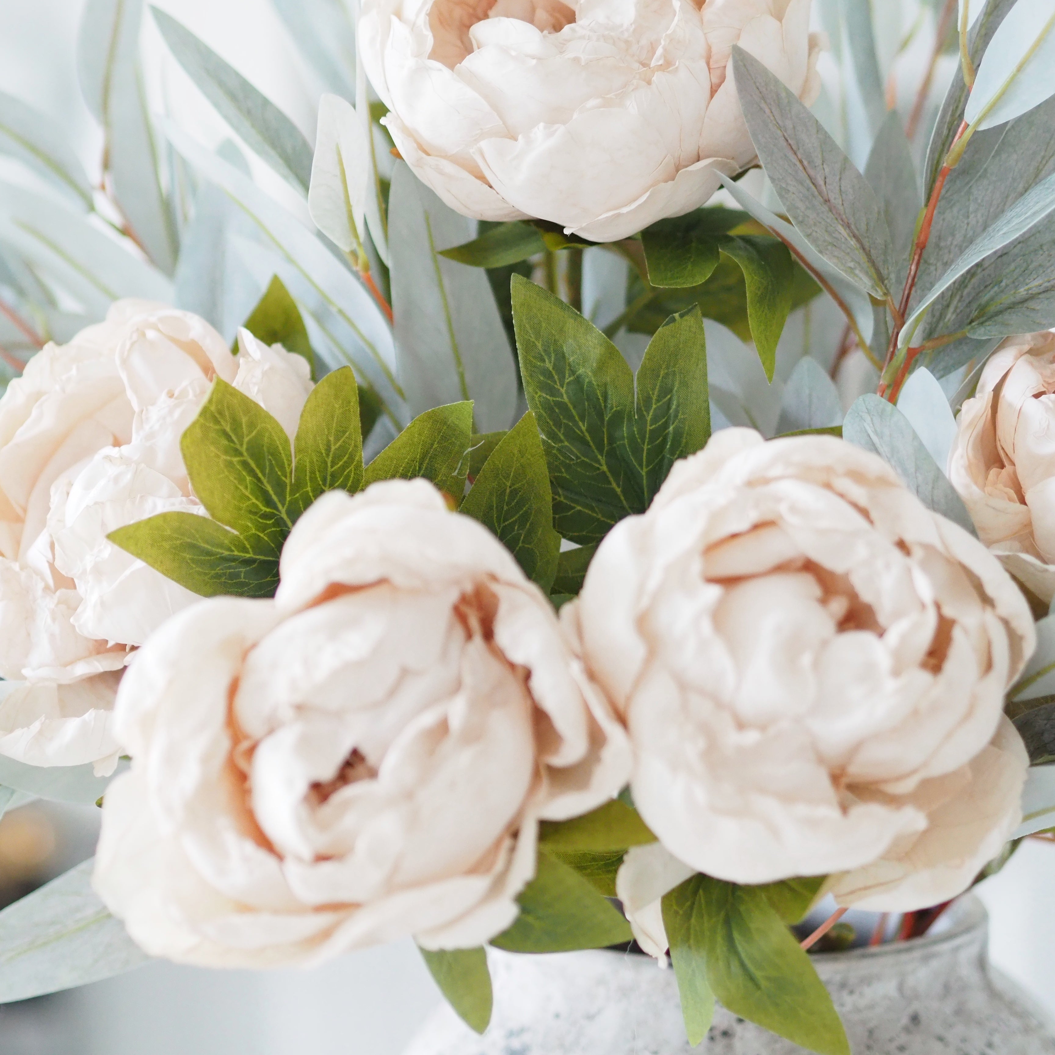 Una magnífica adición a nuestra colección de ramos artificiales, estos tallos de peonía seca al tacto en color ostra blanco roto son perfectos para crear un arreglo floral espectacular en su hogar. Combinan con deslumbrantes ramilletes de hojas nobles en verde apagado . Las cabezas florales están adornadas con pétalos y hojas con un hermoso detalle en un tono blanco roto perfecto. Todos los tallos están alambrados a mano y la altura se puede ajustar doblando suavemente la base para adaptarla al jarrón elegido.