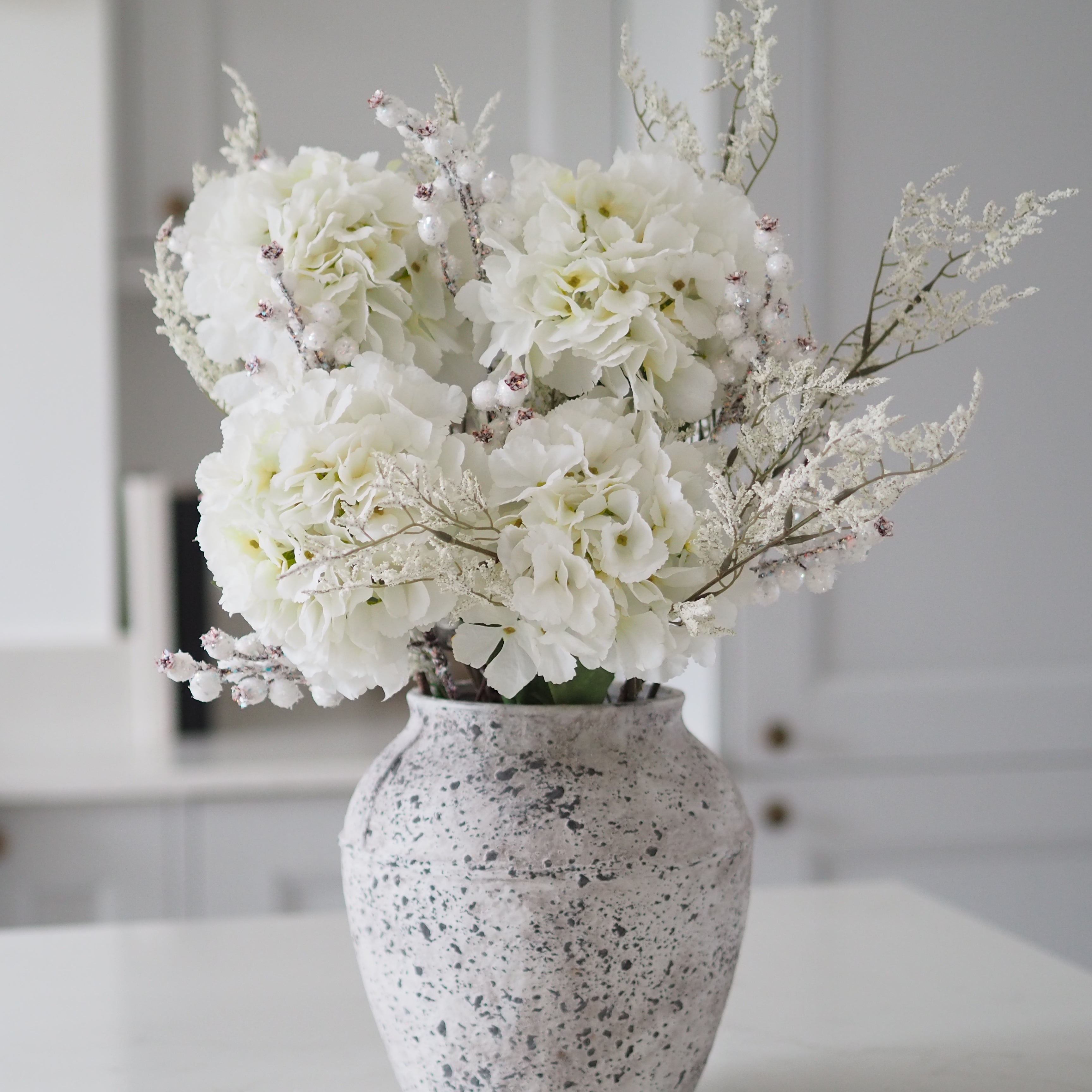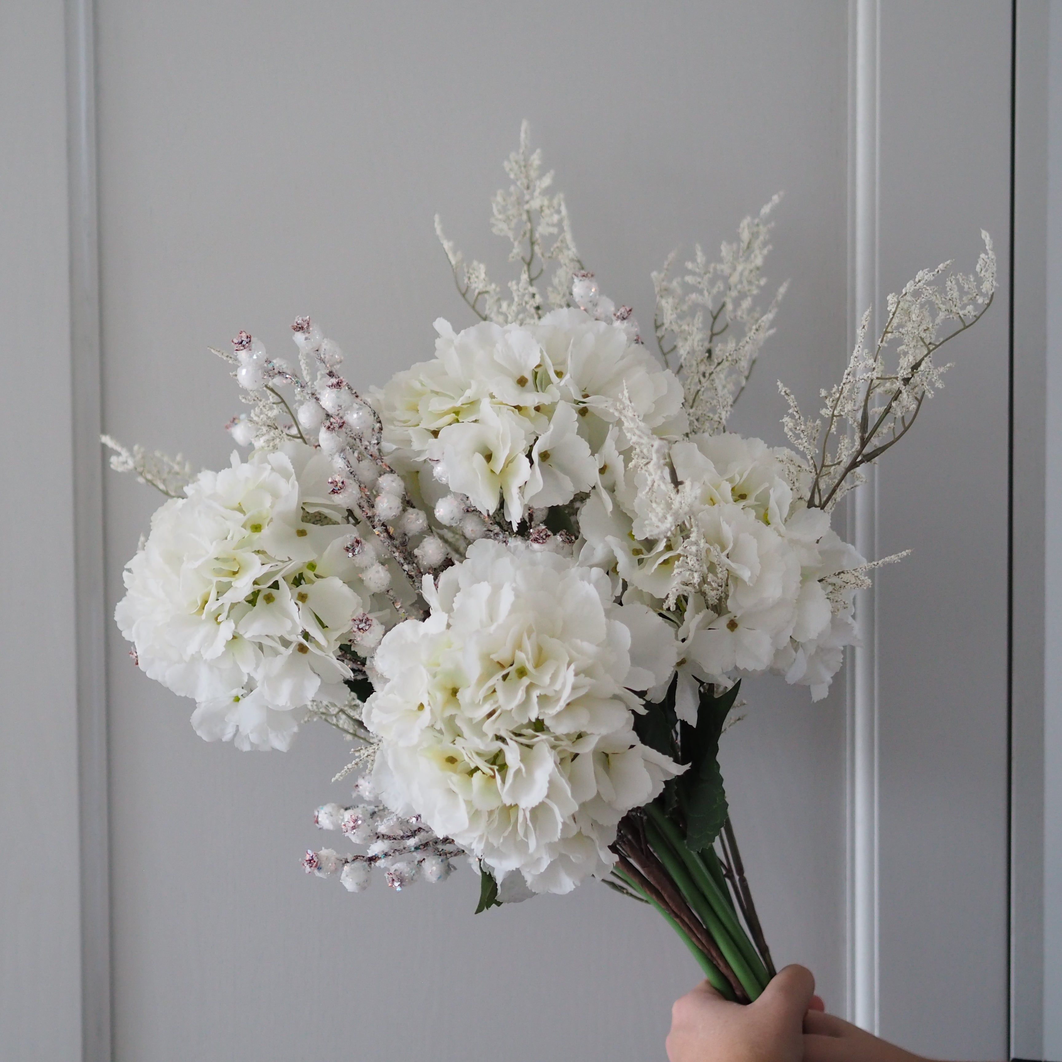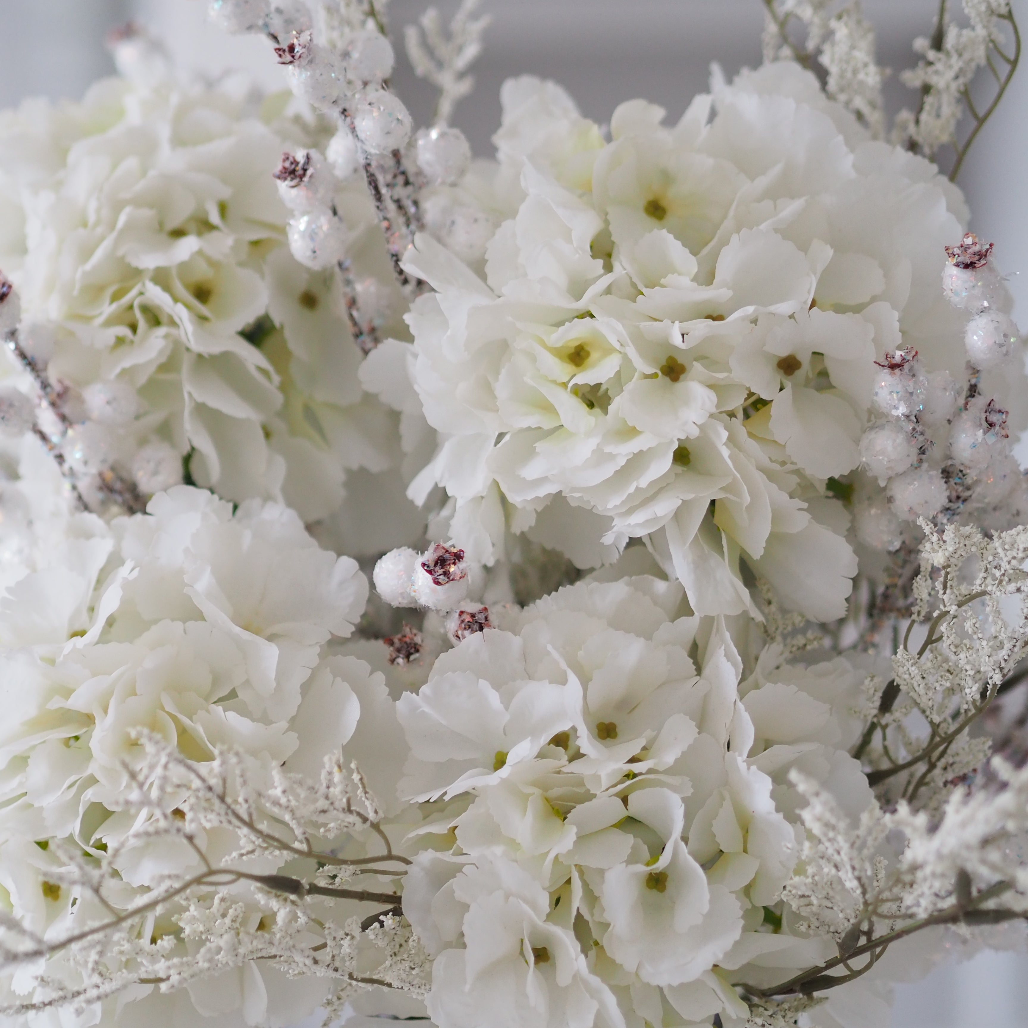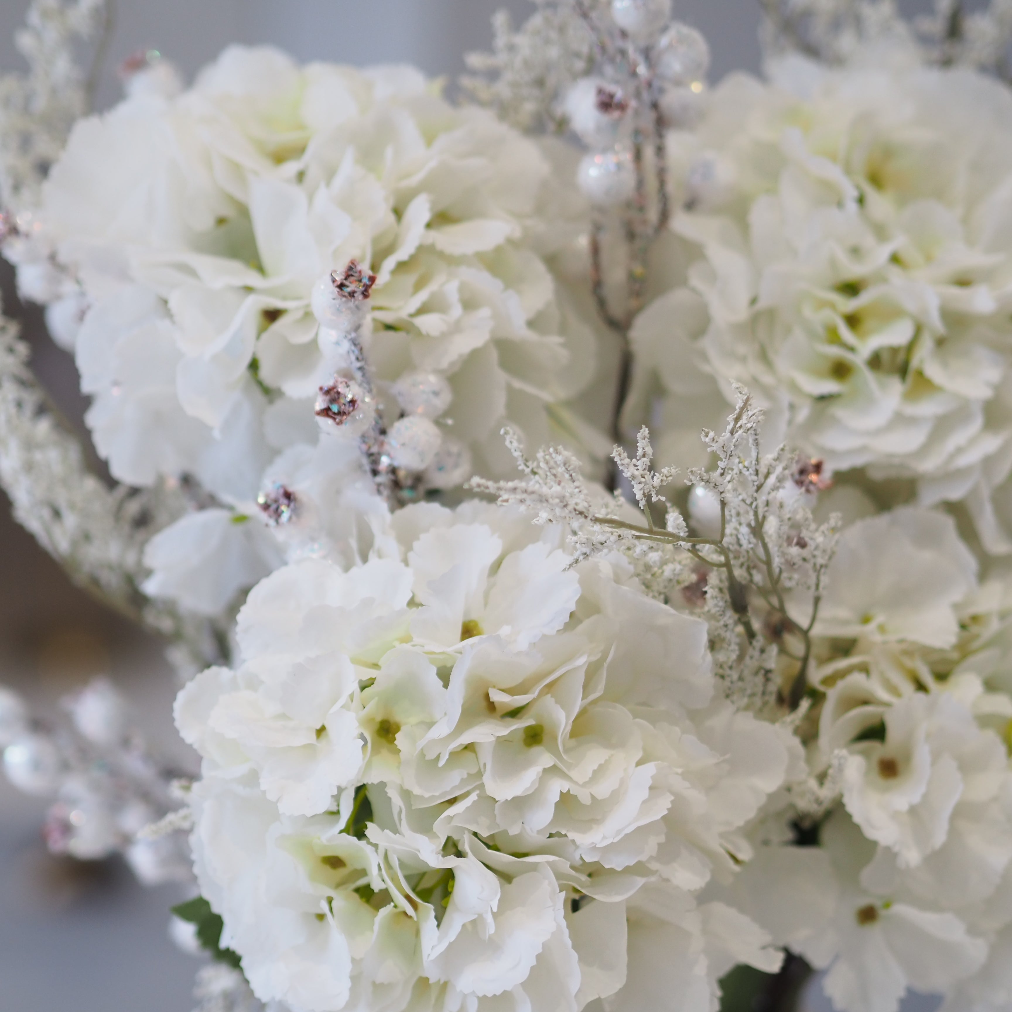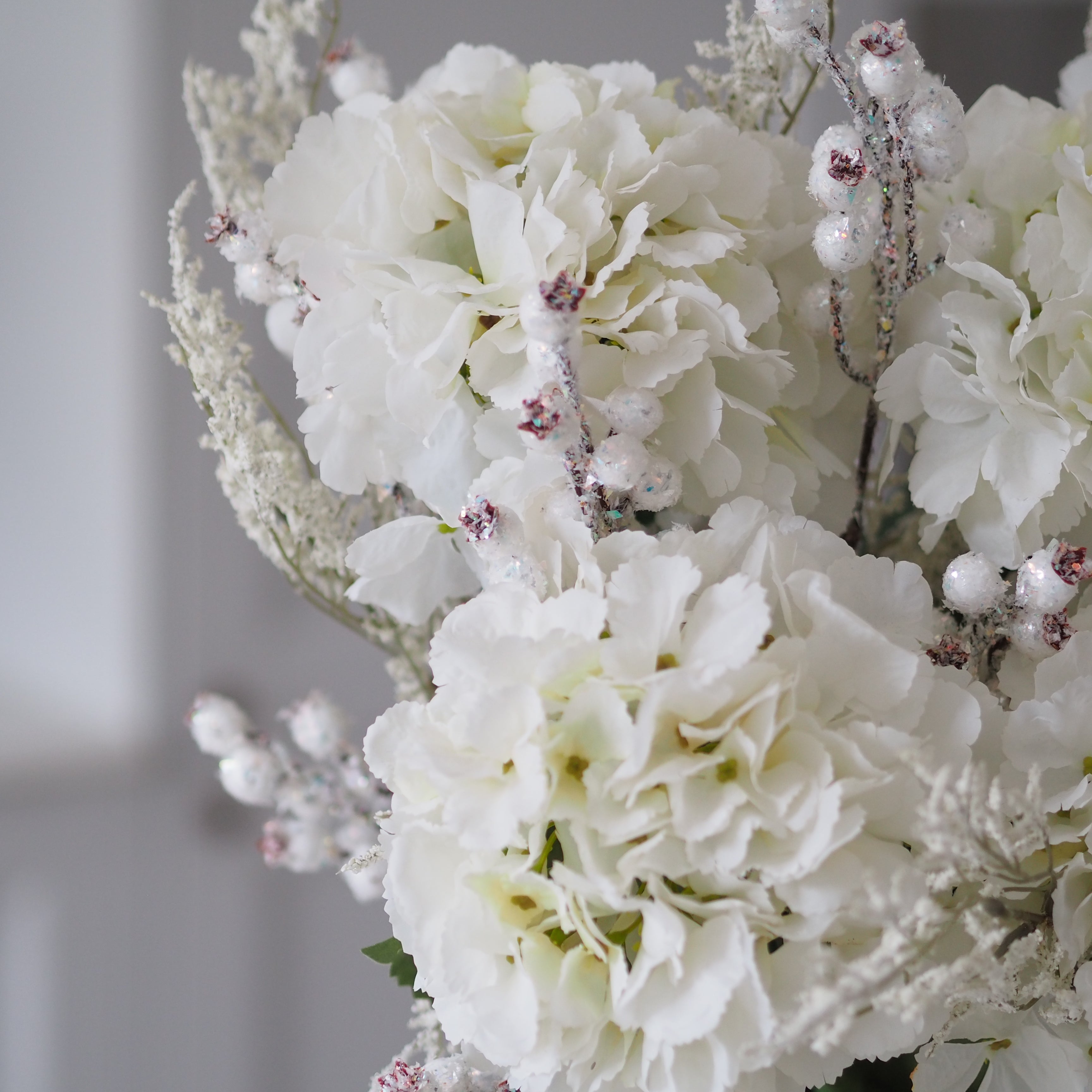 Dale un toque mágico a tu hogar esta temporada con nuestro ramo Blanco Invierno. Una combinación de hermosos tonos neutros, este ramo está repleto de flores con textura y adornado con tallos festivos.