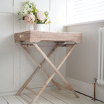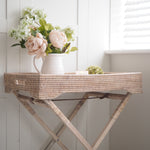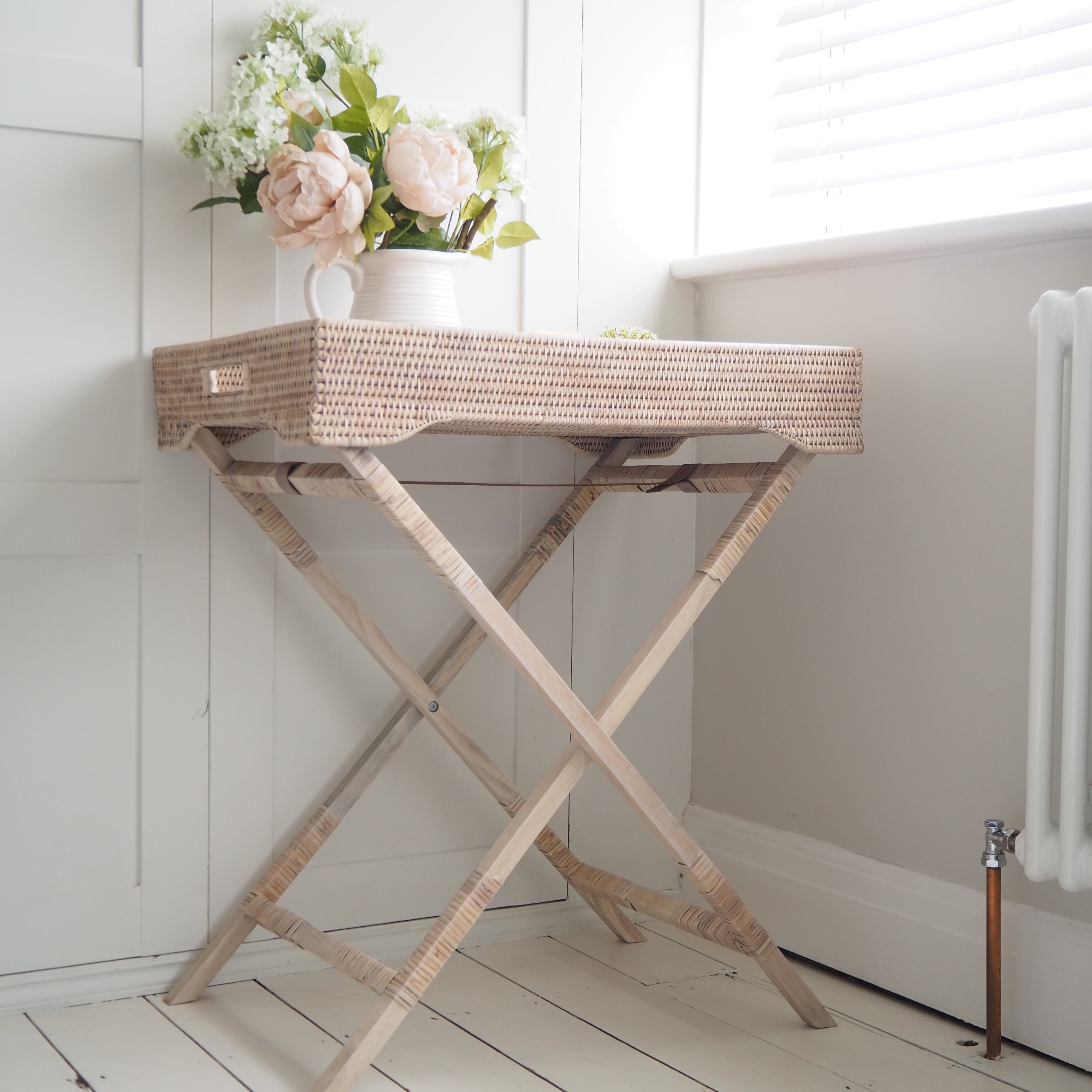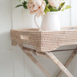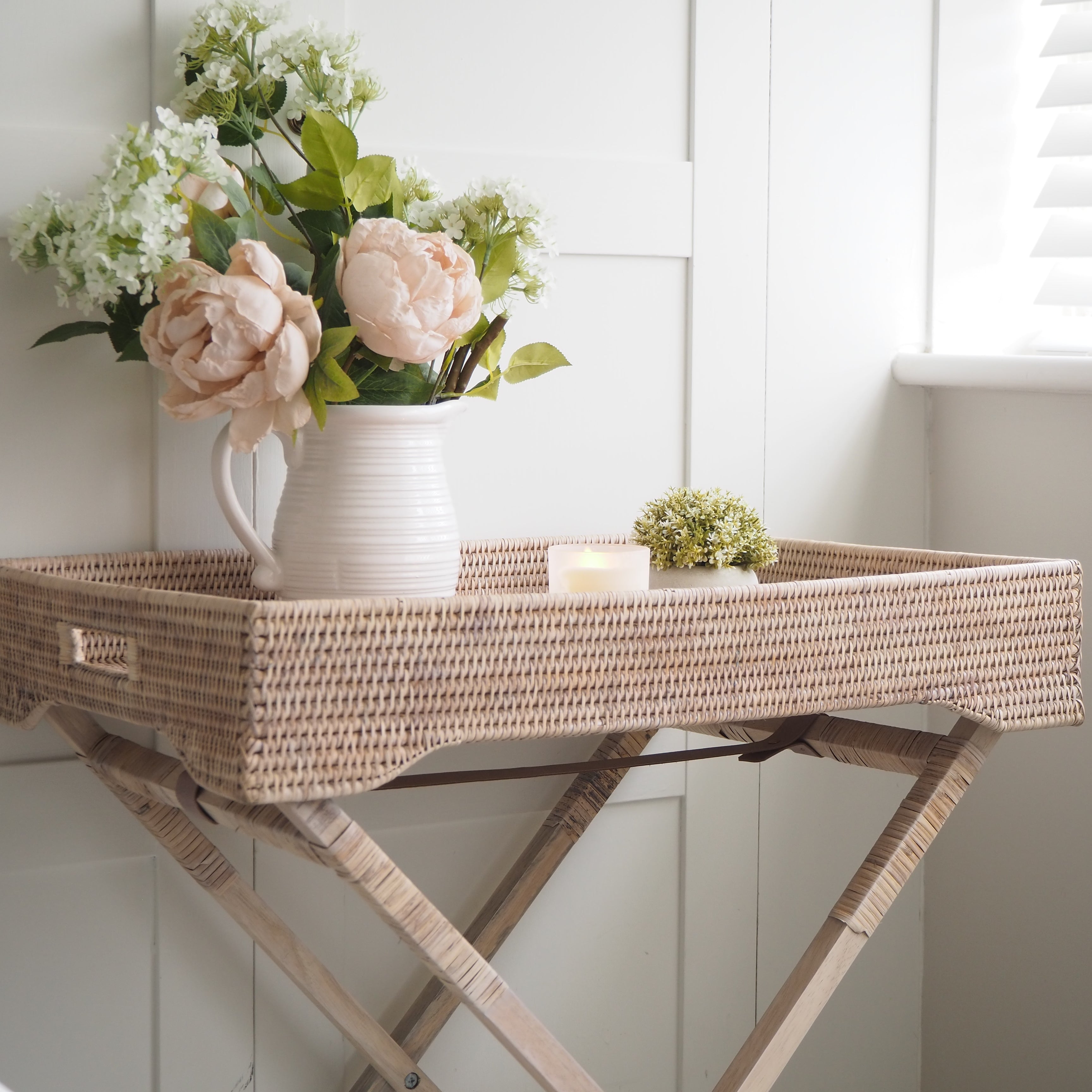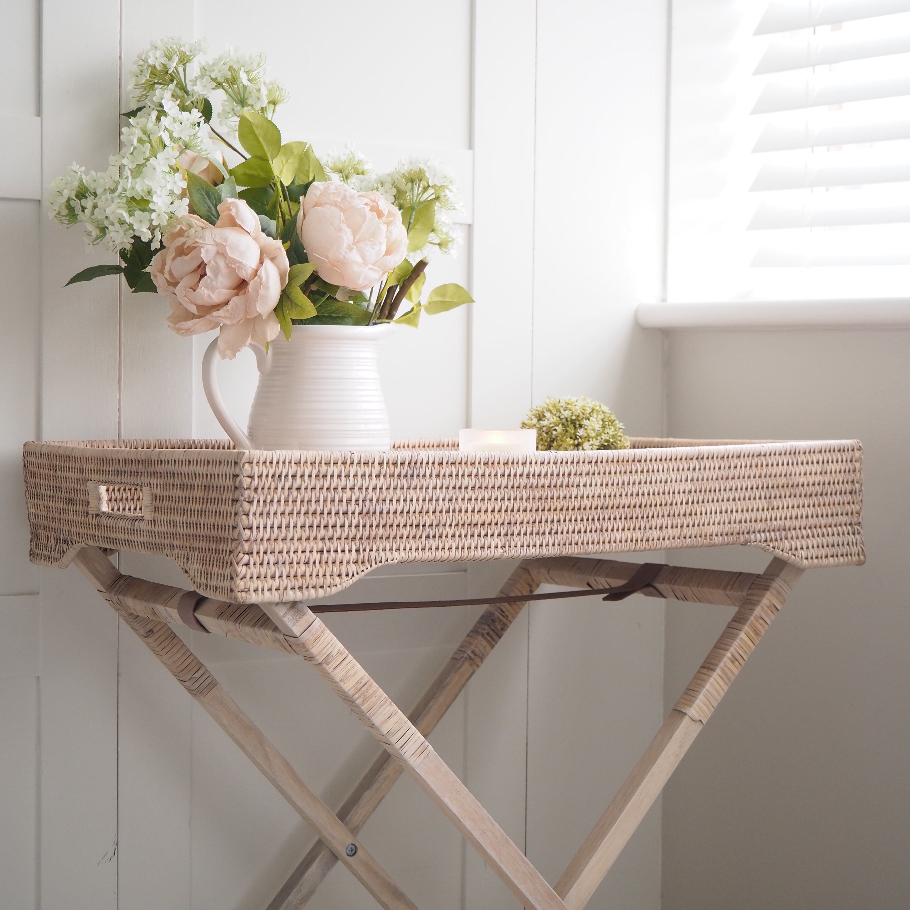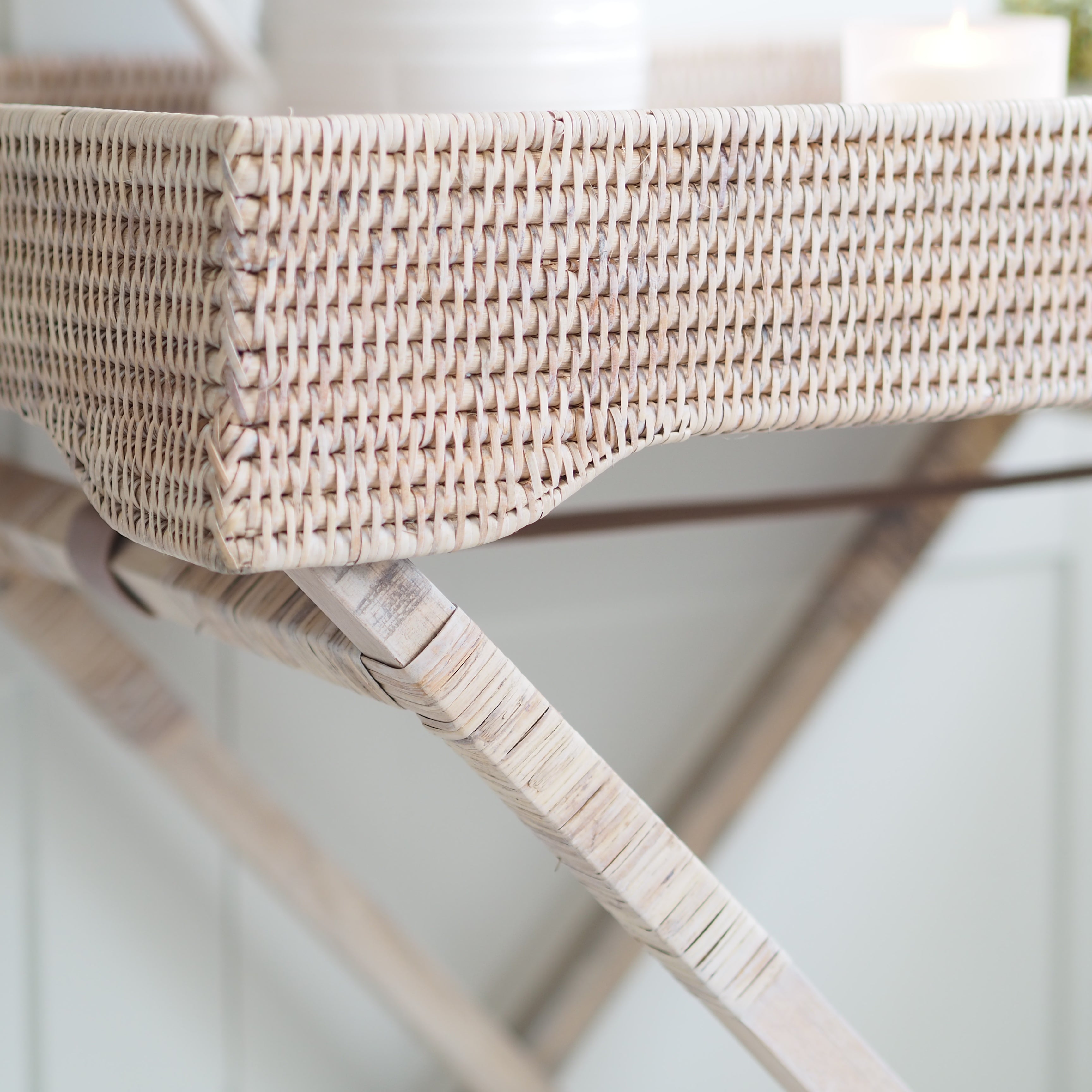 Nuestra bandeja de mayordomo de ratán es un complemento versátil para cualquier hogar, ya que funciona tanto como mesa auxiliar como bandeja. Hecha de un hermoso ratán blanqueado de inspiración costera, cuenta con prácticas asas a ambos lados. Nos encanta usarla para servir bebidas y aperitivos a nuestros invitados, tanto en interiores como en exteriores. La bandeja es totalmente desmontable de las patas blanqueadas, lo que facilita su manejo para rellenarla, y se pliega con la correa de cuero color canela para un acabado lujoso.