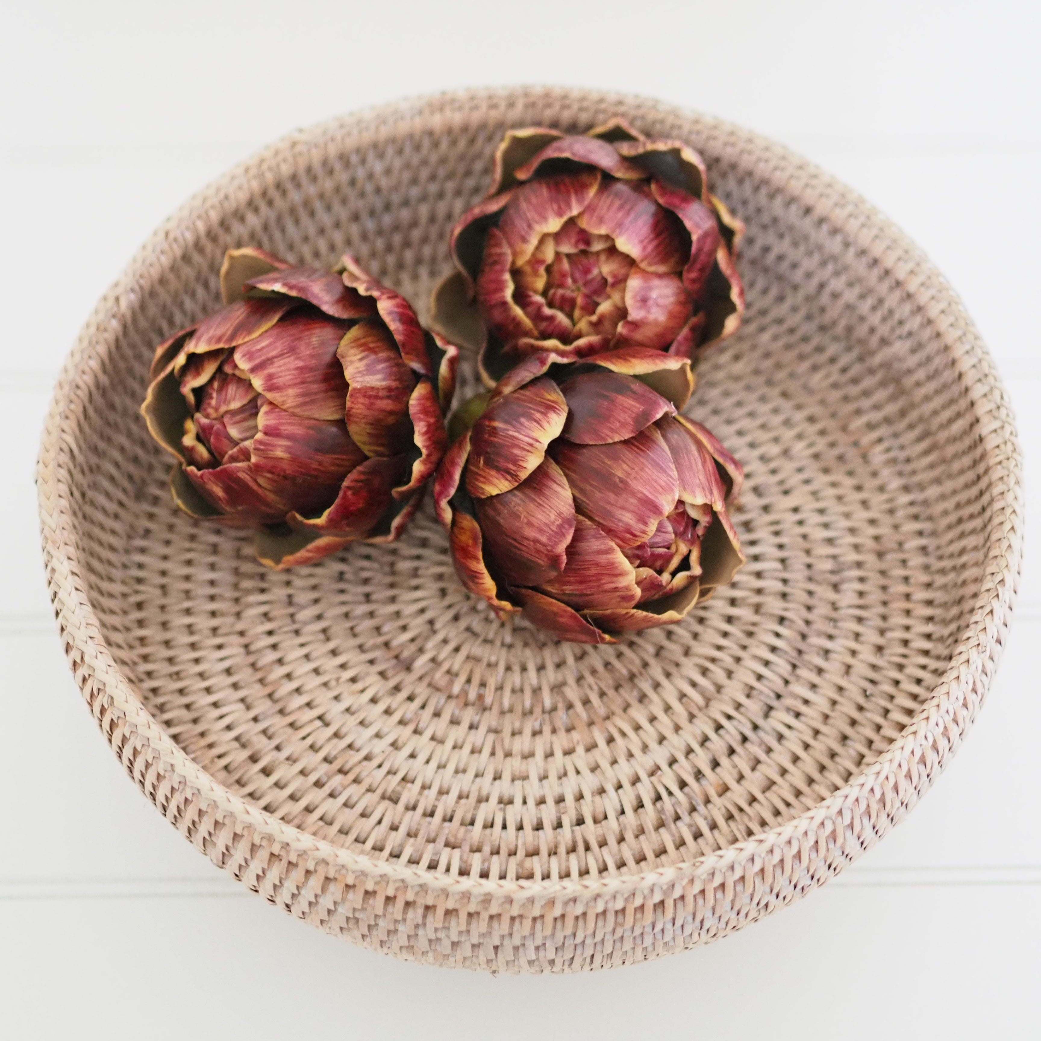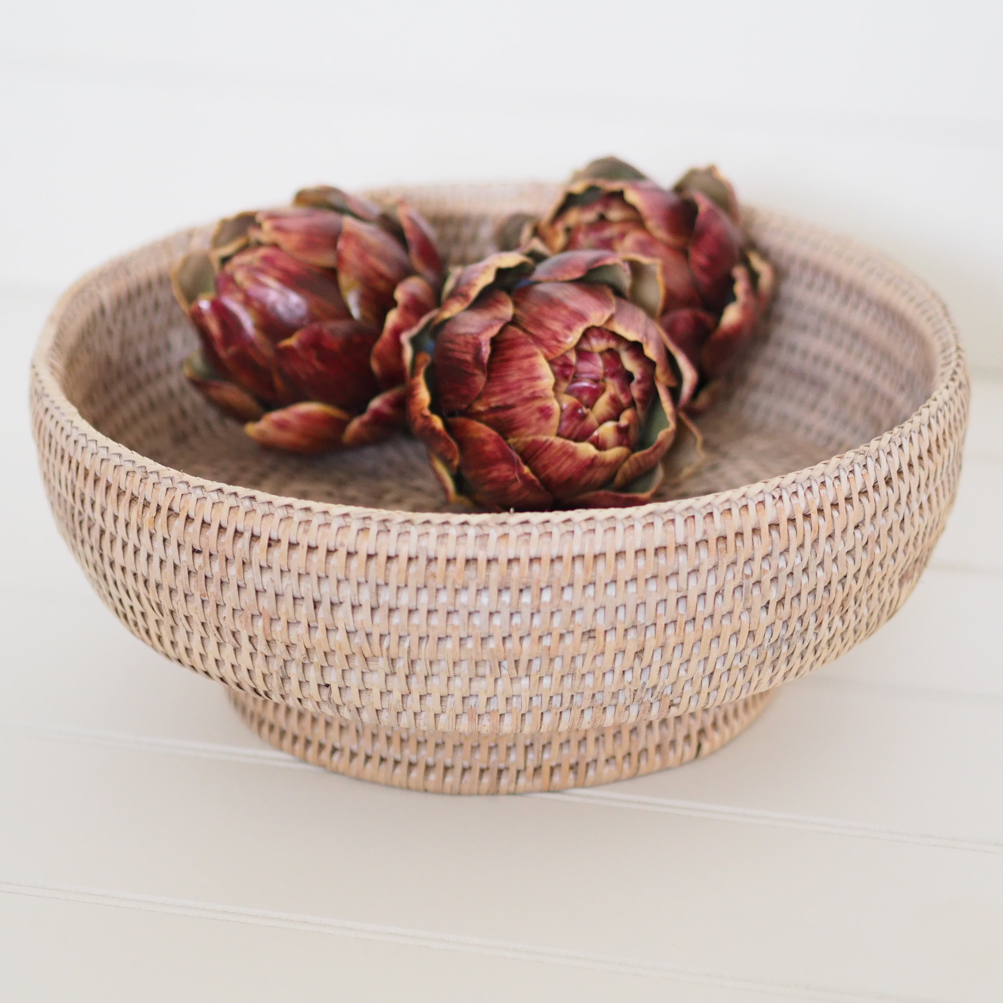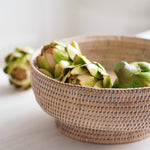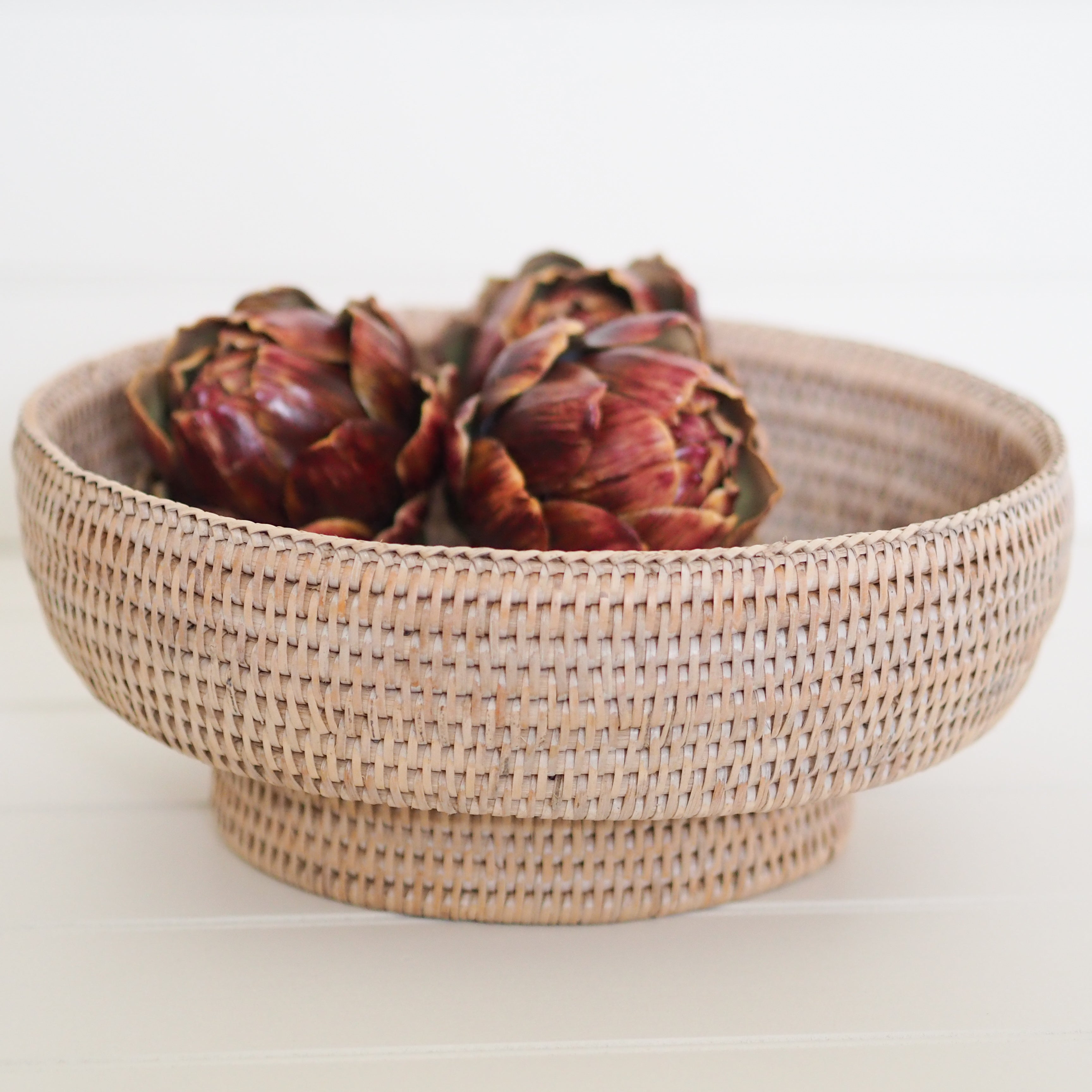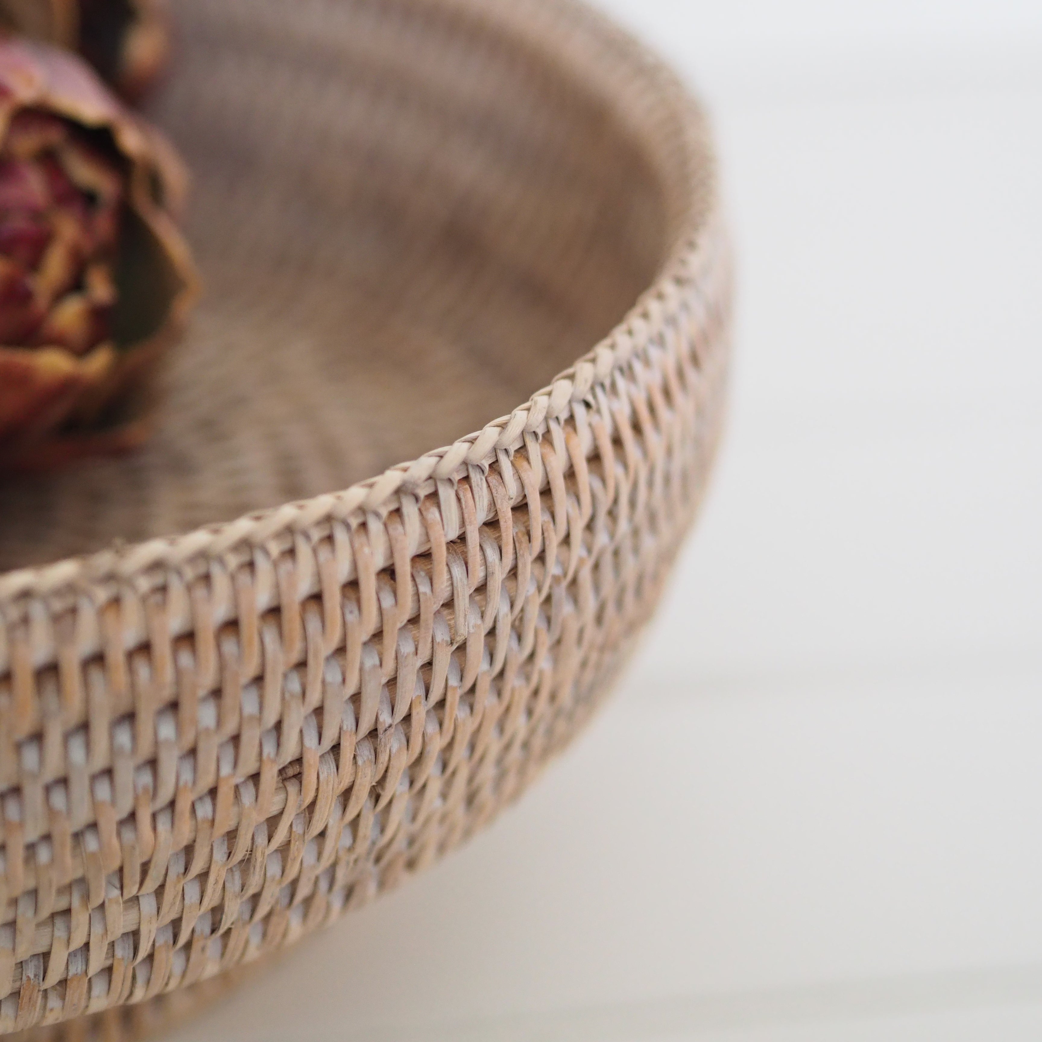 Este cuenco hecho a mano está elaborado con ratán de alta calidad y acabado en laca natural para proteger los intrincados detalles del tejido.
