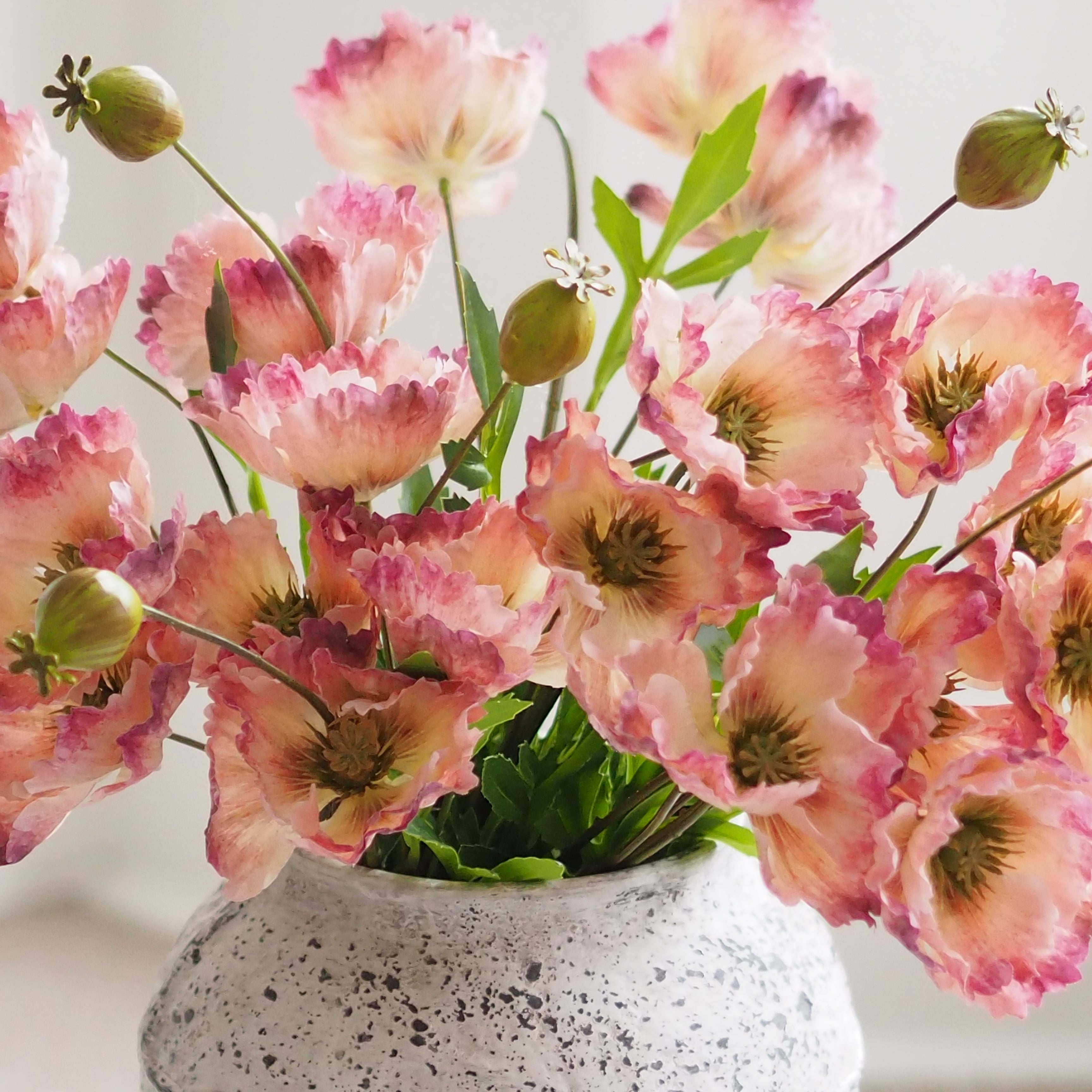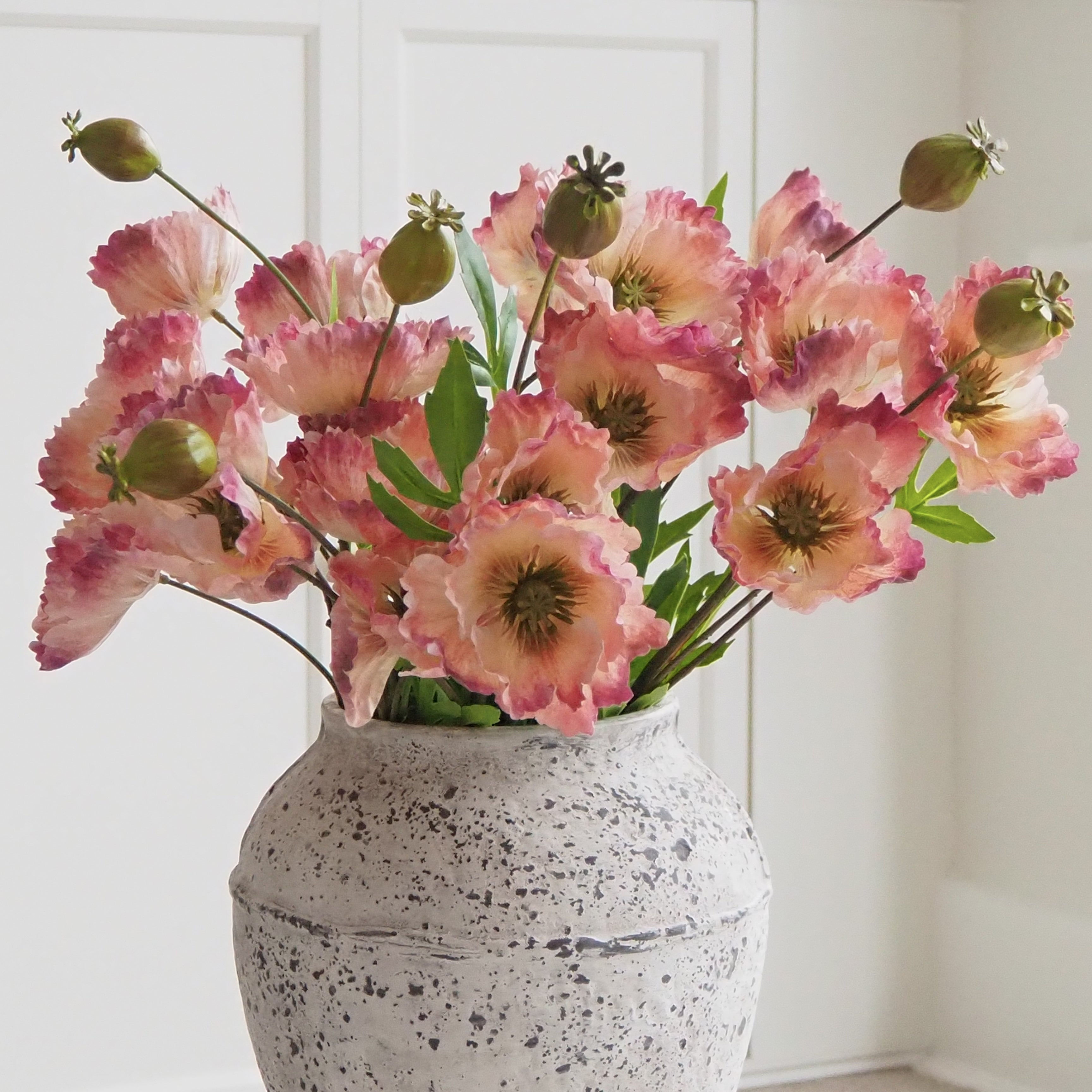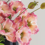 Una magnífica adición a nuestra colección de tallos artificiales, estos preciosos tallos de amapola con volantes son perfectos para crear un arreglo floral espectacular en tu hogar. Las cabezas de las flores están adornadas con pétalos y hojas con un hermoso detalle en un tono rosa degradado. Colócalas en tu jarrón favorito en varias unidades para una presentación espectacular.