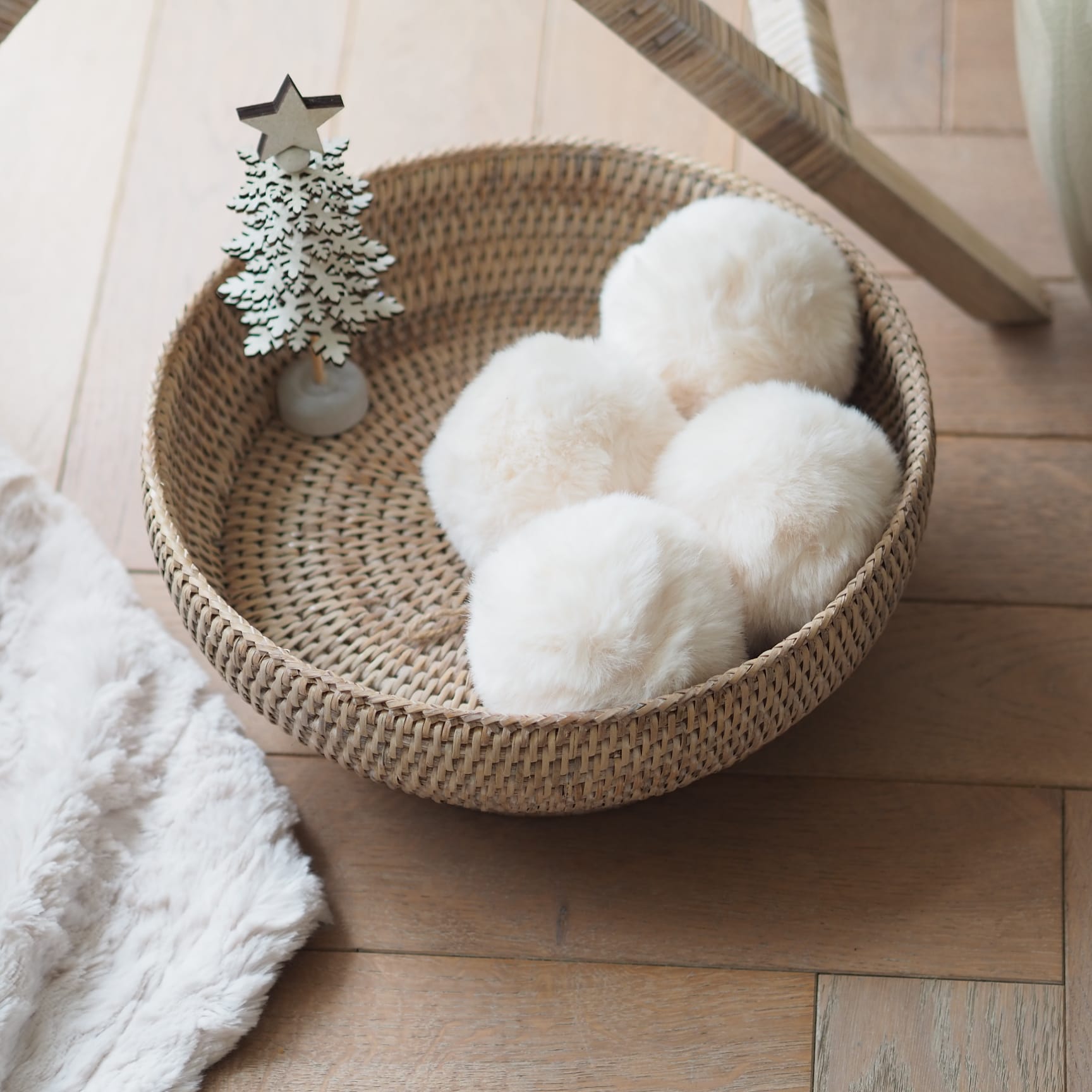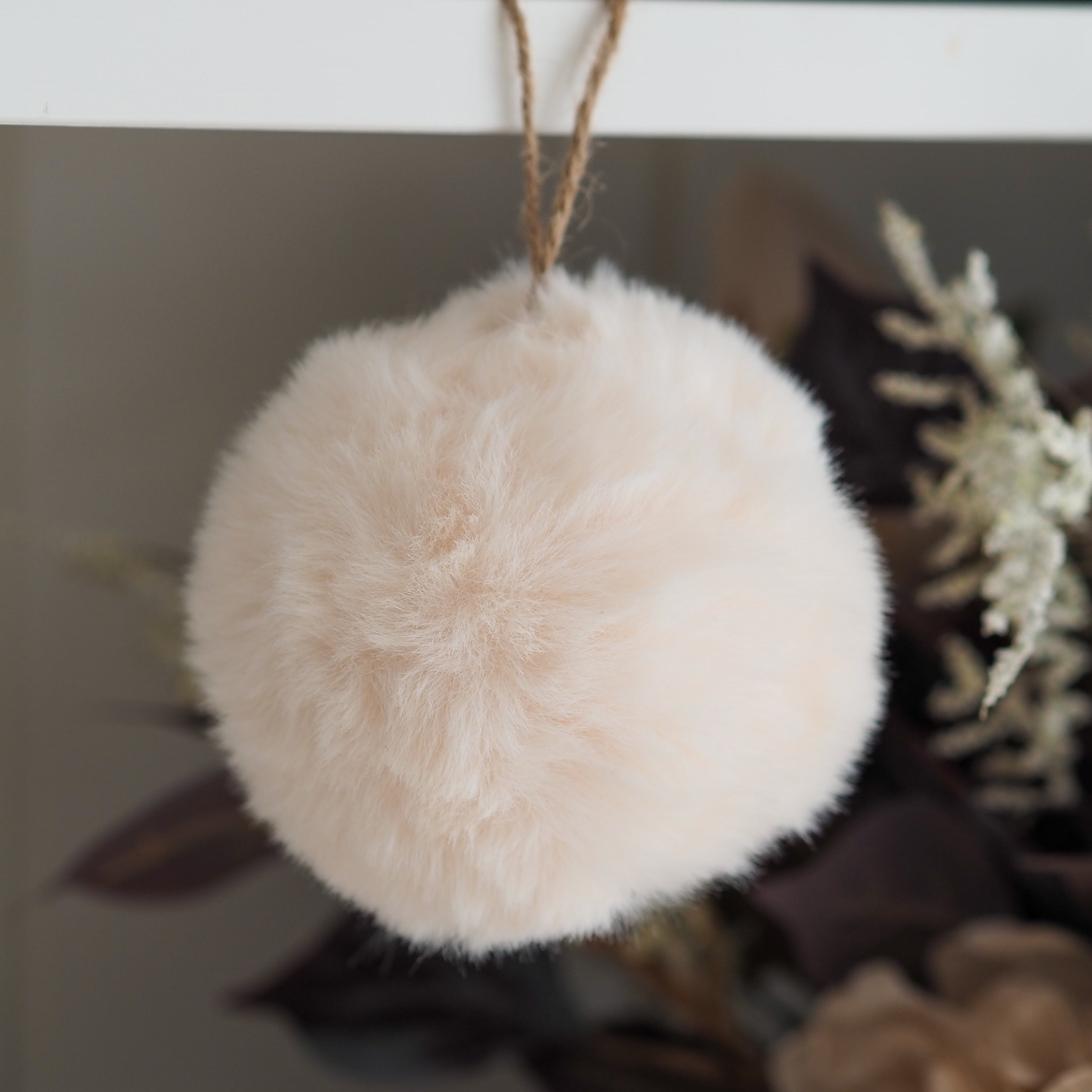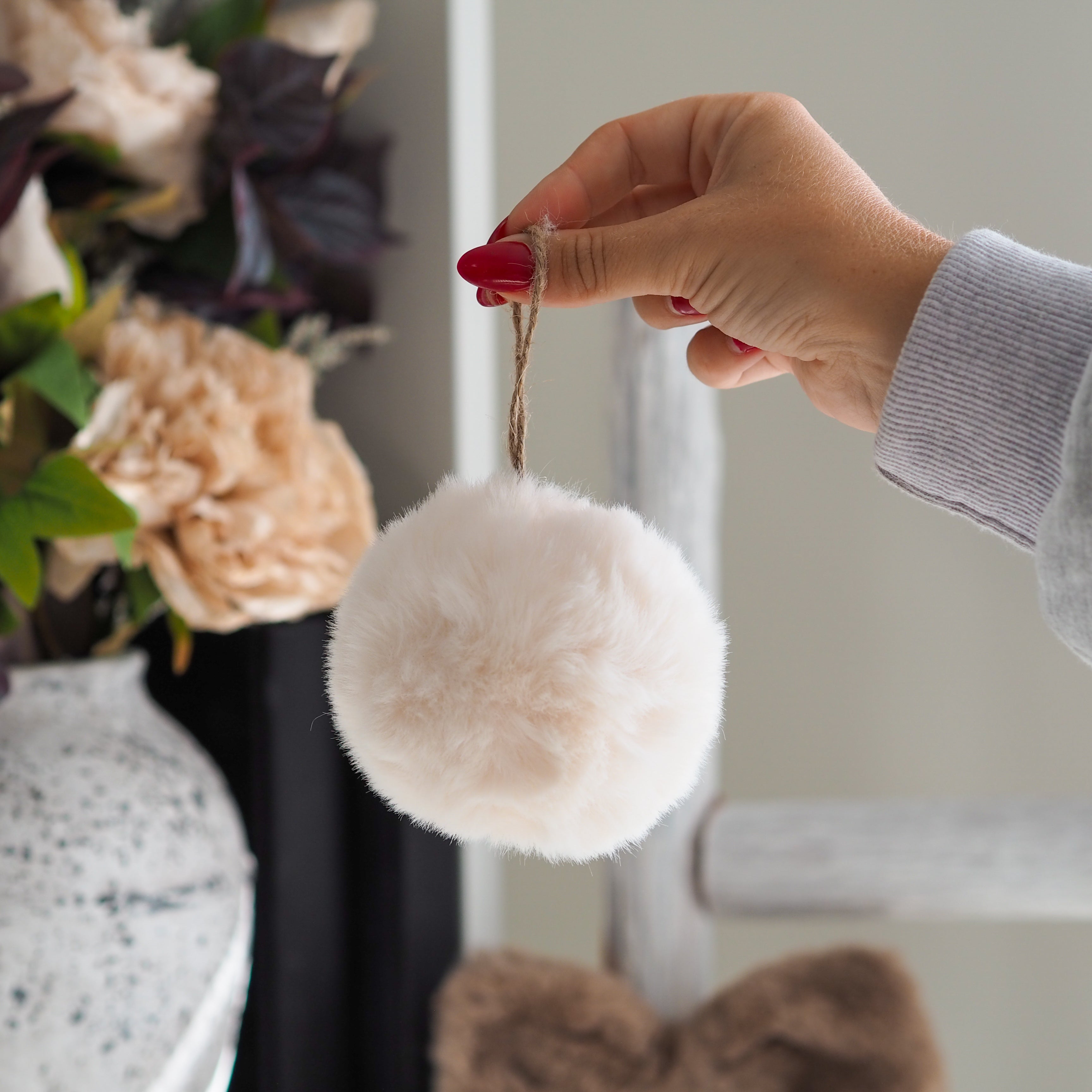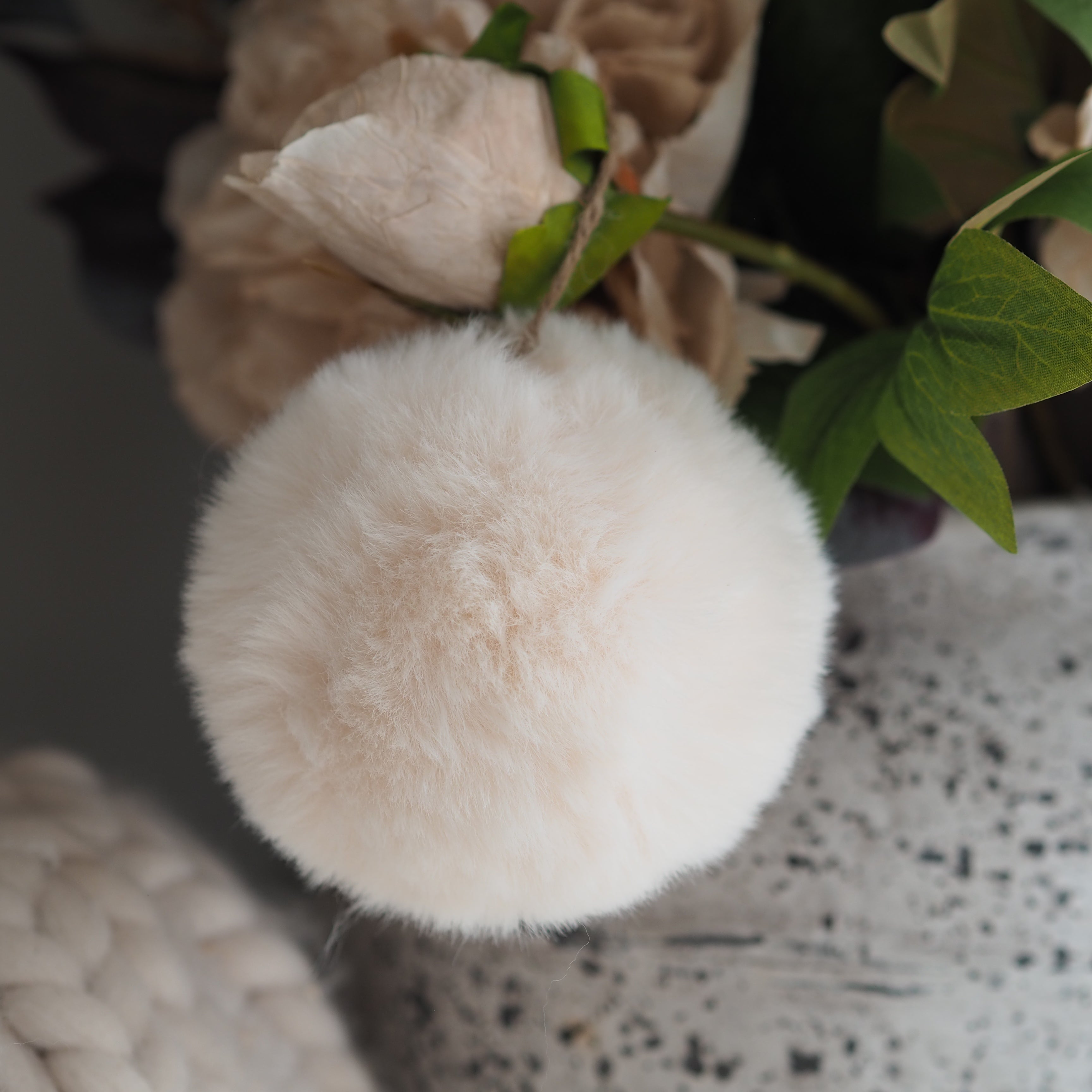 Add a touch of luxe to your home decor this Autumn/Winter with our decorative hanging beige pom pom hanging decorations. These beautiful pom pom balls are super soft touch in a decadent faux rabbit fur, with a hand tied twine hanging. The perfect addition to your shelf styling, door handles or even hung upon trees and garlands for seasonal display.