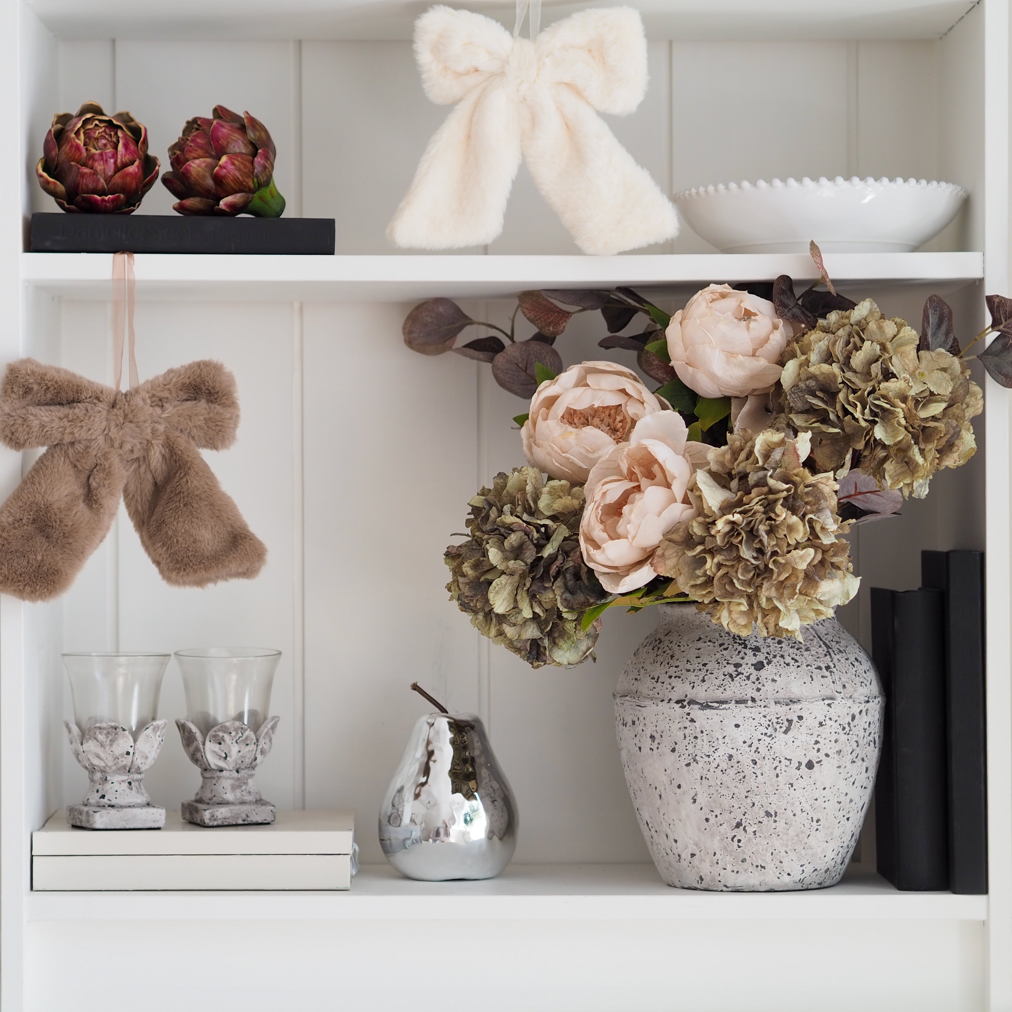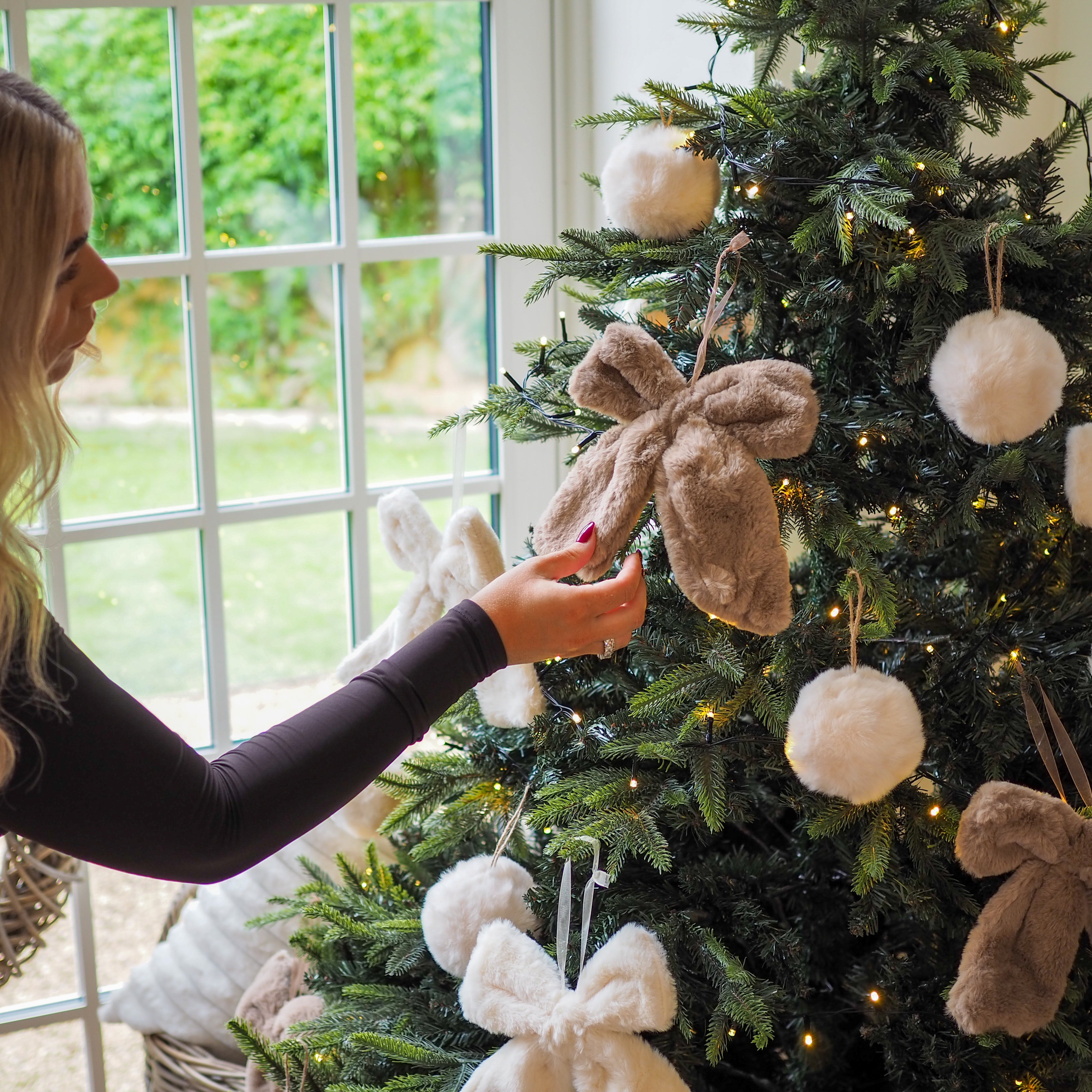 Add a touch of luxe to your home decor this Autumn/Winter with our decorative hanging fur bows. These beautiful bows are super soft touch in a decadent faux rabbit fur. The perfect addition to your shelf styling, door handles or even hung upon trees and garlands for seasonal display.