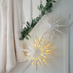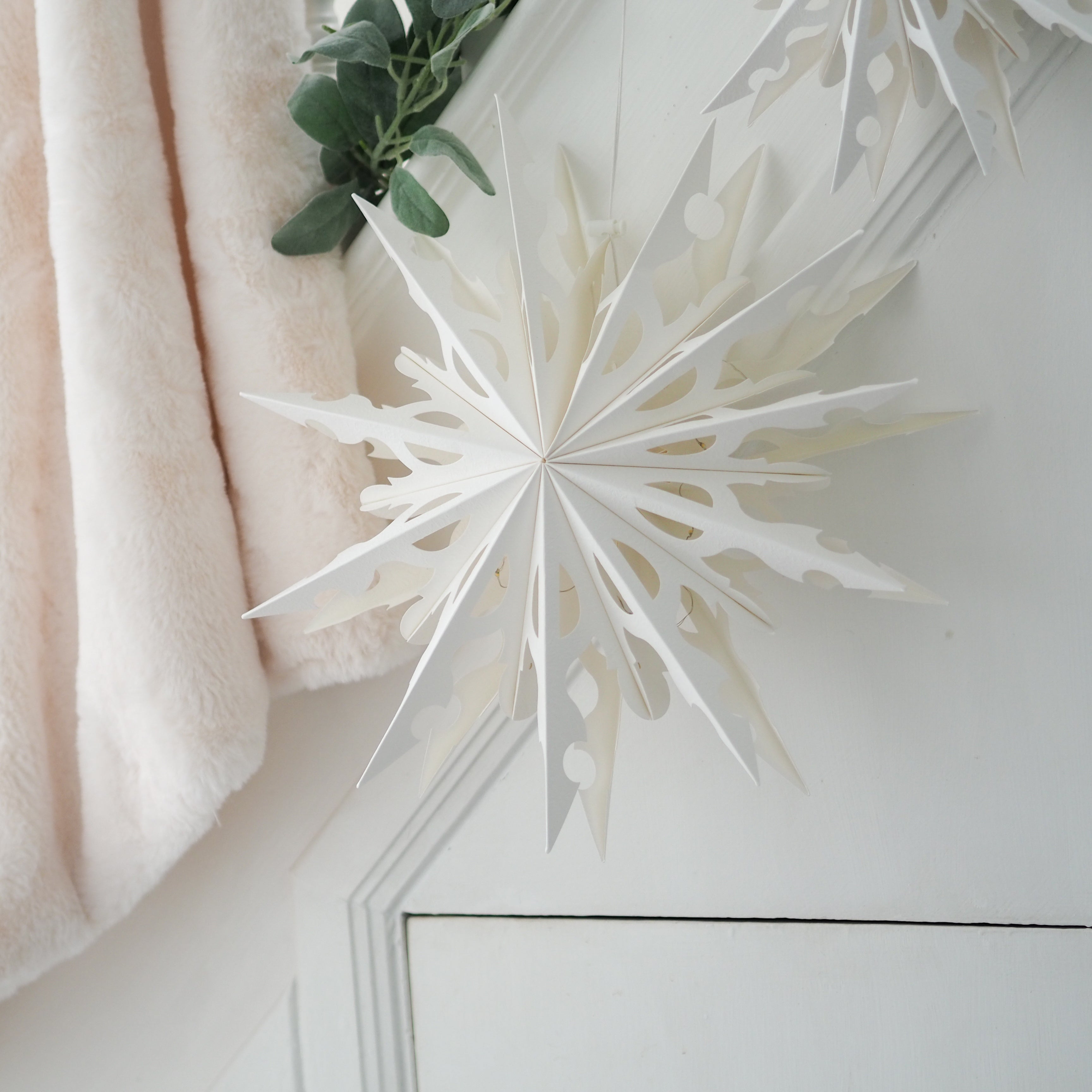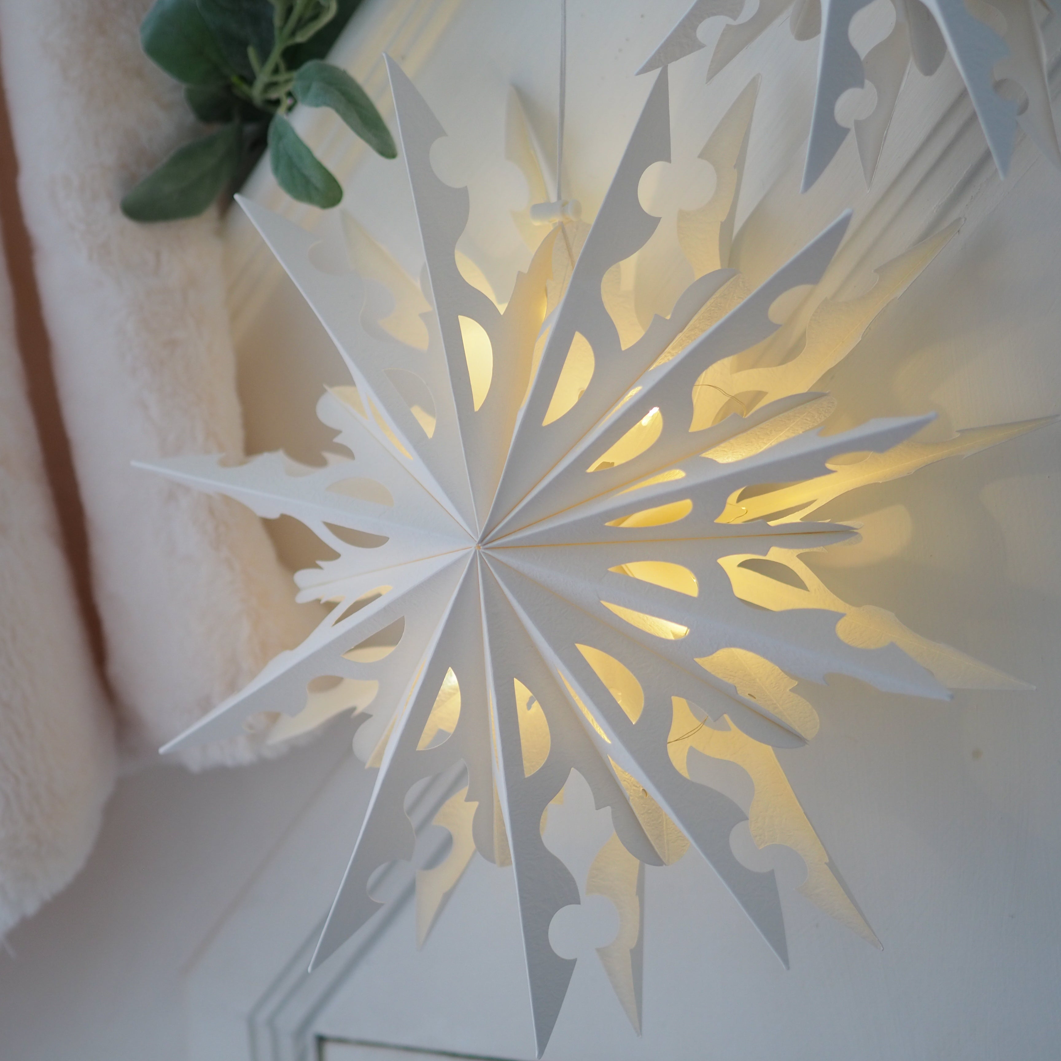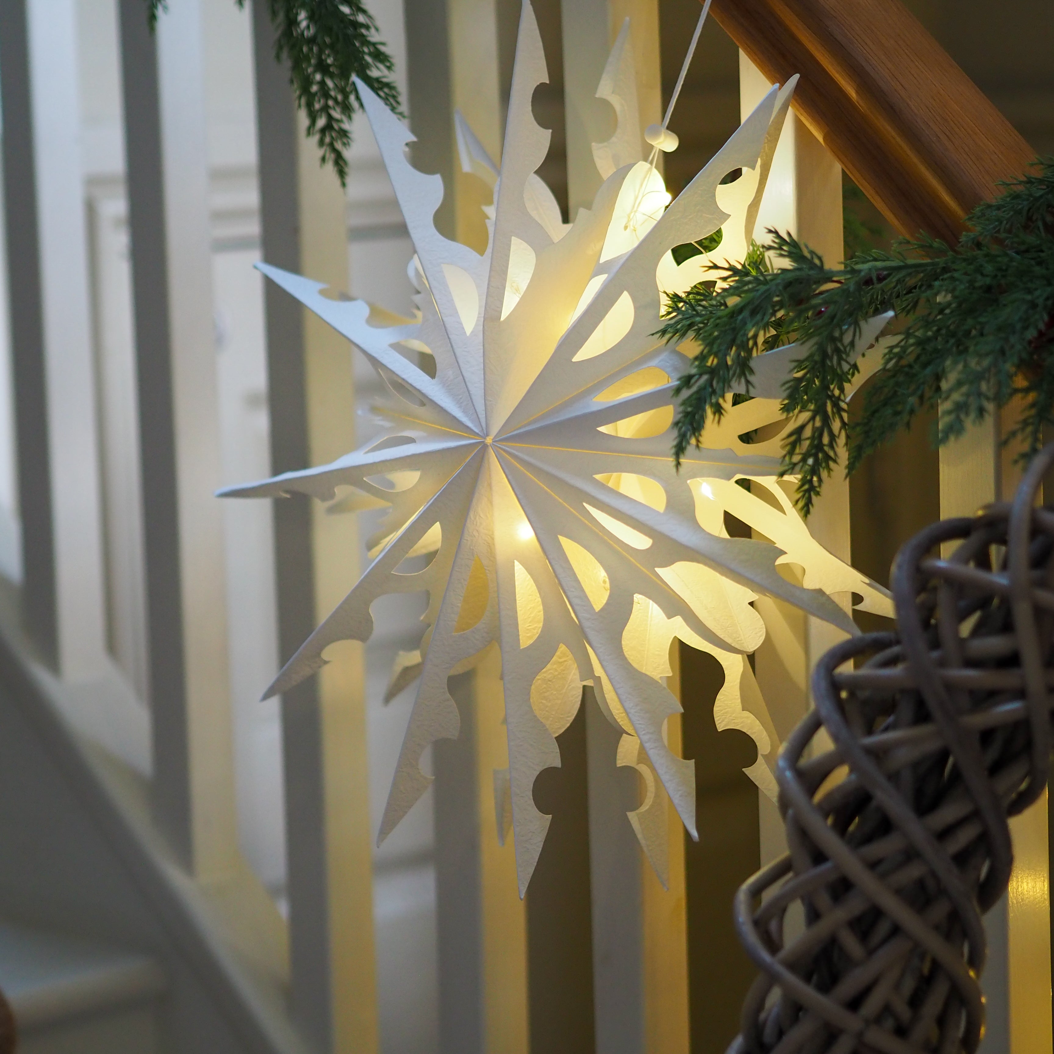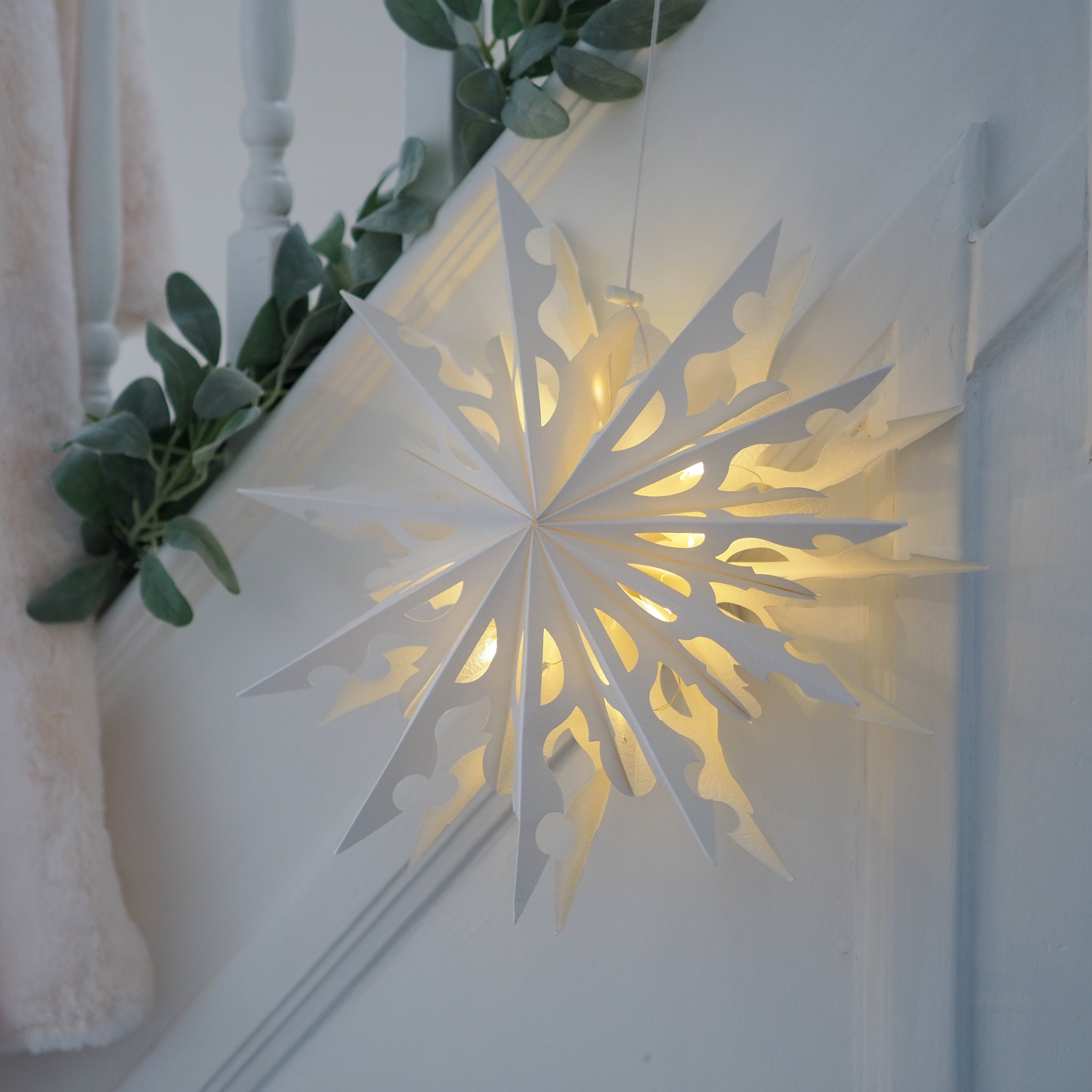 Invitez la magie de Noël chez vous avec cette magnifique décoration en papier en forme de flocon de neige. Ornée de détails découpés et de lumières LED, cette suspension surdimensionnée apportera une touche d'ambiance à n'importe quelle pièce de votre maison. Suspendez-la à une rampe d'escalier, à un mur ou au-dessus de votre table à manger pour une touche de magie.