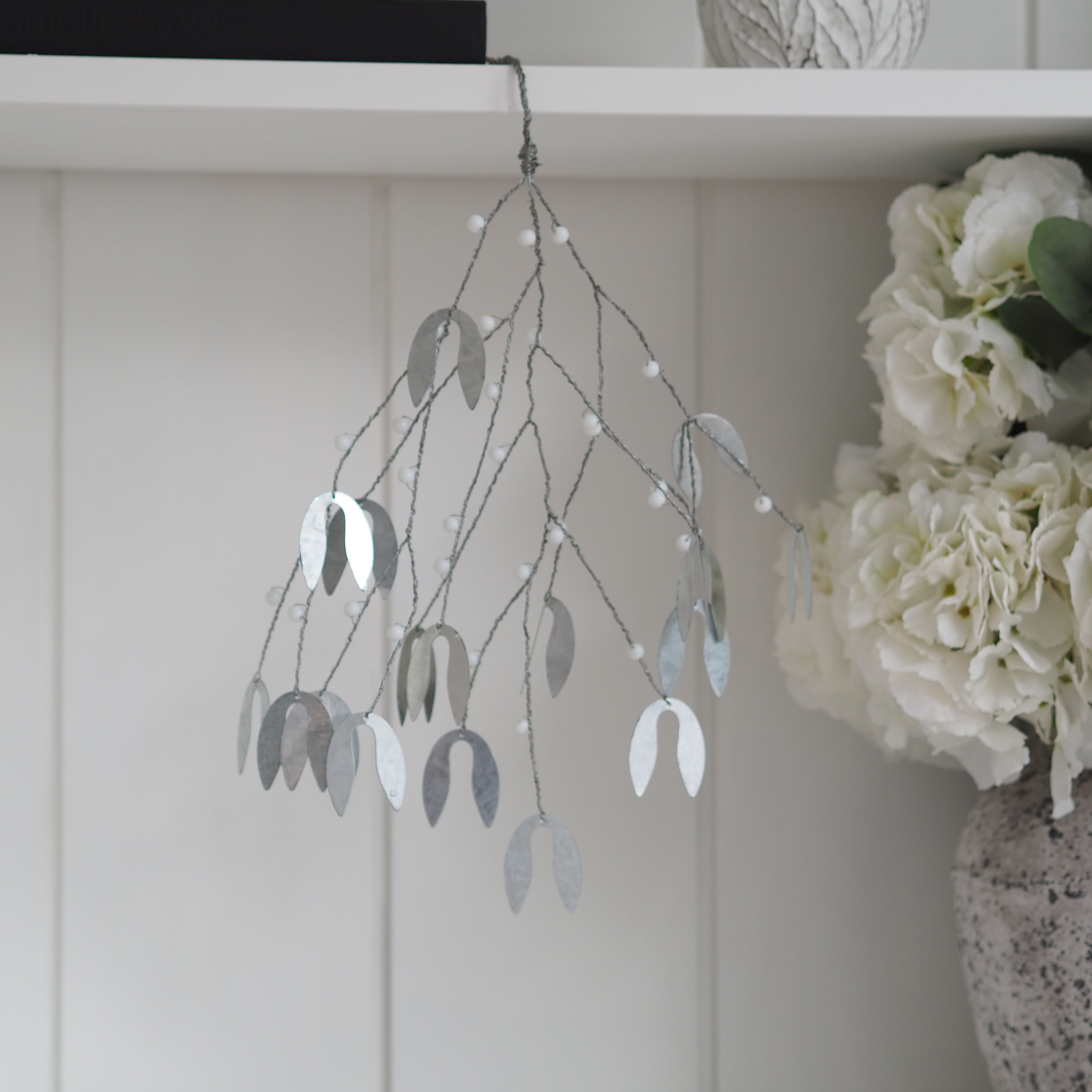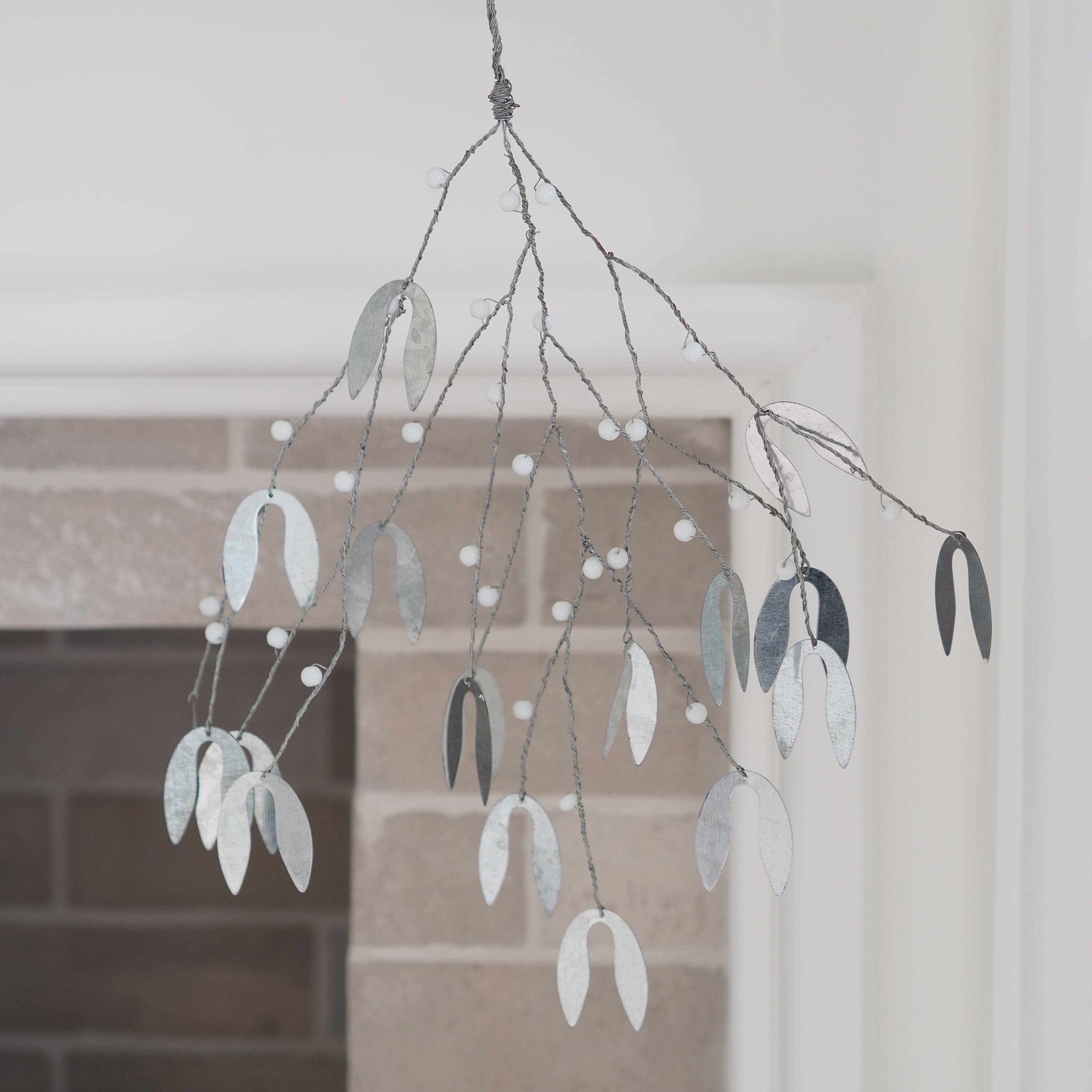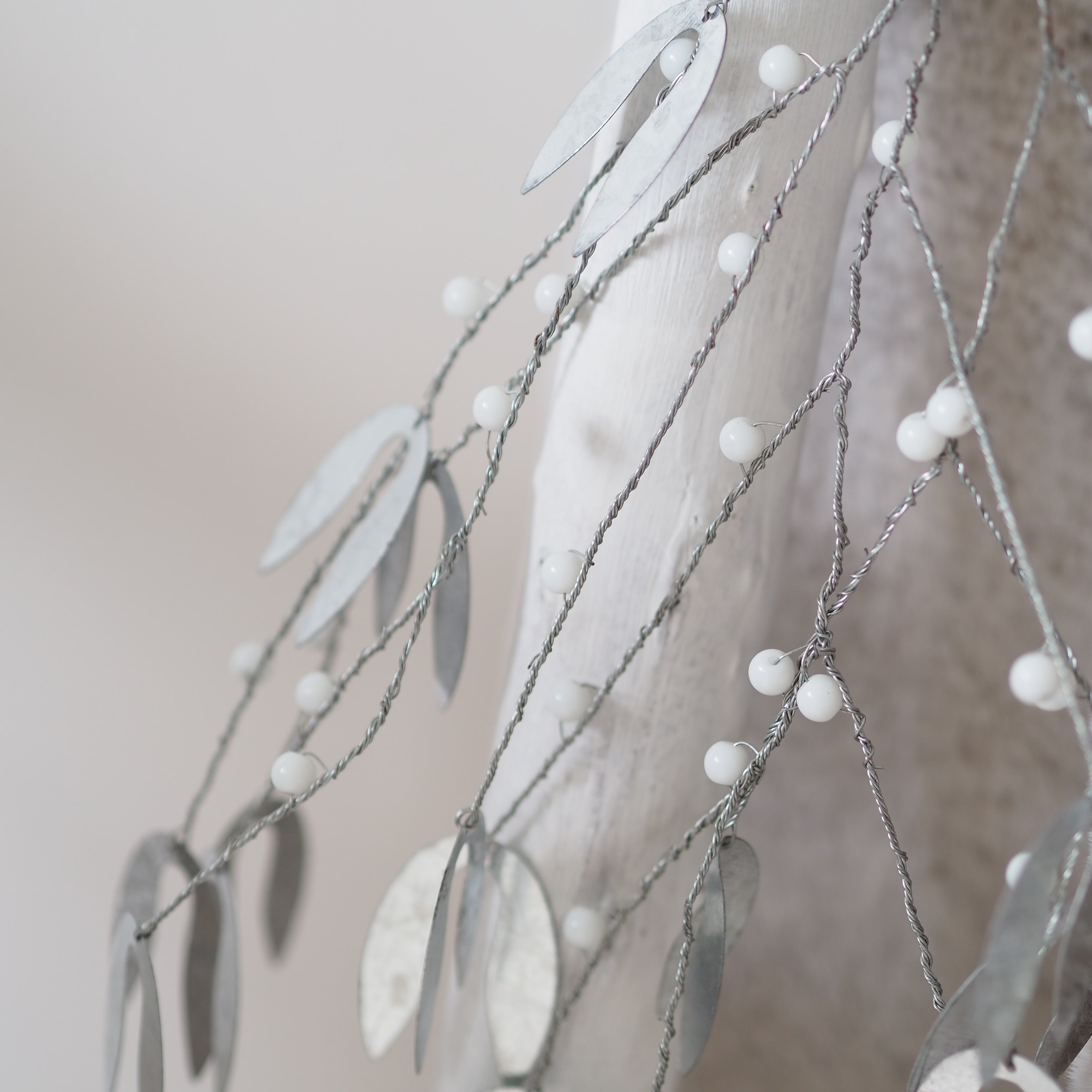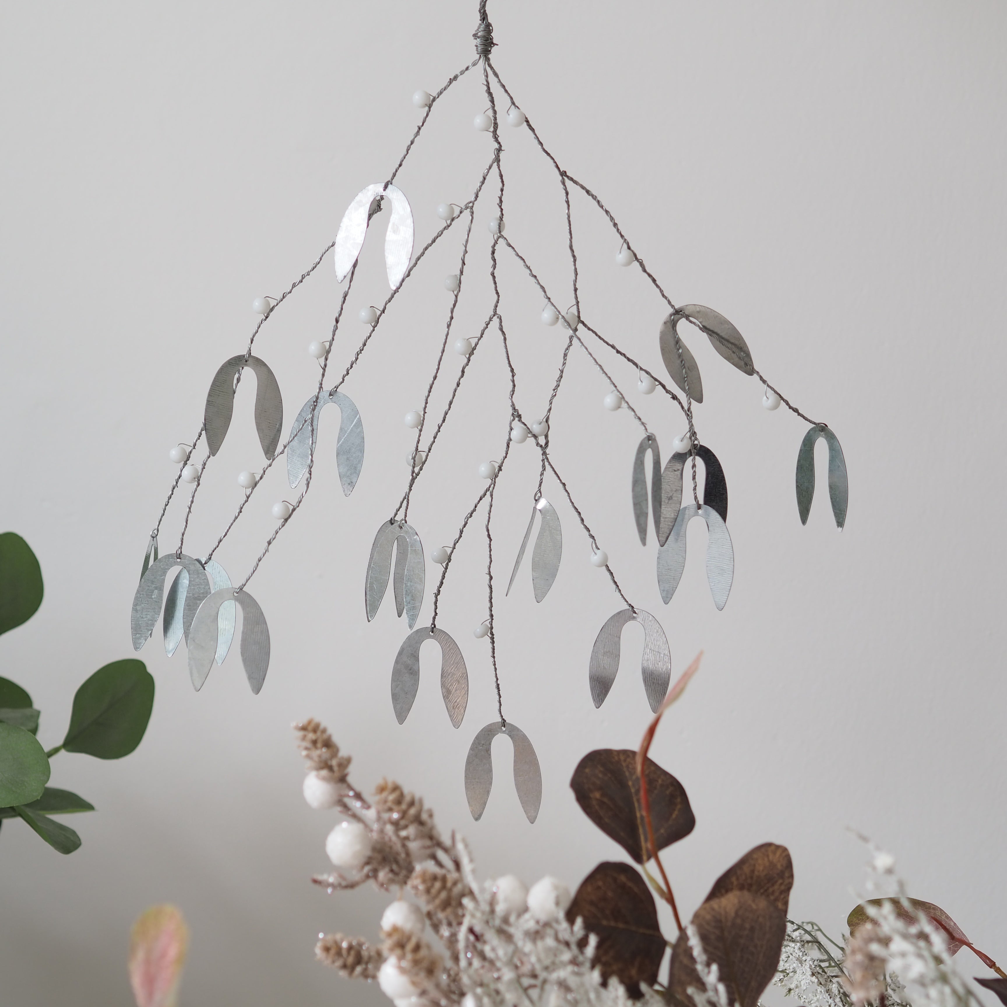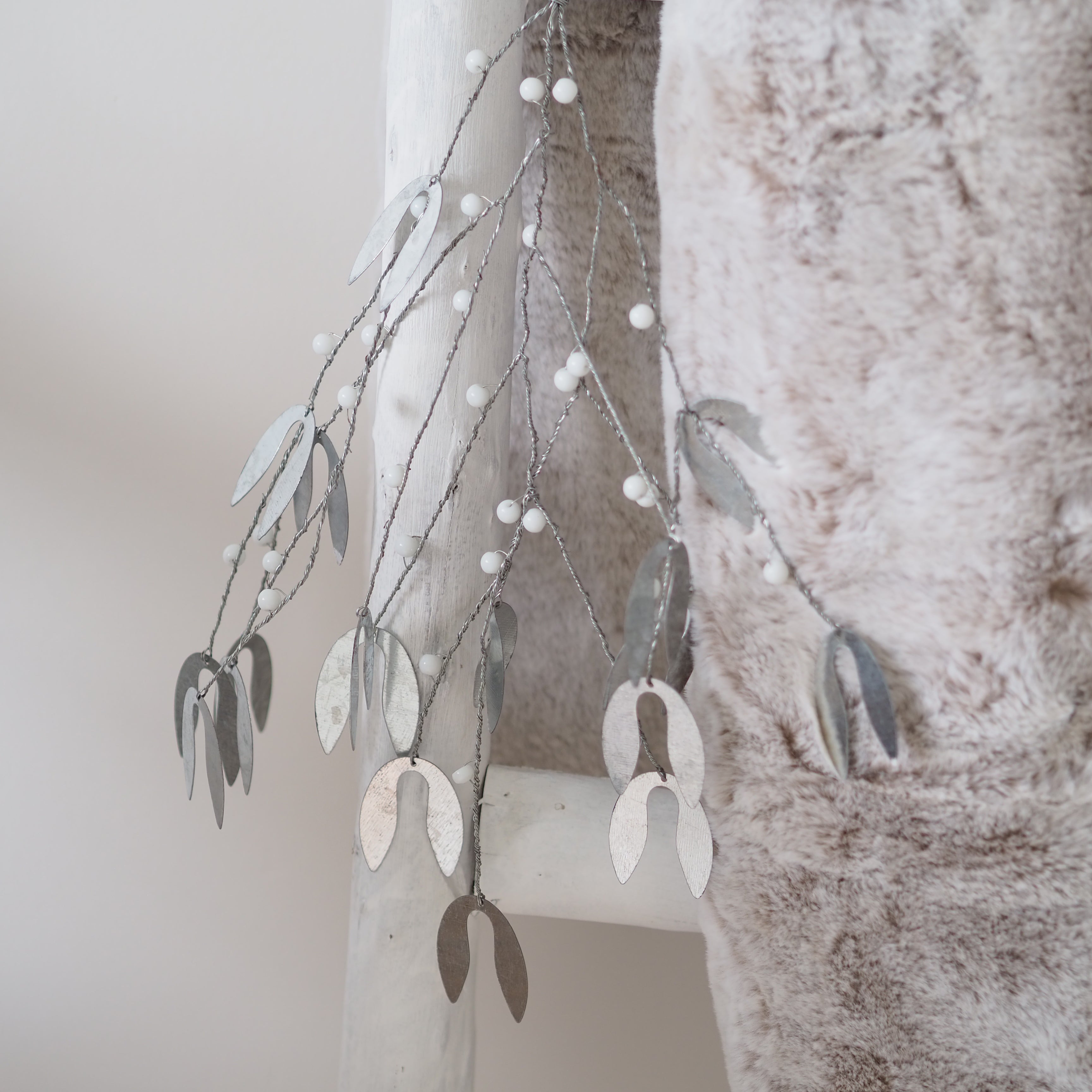 Complétez votre décoration de Noël avec cet élégant bouquet de gui, délicatement réalisé en métal argenté et orné de perles, parfait pour ajouter une touche chic à votre décoration de Noël. Il sera superbe accroché au-dessus de votre table de fête, sur une étagère ou en décoration murale.