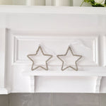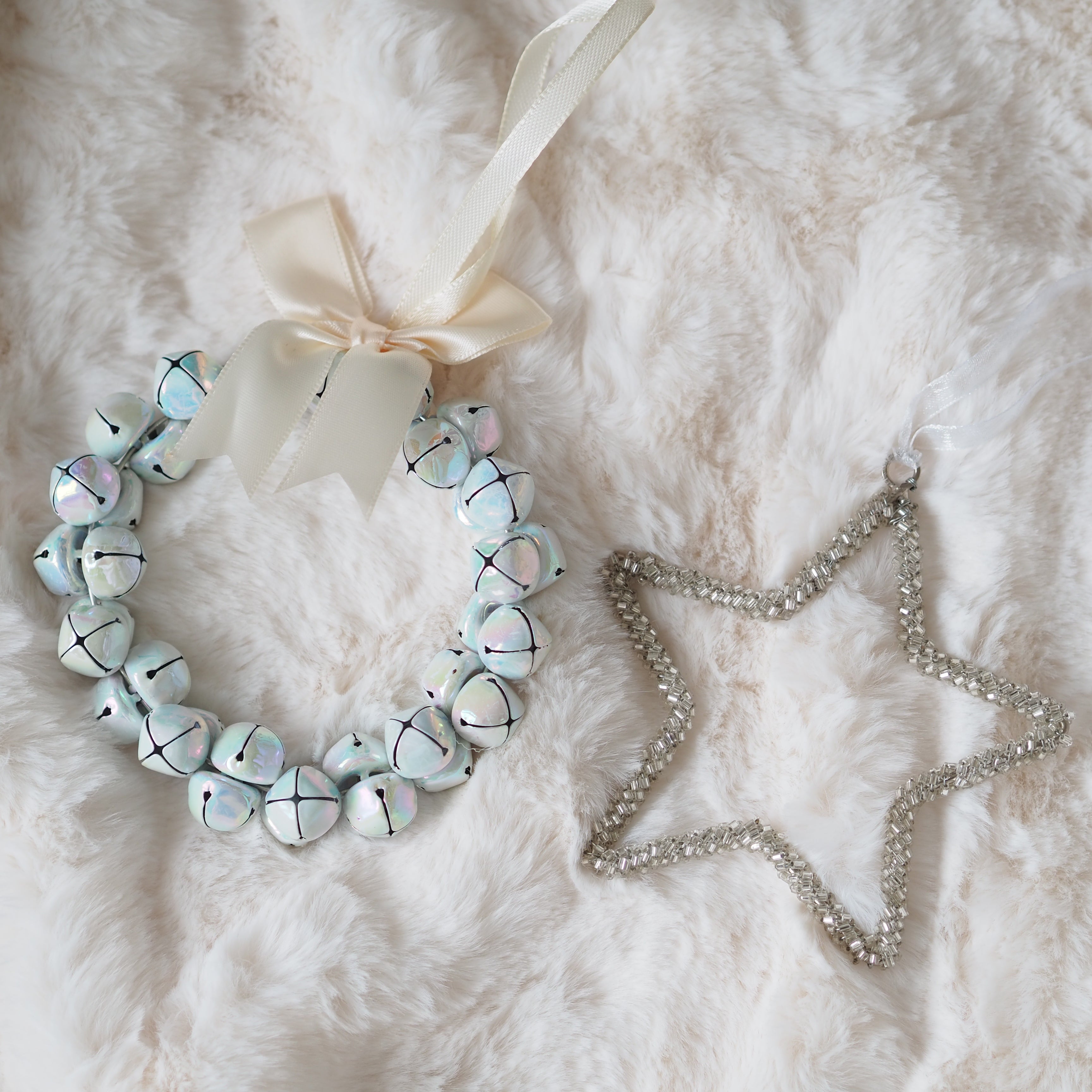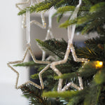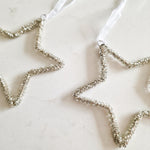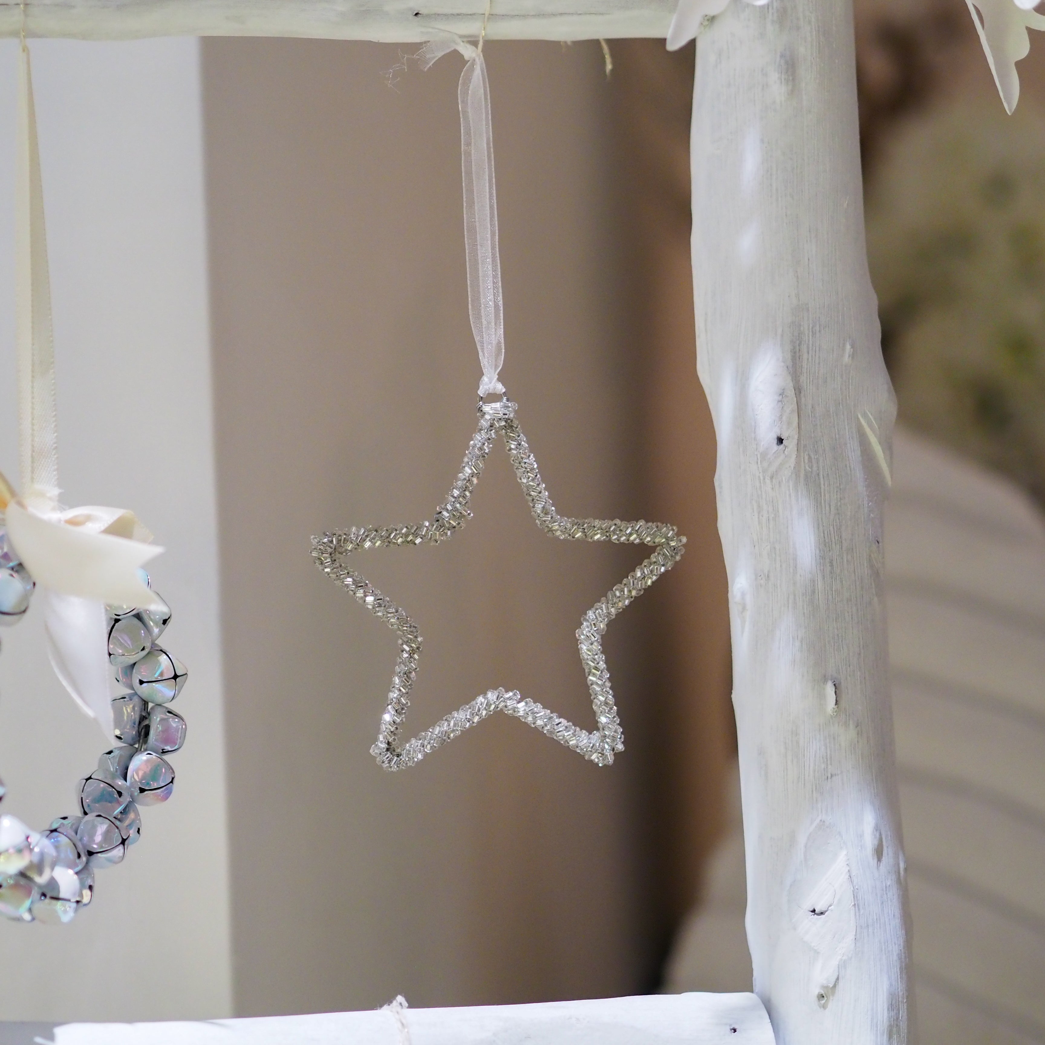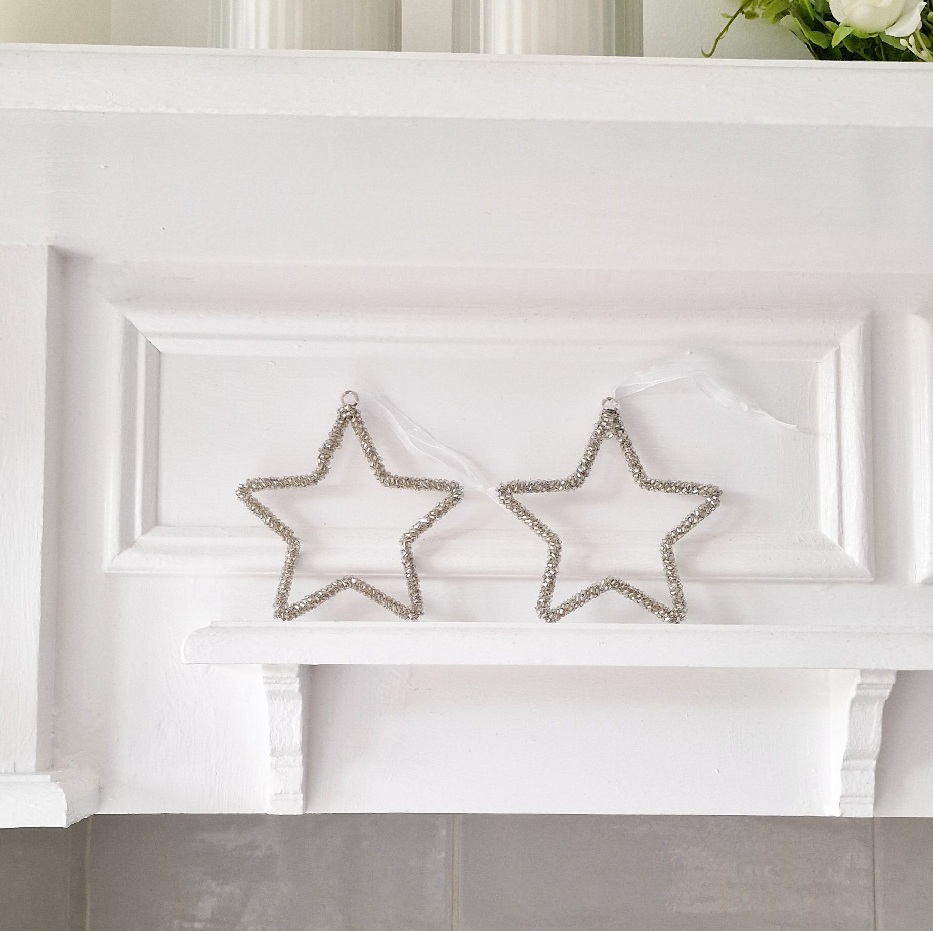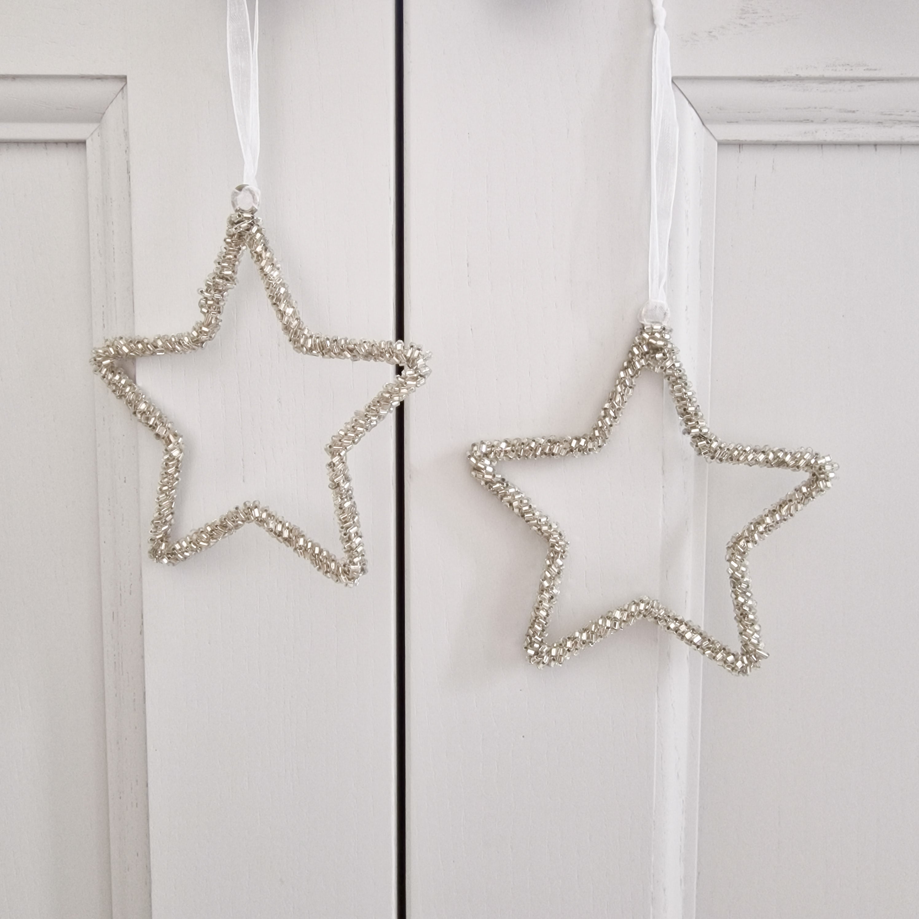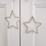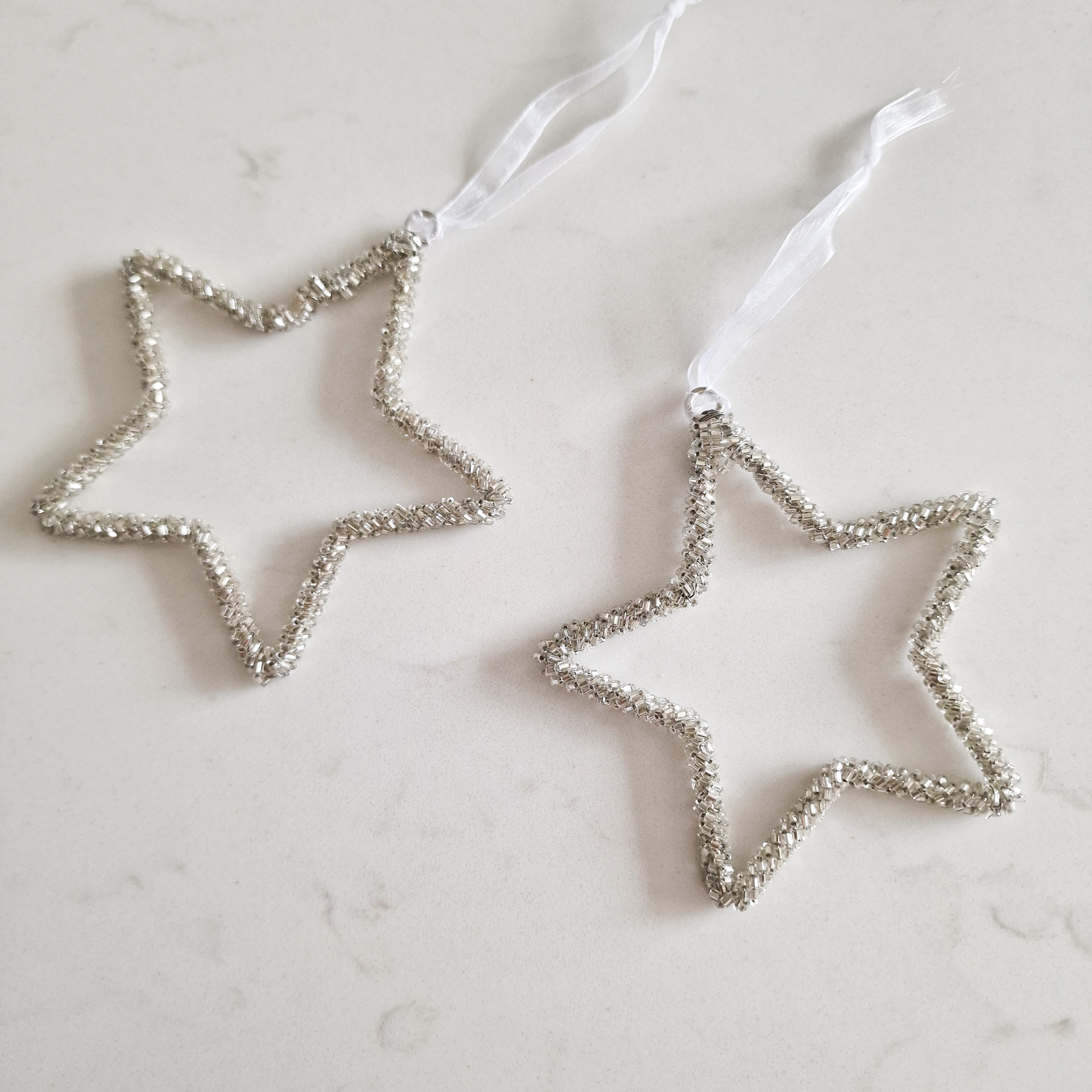 Un ajout magnifique à votre intérieur ou à votre décoration de Noël. Ce duo de magnifiques étoiles décoratives est composé de perles argentées enfilées à la main sur une structure métallique robuste. Nous adorons la façon dont elles reflètent la lumière. Elles sont ornées d'un lien en organza blanc. Accrochez ces cœurs à une fenêtre, au-dessus de la cheminée ou à votre sapin de Noël pour une touche d'éclat cet automne/hiver.