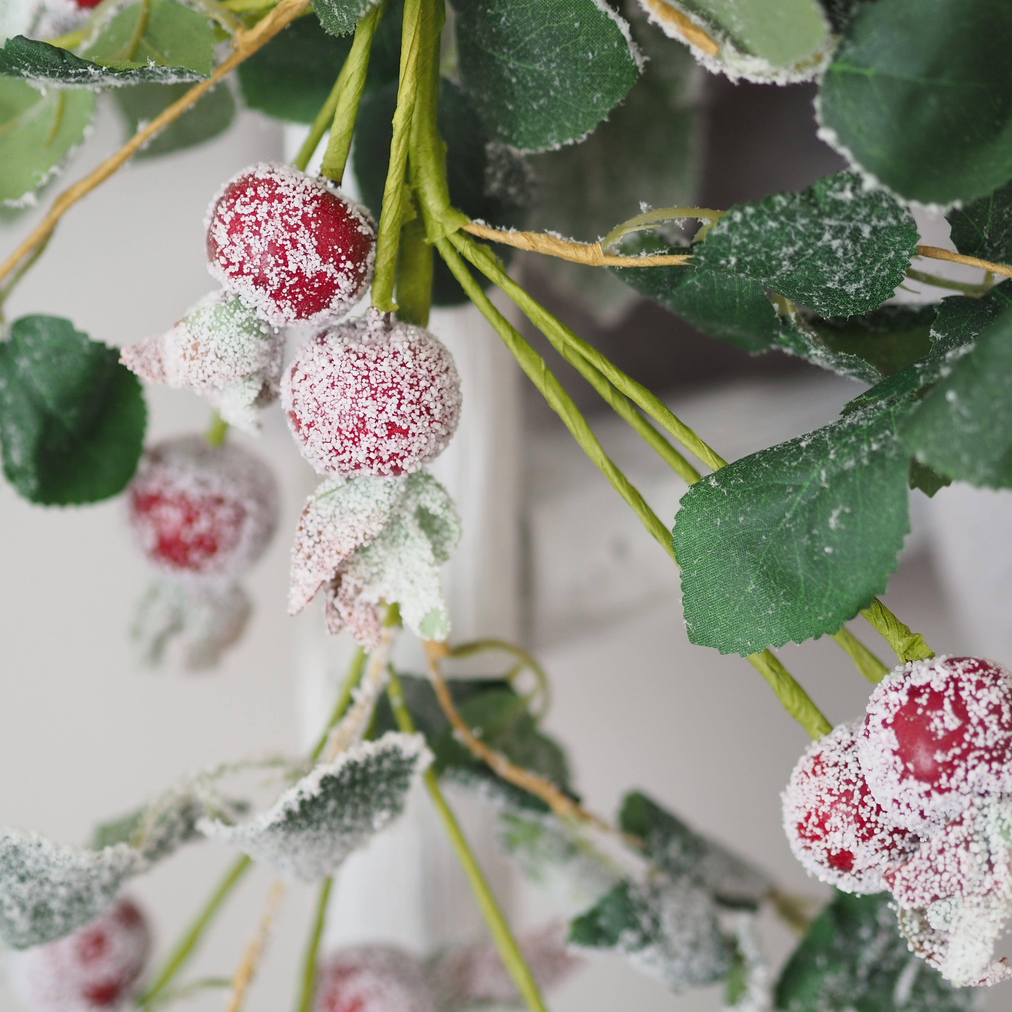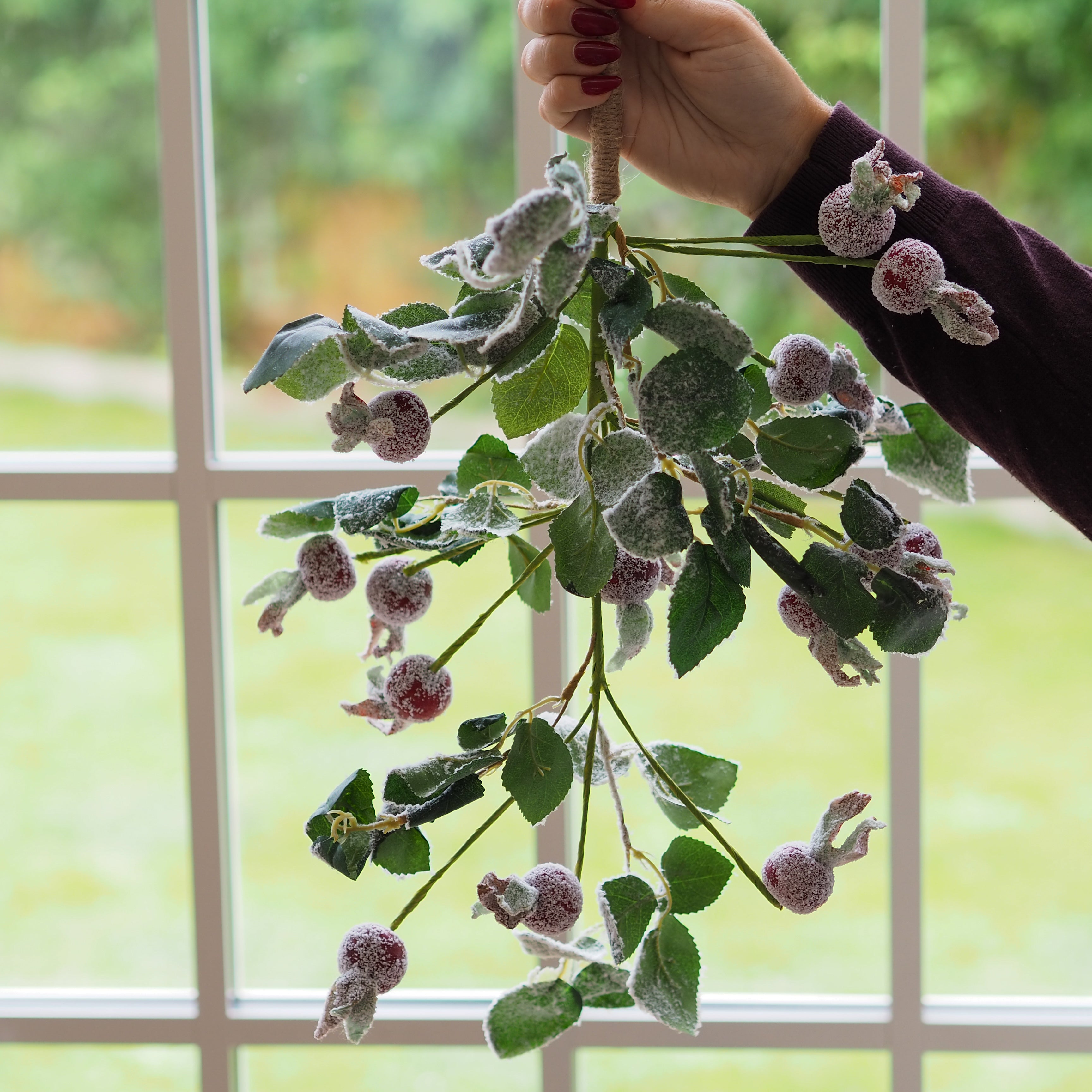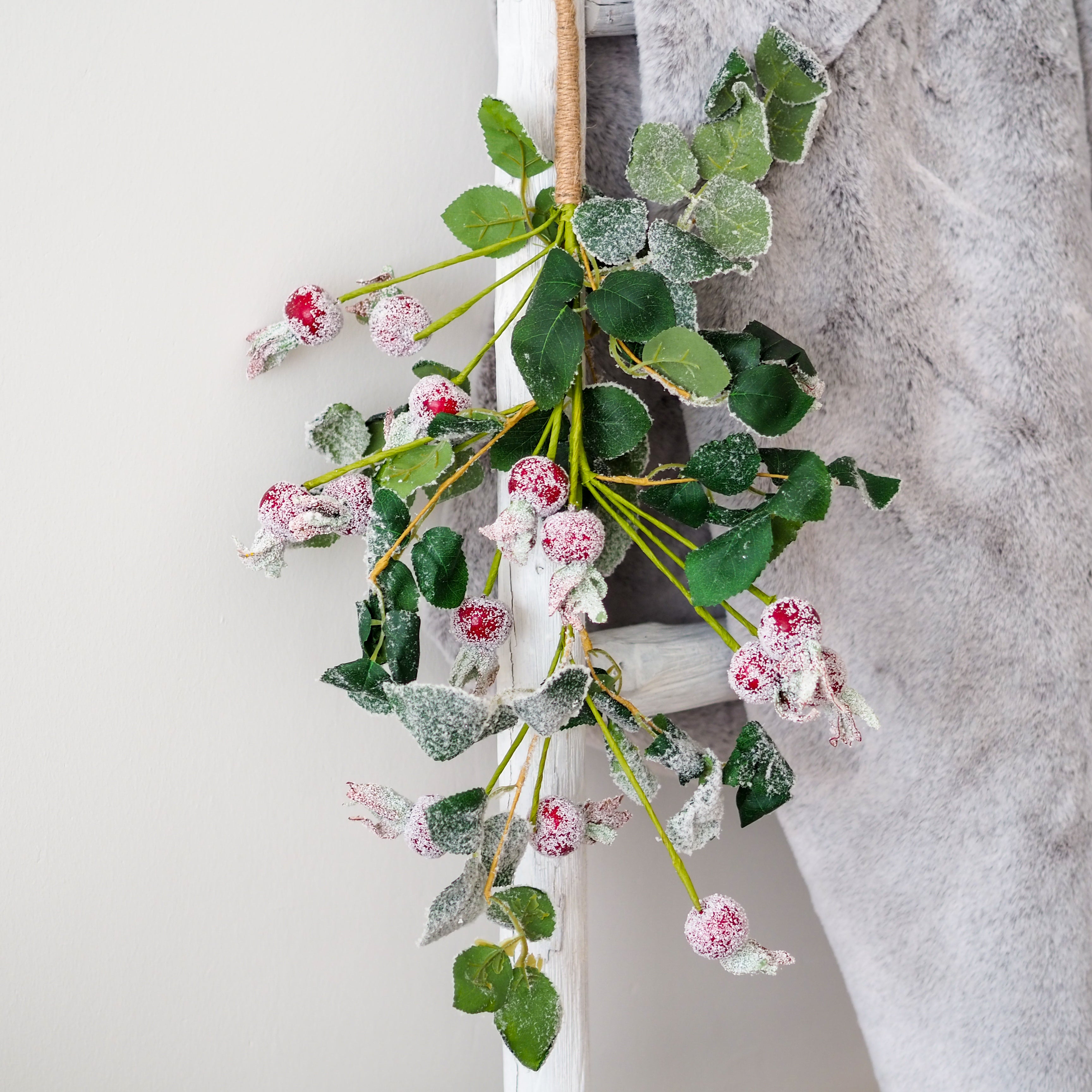 A timeless classic for your seasonal displays. This beautiful Winter berry swag is made with a leafy green backdrop and adorned with frosted effect berries and rosehips. The timeless design captures the essence of Winter's beauty, all hand tied with a twine handle for easy hanging in doorways or around a mantle.