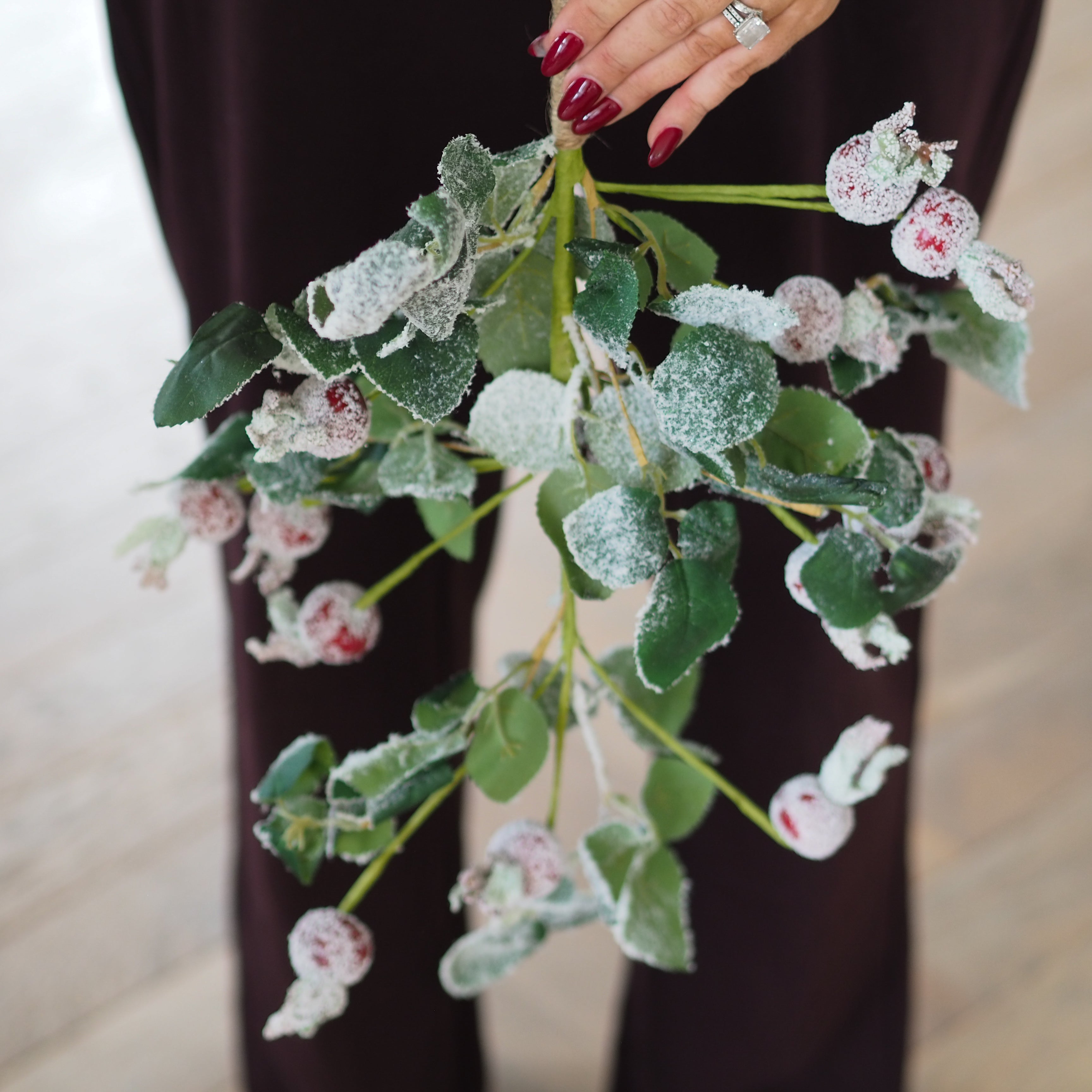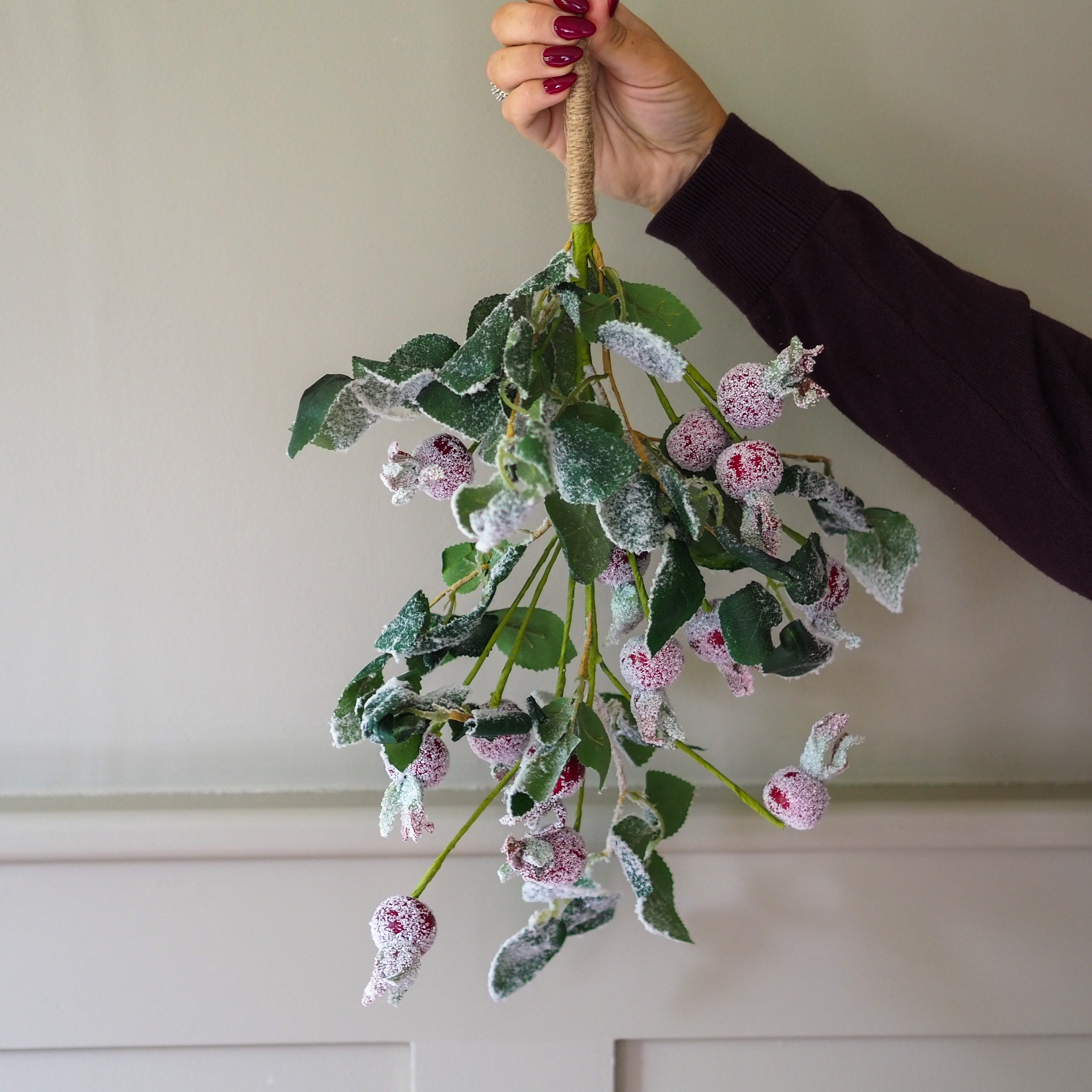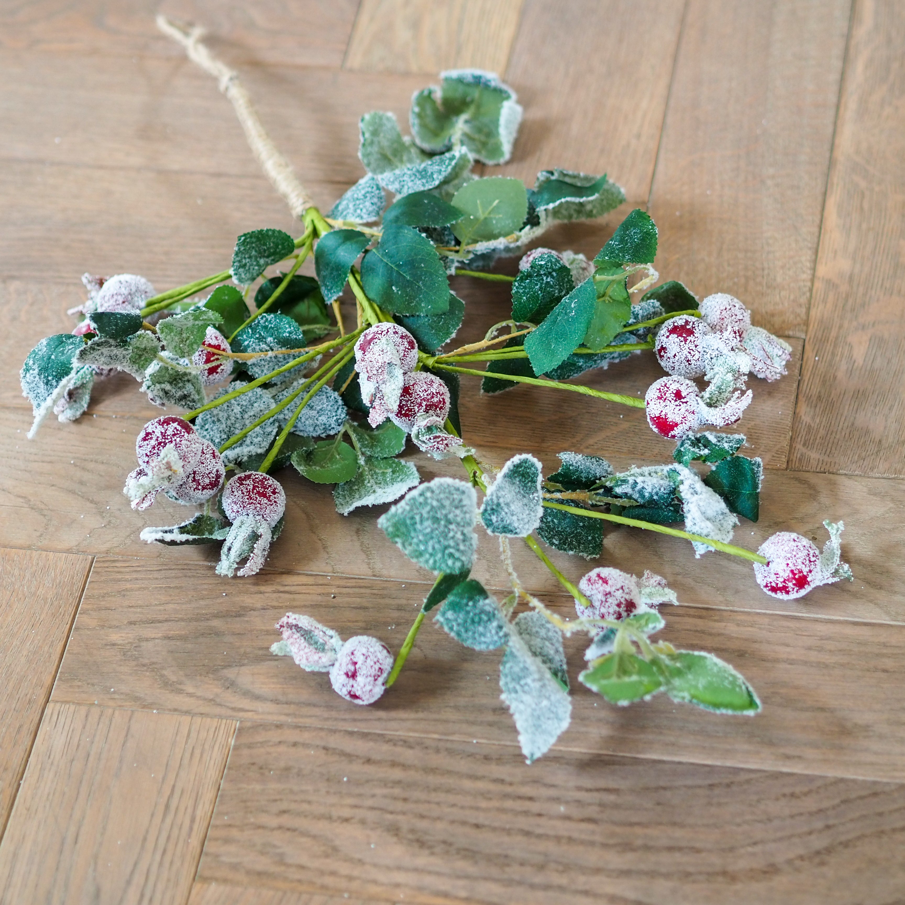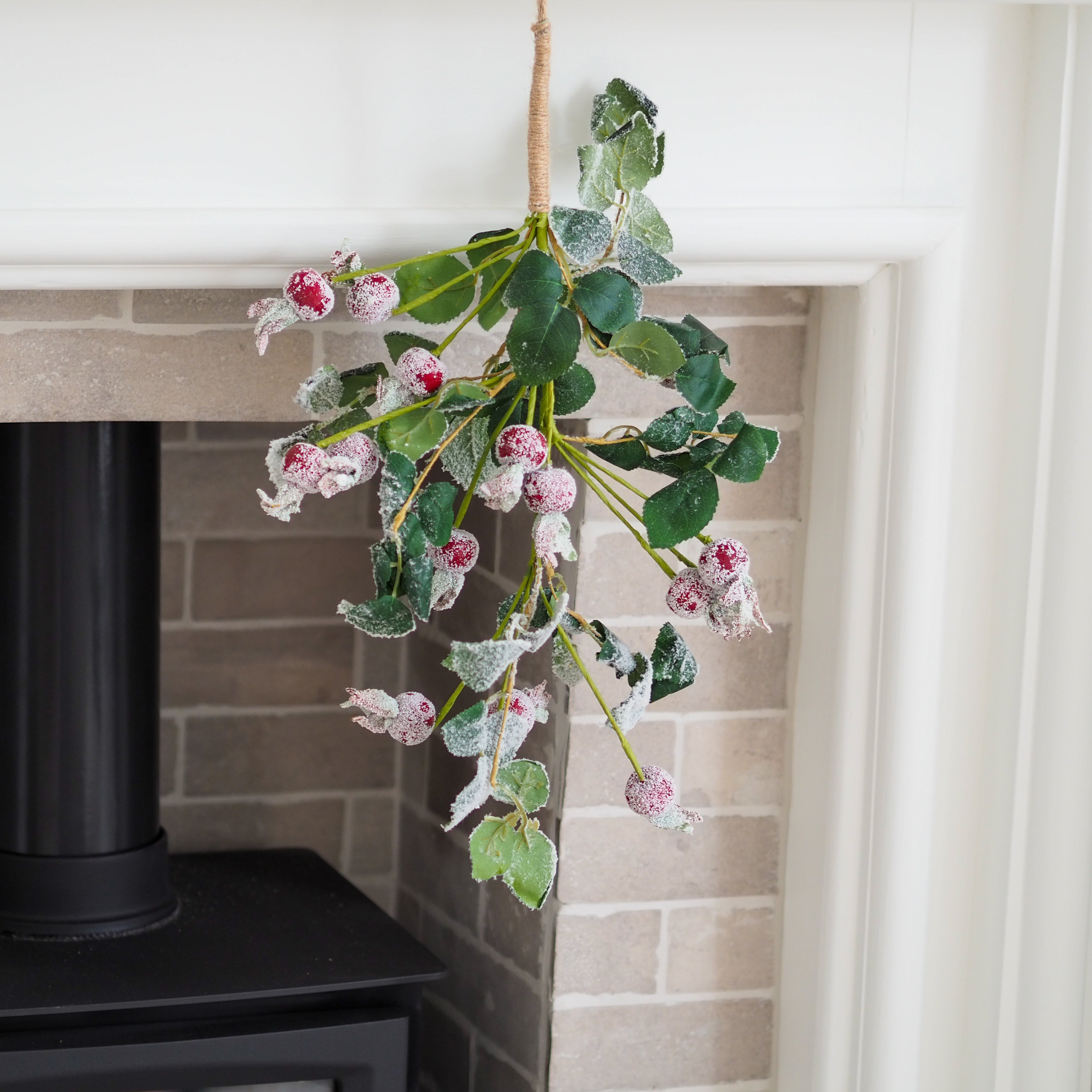 A timeless classic for your seasonal displays. This beautiful Winter berry swag is made with a leafy green backdrop and adorned with frosted effect berries and rosehips. The timeless design captures the essence of Winter's beauty, all hand tied with a twine handle for easy hanging in doorways or around a mantle.