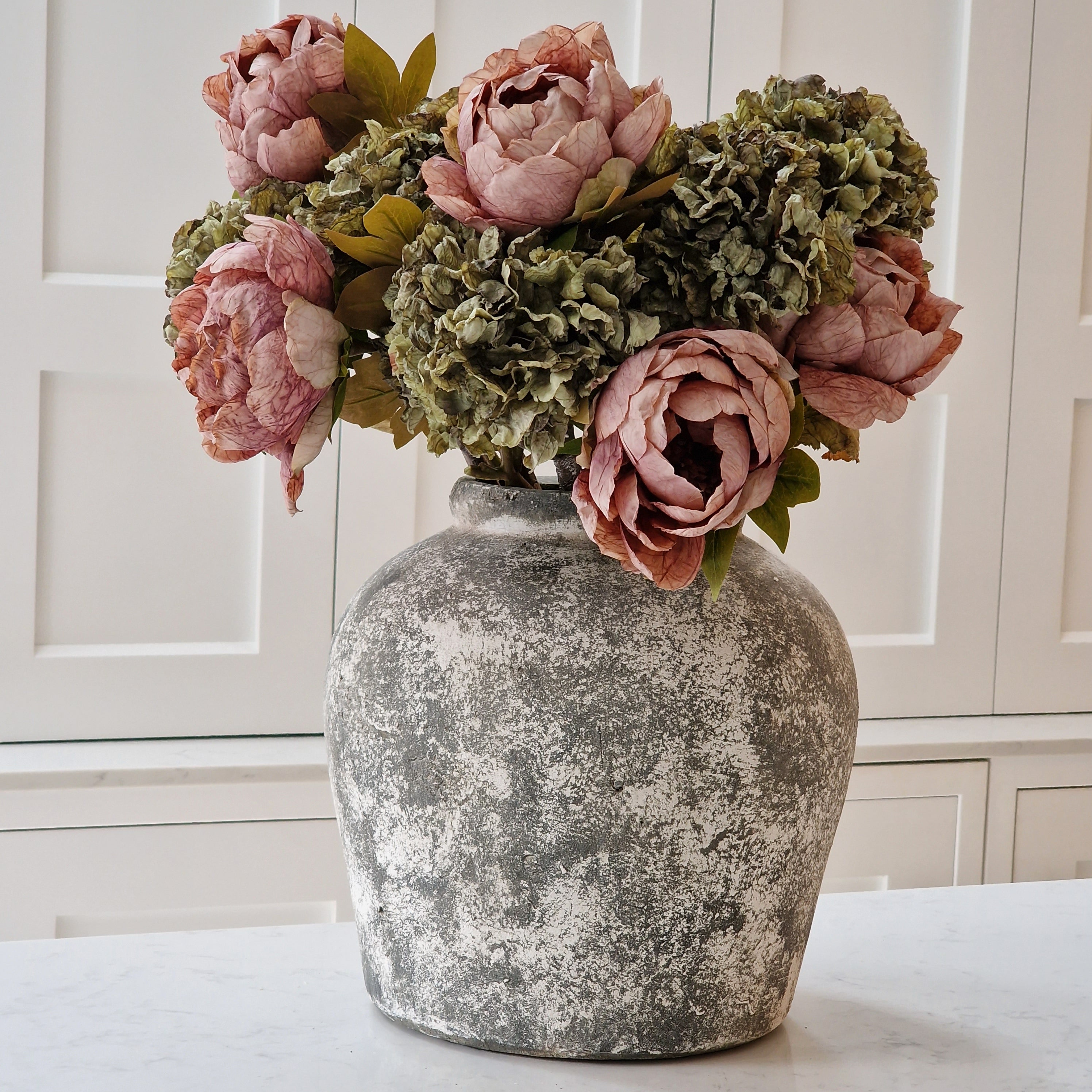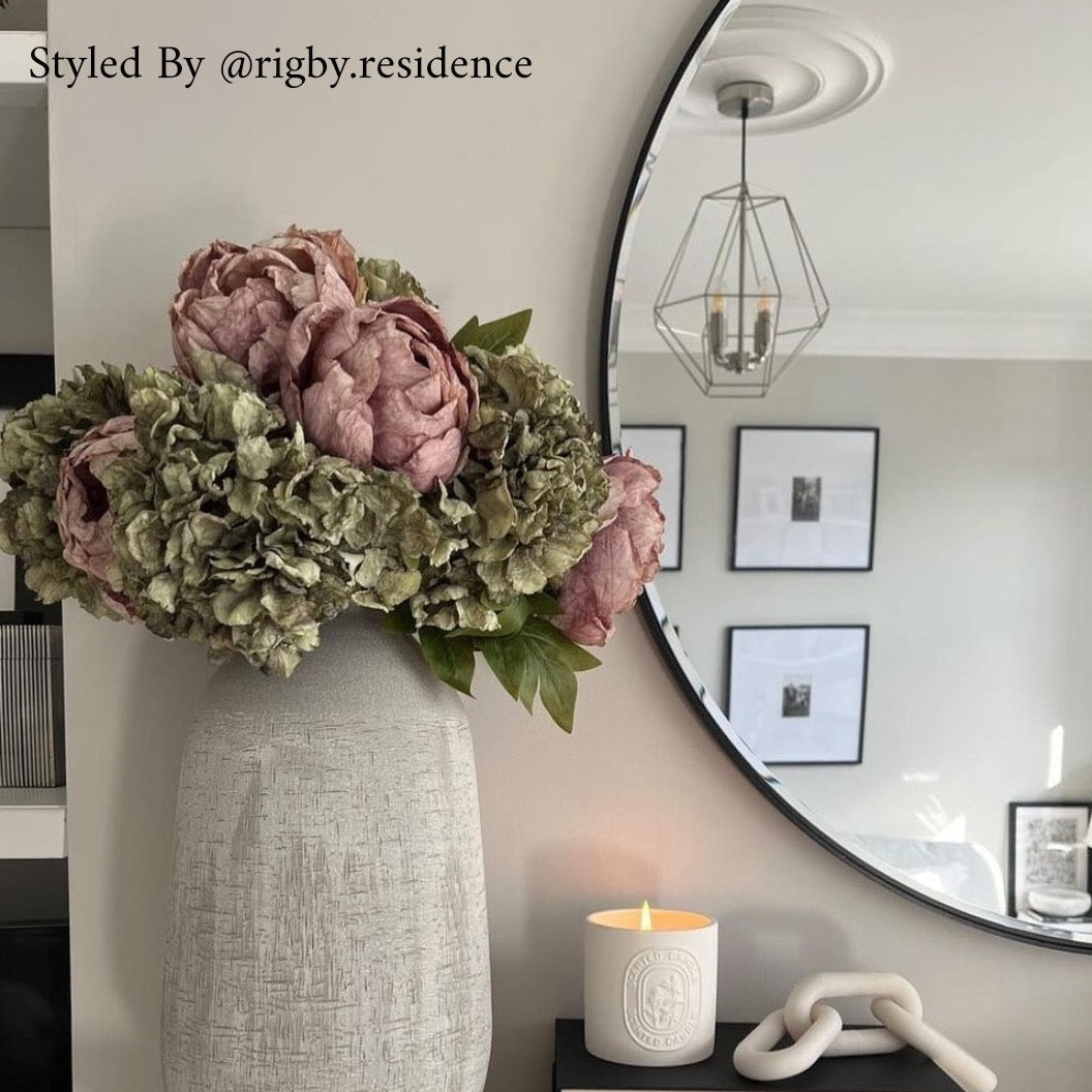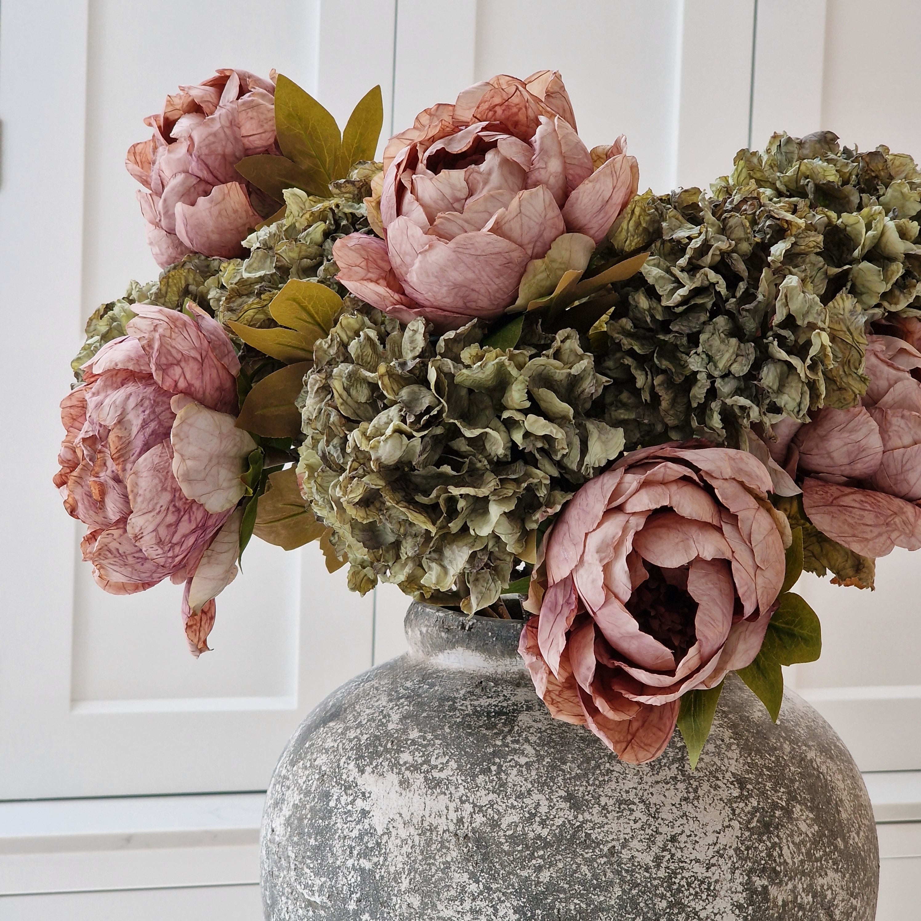 Superbe ajout à notre collection de bouquets artificiels, ces tiges fermées de pivoines roses artificielles séchées au toucher sont parfaites pour créer une composition florale spectaculaire chez vous. Elles sont accompagnées d'hortensias artificiels verts séchés au toucher. Les têtes d'hortensia sont ornées de magnifiques pétales détaillés et de feuilles ultra-réalistes. Les têtes d'hortensia et de pivoine sont conçues pour ressembler à de vraies fleurs séchées à l'air libre. Ce bouquet noué à la main sera parfait dans votre vase préféré et vous accompagnera au fil des saisons.
