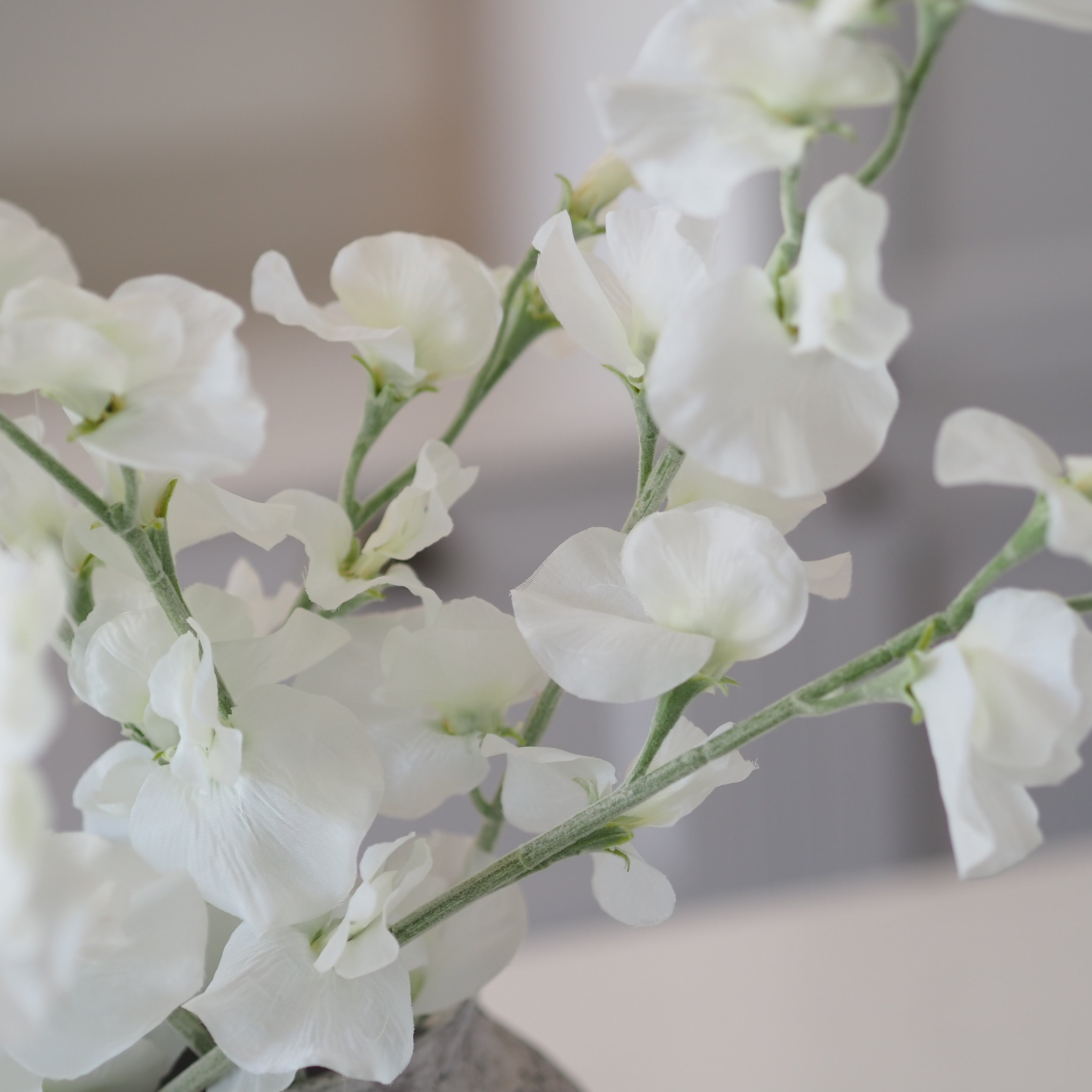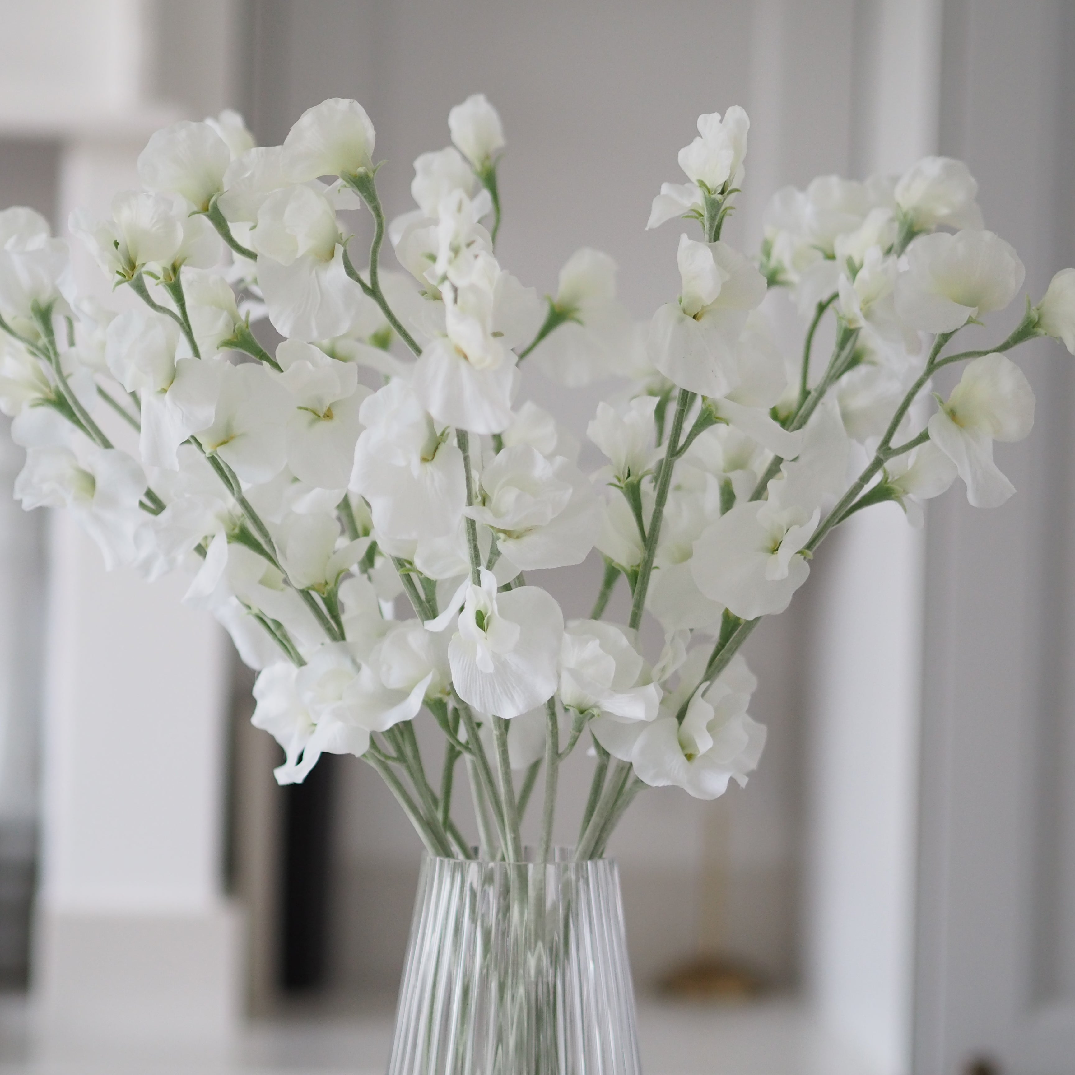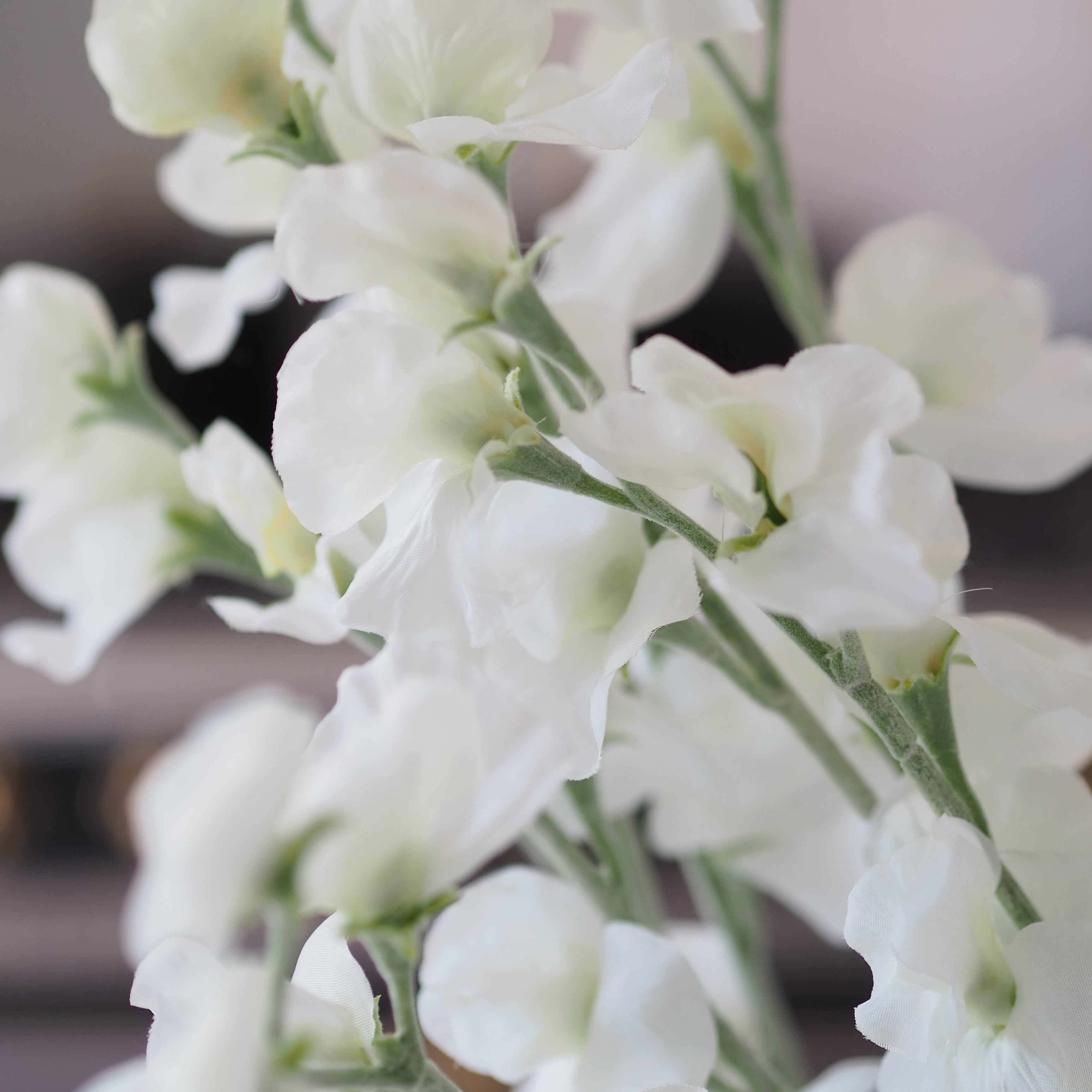 Superbe ajout à notre collection de bouquets artificiels, ces délicates tiges de pois de senteur multiflores en soie blanche sont parfaites pour créer une composition florale spectaculaire chez vous. Composé de 10 tiges magnifiques, ce bouquet noué à la main est idéal pour des compositions florales durables chez vous ou pour offrir à vos proches. Les capitules sont ornés de pétales détaillés d'un blanc éclatant.