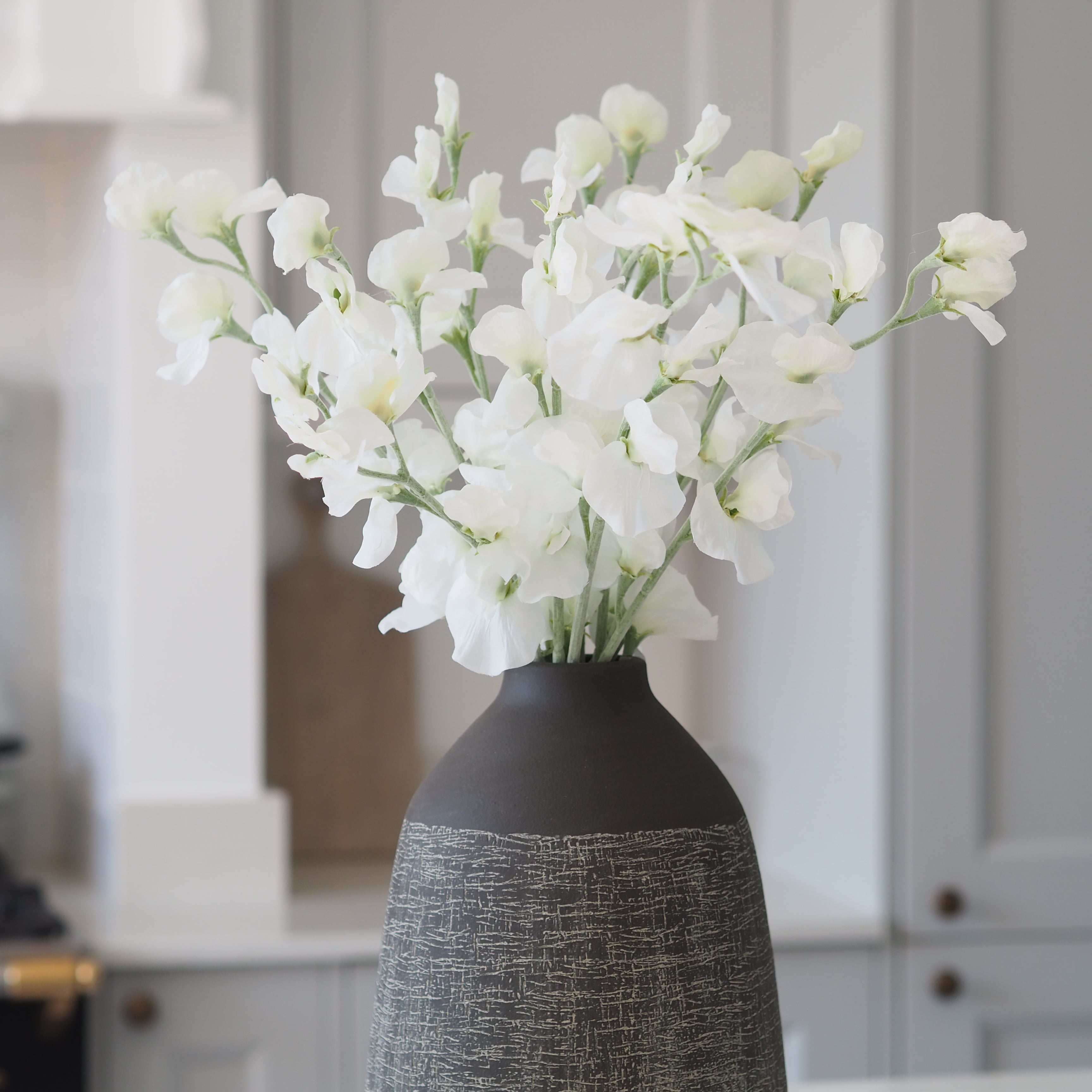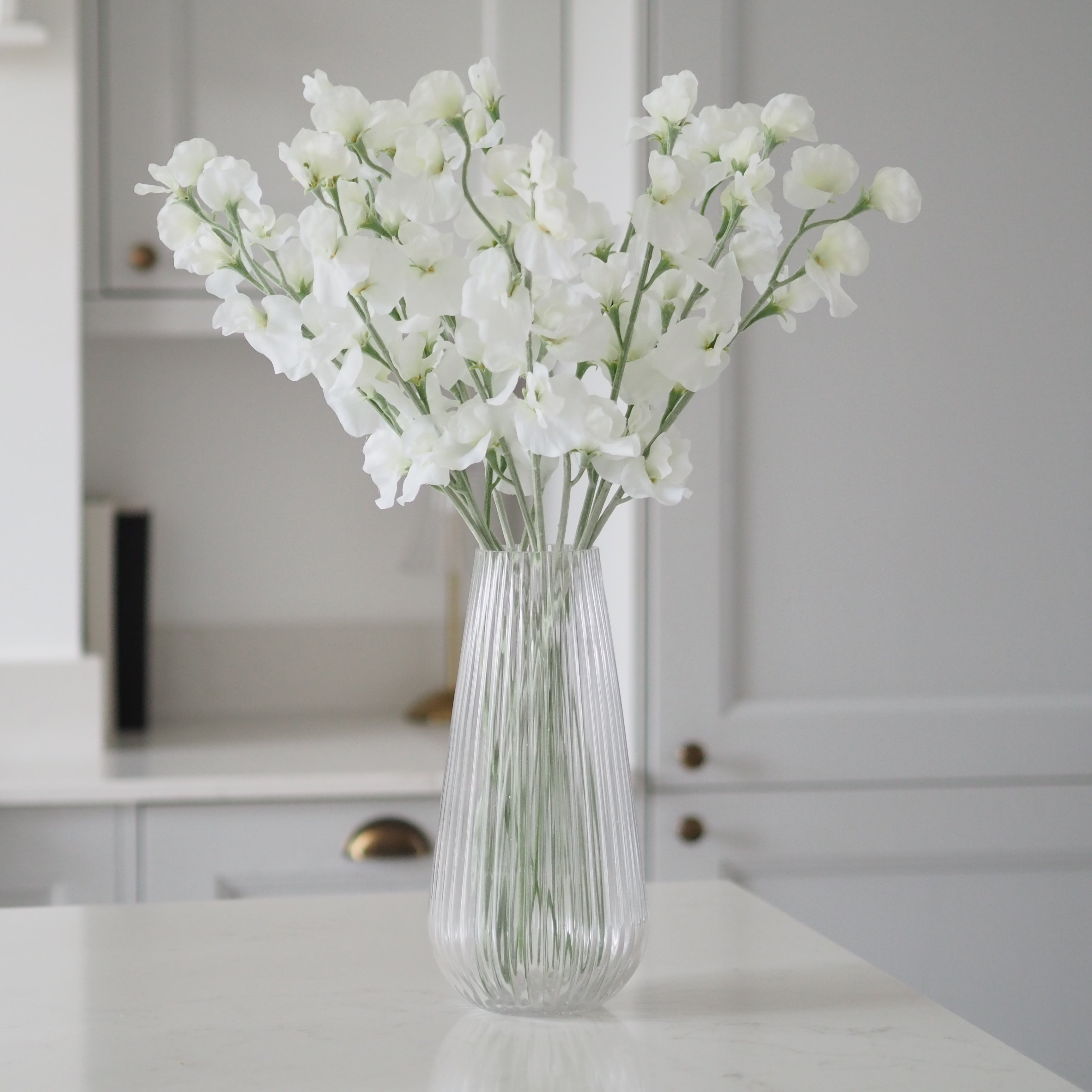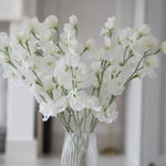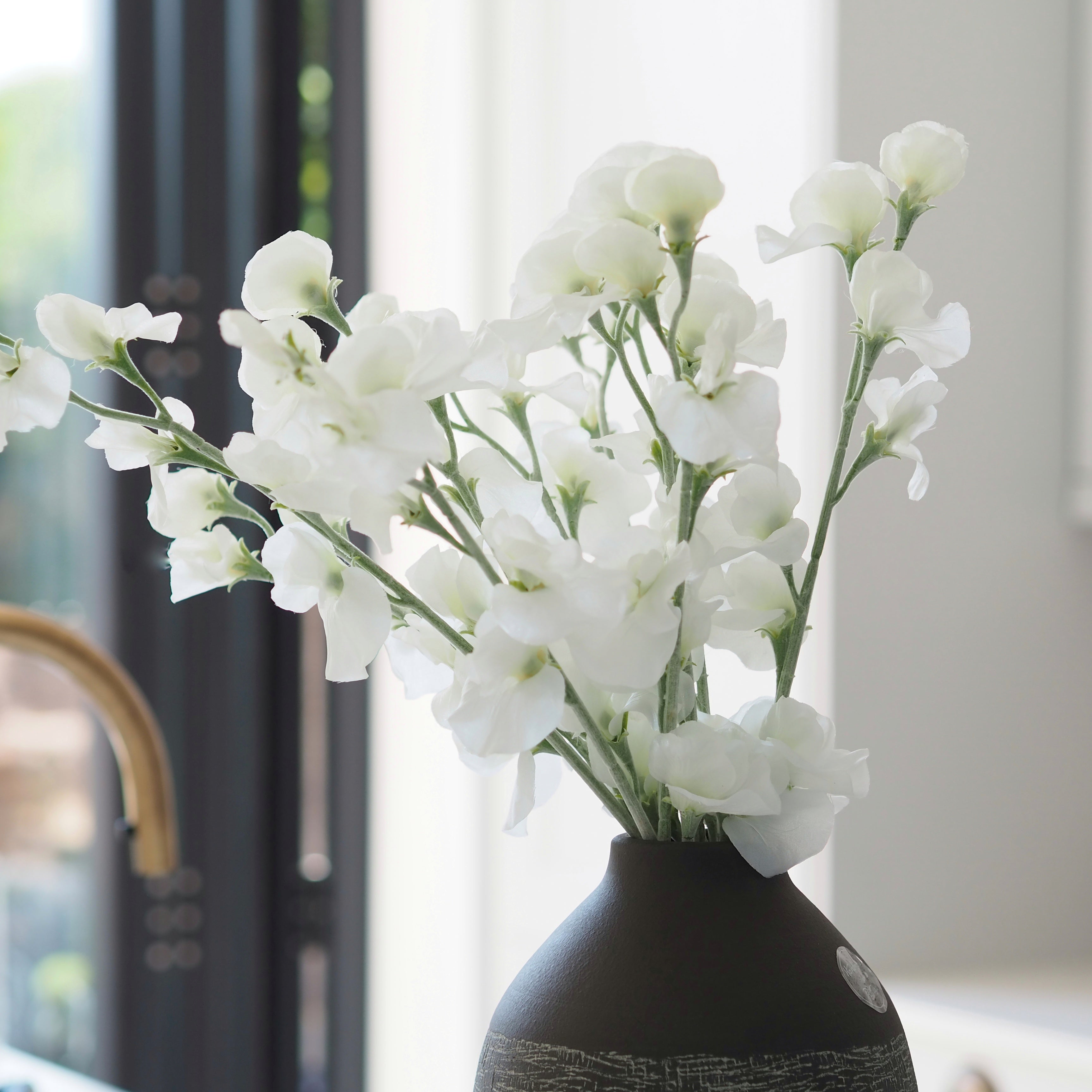 Superbe ajout à notre collection de bouquets artificiels, ces délicates tiges de pois de senteur multiflores en soie blanche sont parfaites pour créer une composition florale spectaculaire chez vous. Composé de 10 tiges magnifiques, ce bouquet noué à la main est idéal pour des compositions florales durables chez vous ou pour offrir à vos proches. Les capitules sont ornés de pétales détaillés d'un blanc éclatant.