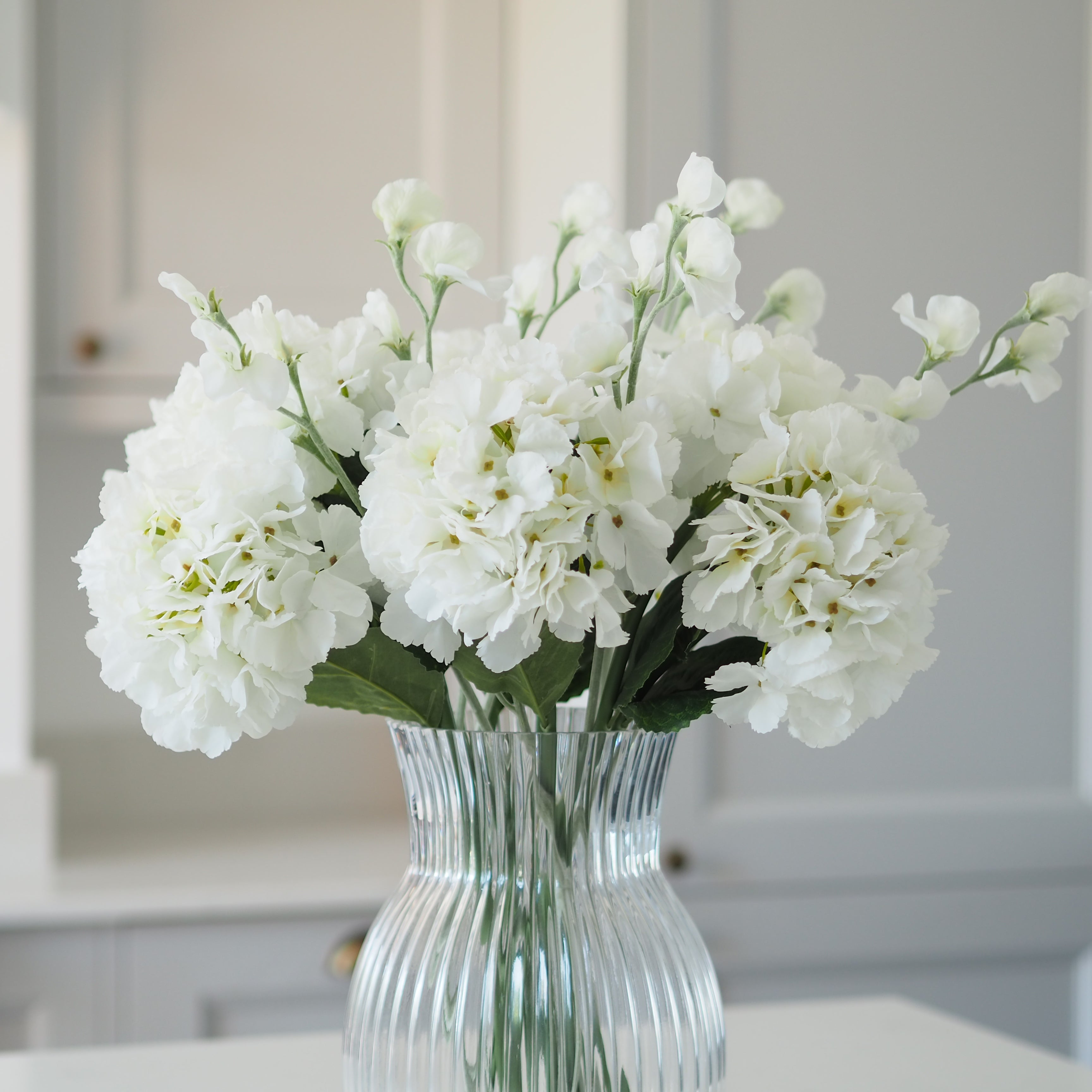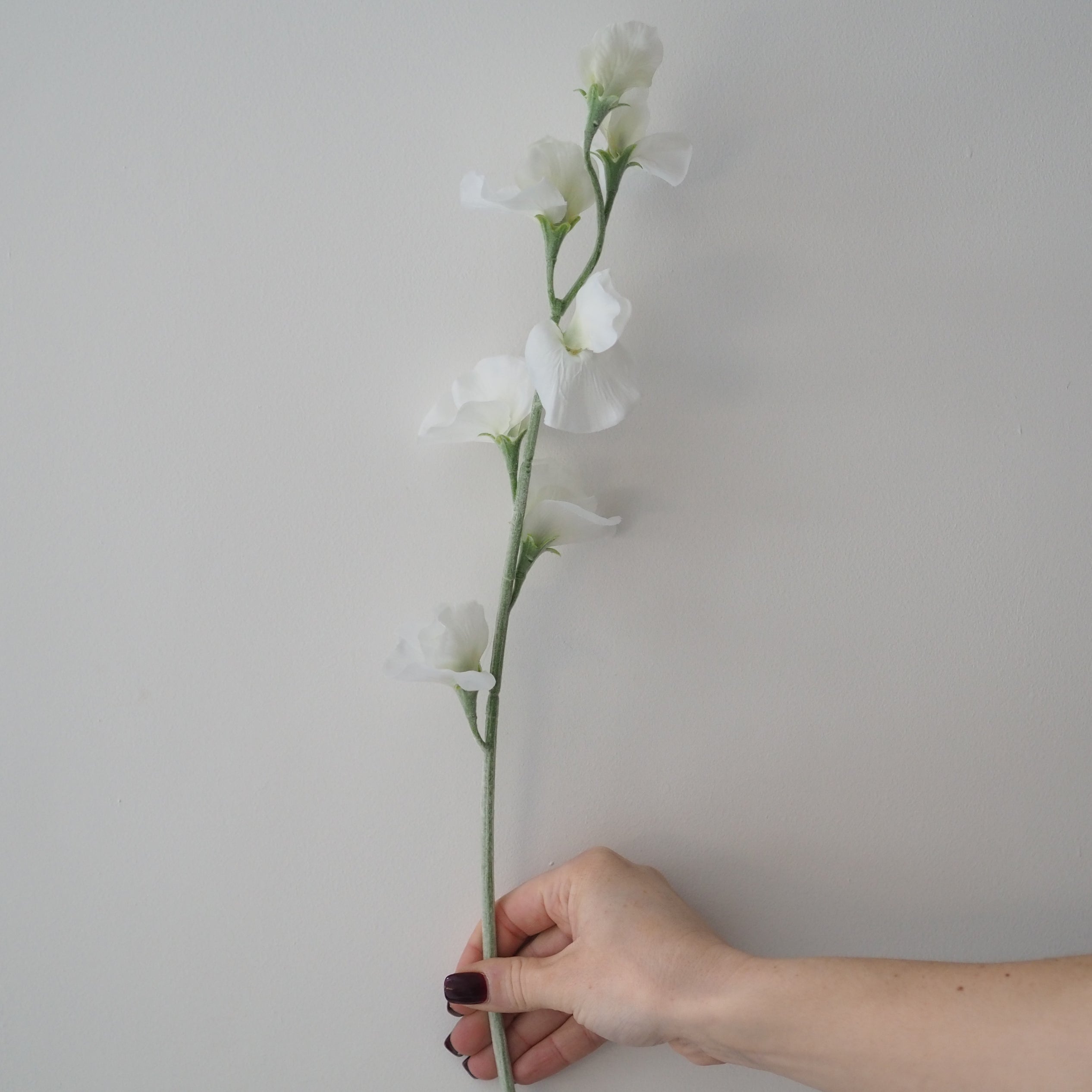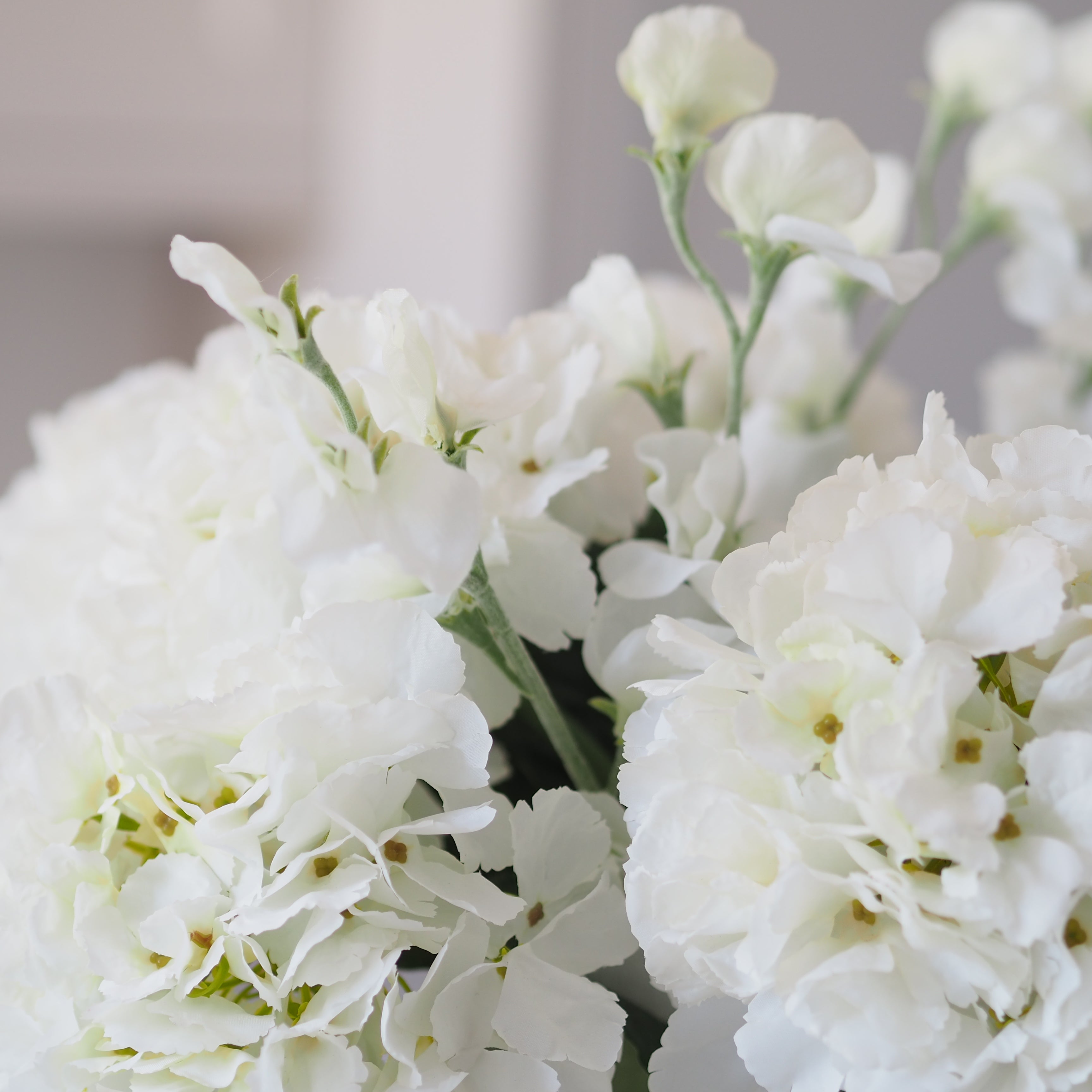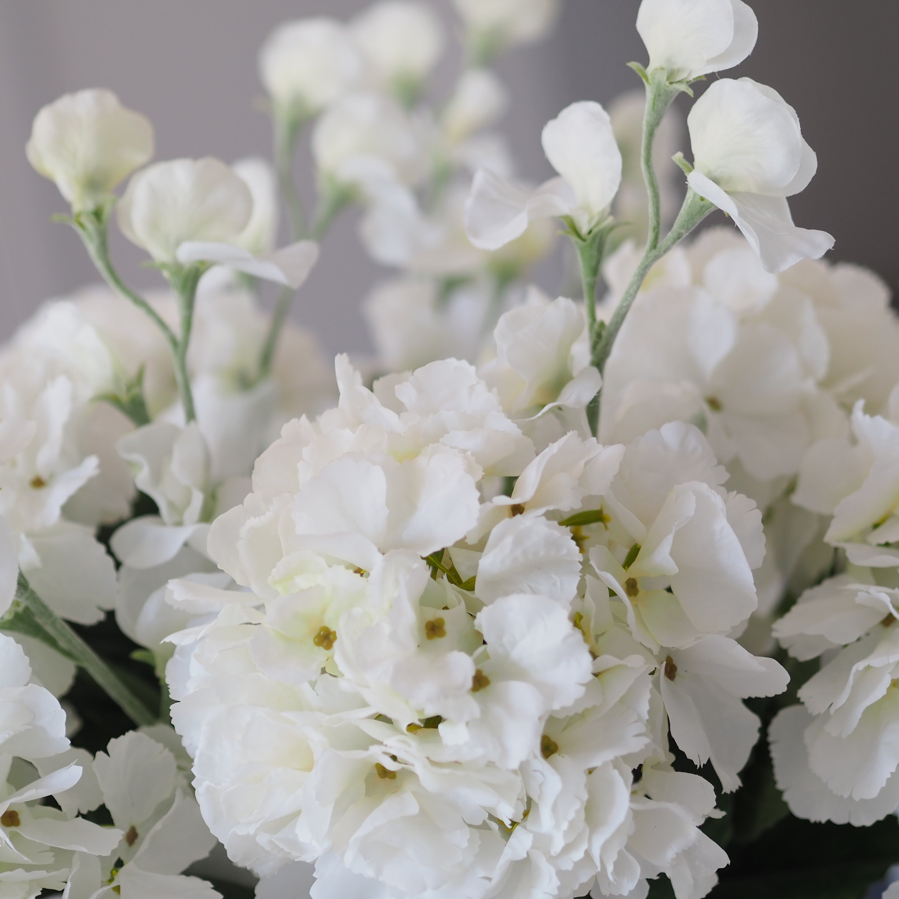 Un superbe bouquet blanc classique, parfait pour remplir votre vase préféré. Ces hortensias artificiels blancs sont parfaits pour créer une composition florale spectaculaire dans votre intérieur, accompagnés de 6 magnifiques tiges de pois de senteur pour une élégance intemporelle. Les têtes d'hortensia sont ornées de magnifiques pétales détaillés et de feuilles ultra-réalistes, conçues pour ressembler à de vraies fleurs. Les têtes de pois de senteur sont ornées de pétales détaillés. Nos bouquets faits main sont le complément idéal pour votre intérieur. Toutes les tiges sont câblées à la main et leur hauteur peut être ajustée en repliant délicatement la base pour s'adapter au vase choisi.