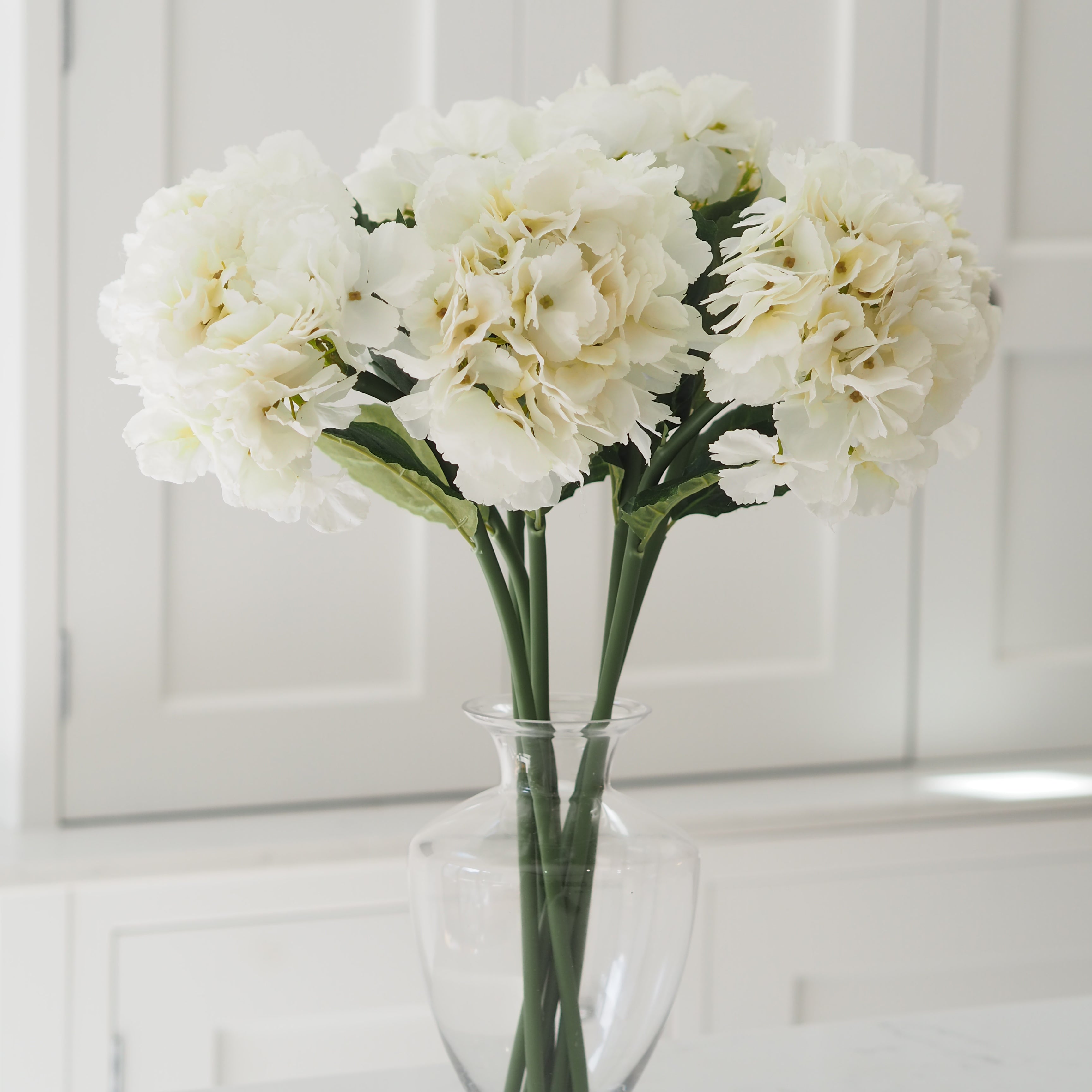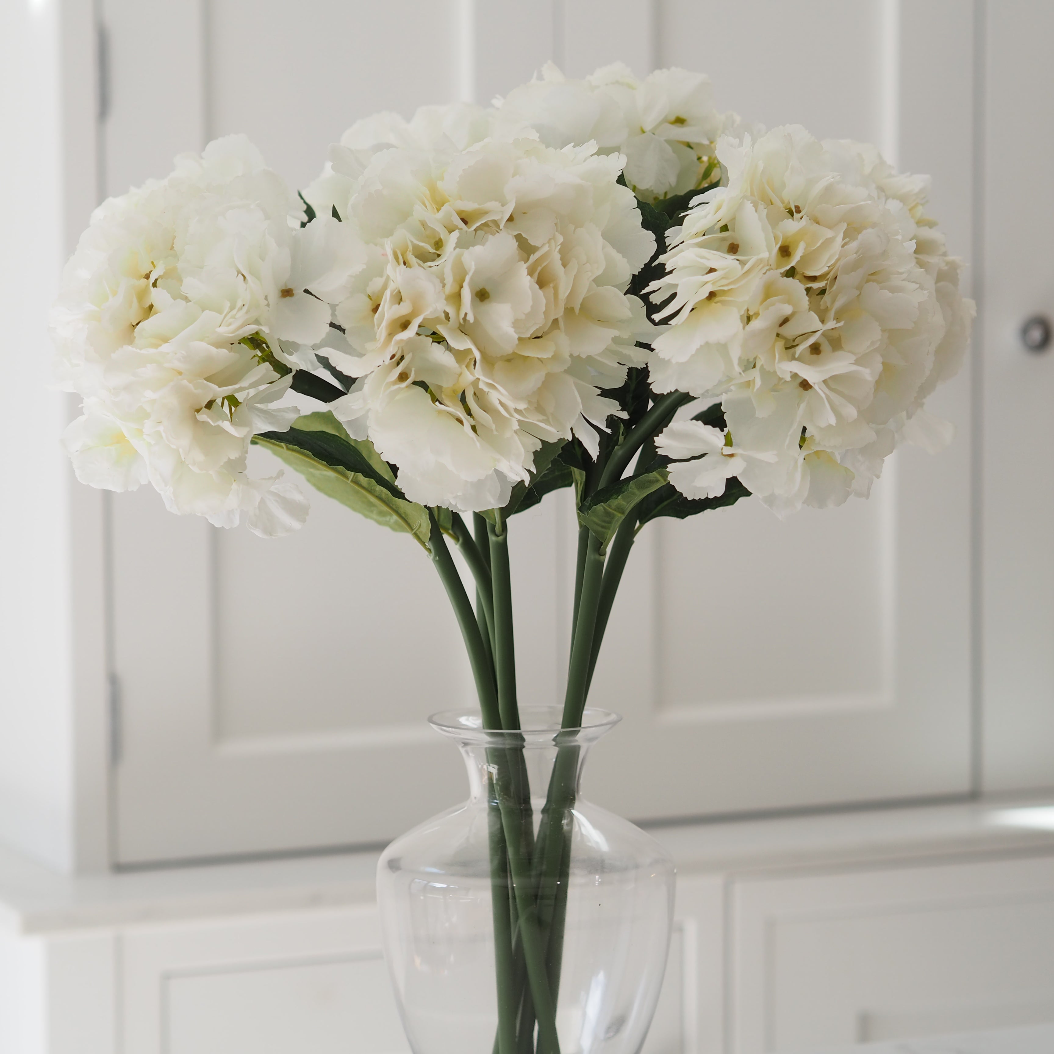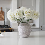 A stunning addition to our faux stem collection, these white hydrangeas are perfect for creating a dramatic floral display in your home. The heads are frilled with beautiful detailed petals and leaves and are designed to look ultra realistic. Style in your favourite vase in multiples for a stunning display.