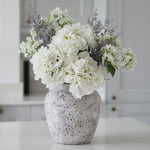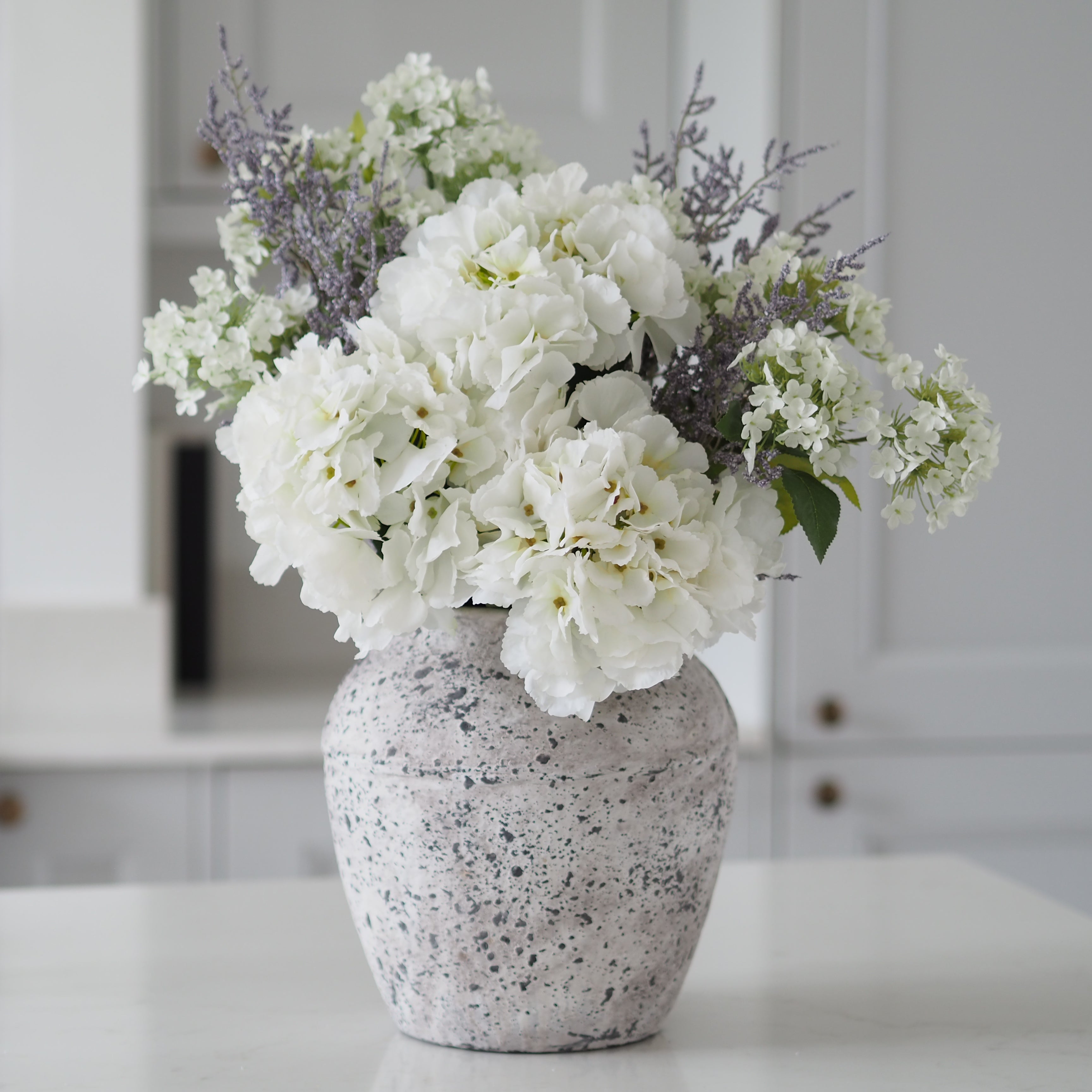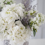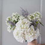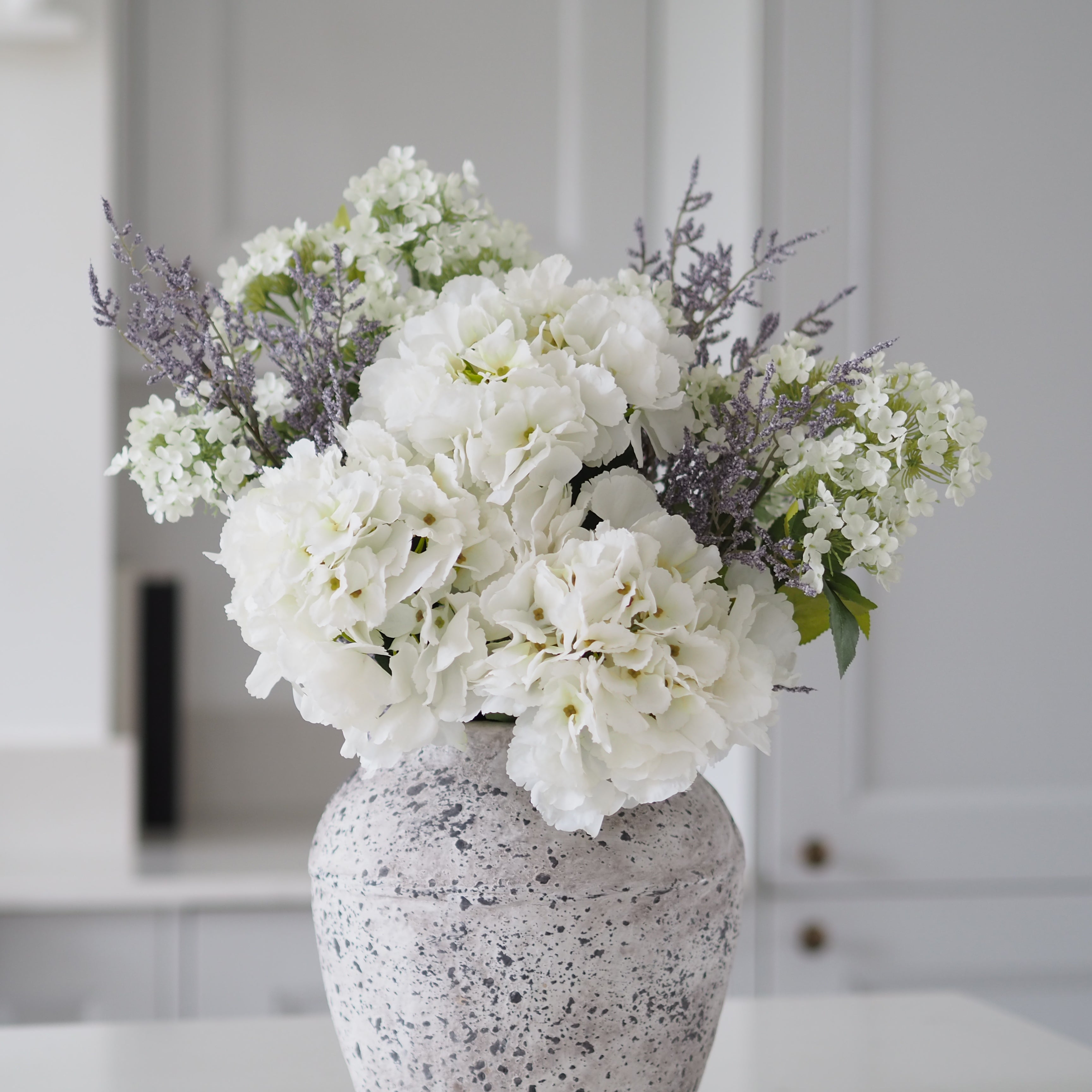 A stunning addition to our bouquet collection, and the perfect way to add subtle pastel colour to your home this season. This Lilac spring bouquet is filled with delicate Charlotte stems, lilac dried touch limonium, teamed with our classic white hydrangea. The heads of each flower are frilled with beautiful detailed petals and ultra realistic leaves. Style in your favourite vase for a stunning display.