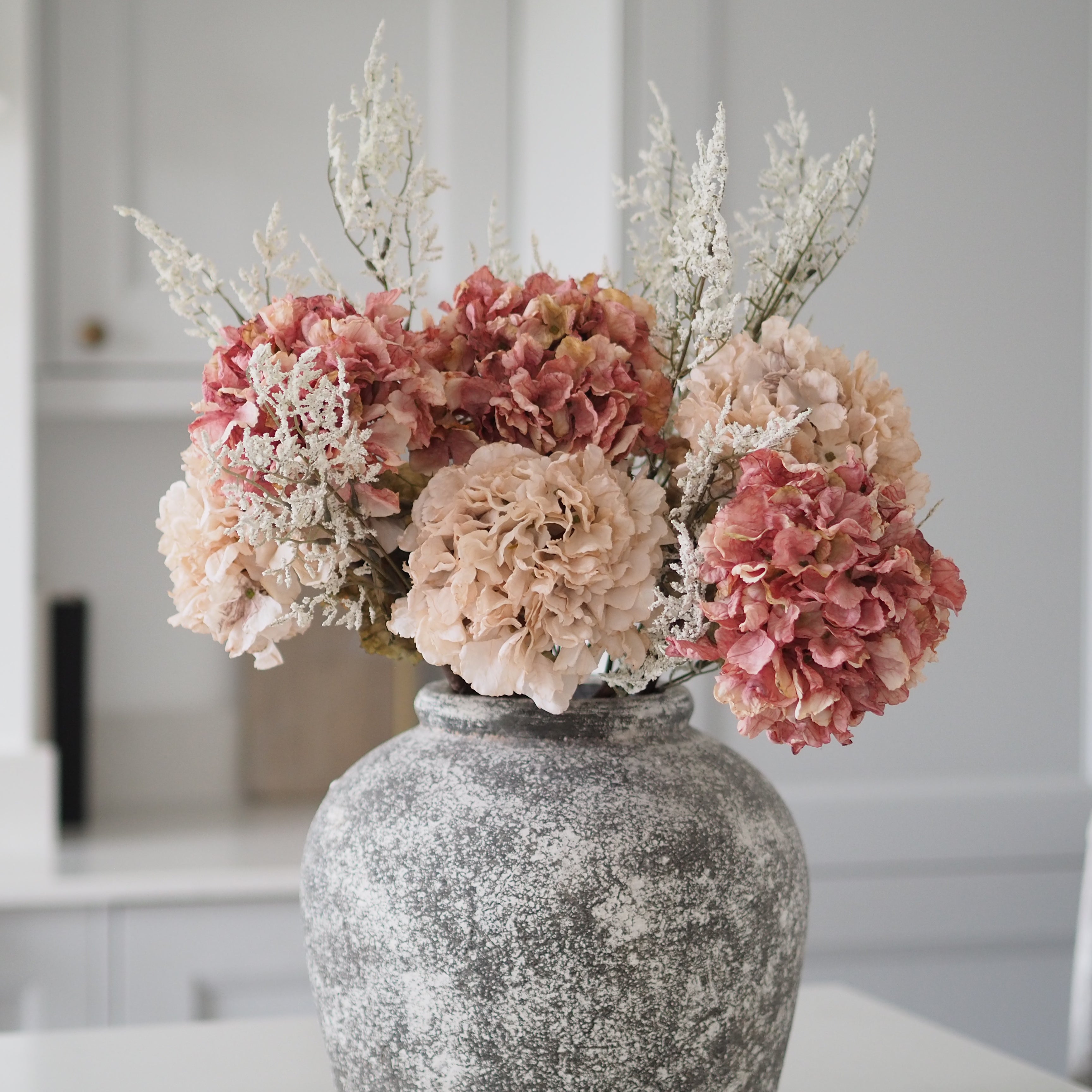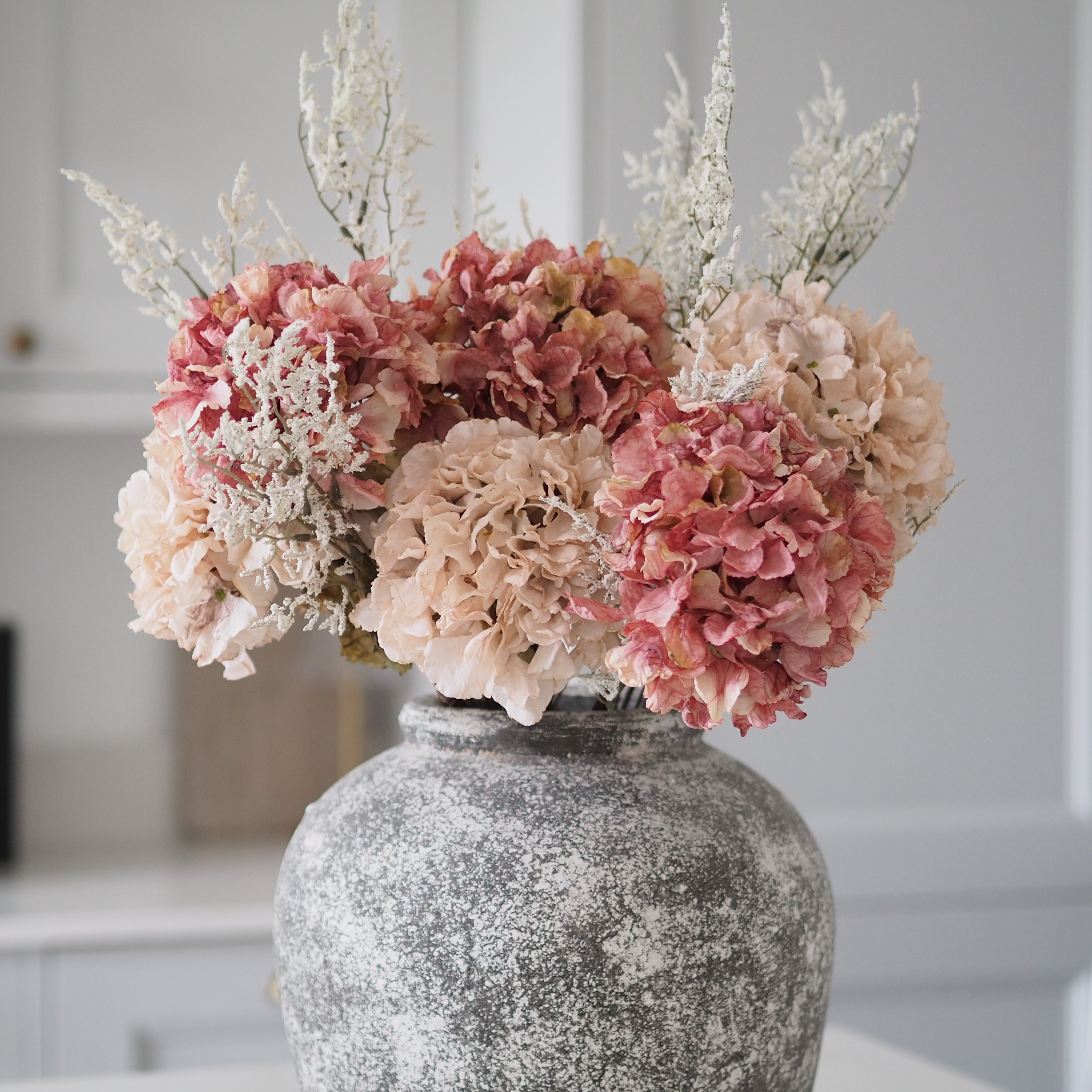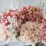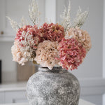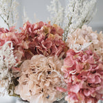 A stunning addition to our faux bouquet collection, and the perfect gift for your loved one this Valentines & Mothers Day. These dried touch faux pink and blush hydrangea stems are perfect for creating a dramatic floral display in your home. Paired with delicate limonium to add texture and height. The hydrangea heads are frilled with beautiful detailed petals and ultra realistic leaves. Both the pink and blush hydrangea heads are designed to look like they are real air-dried flowers. This hand tied bouquet is best styled in your favourite vase and will last you through the seasons.