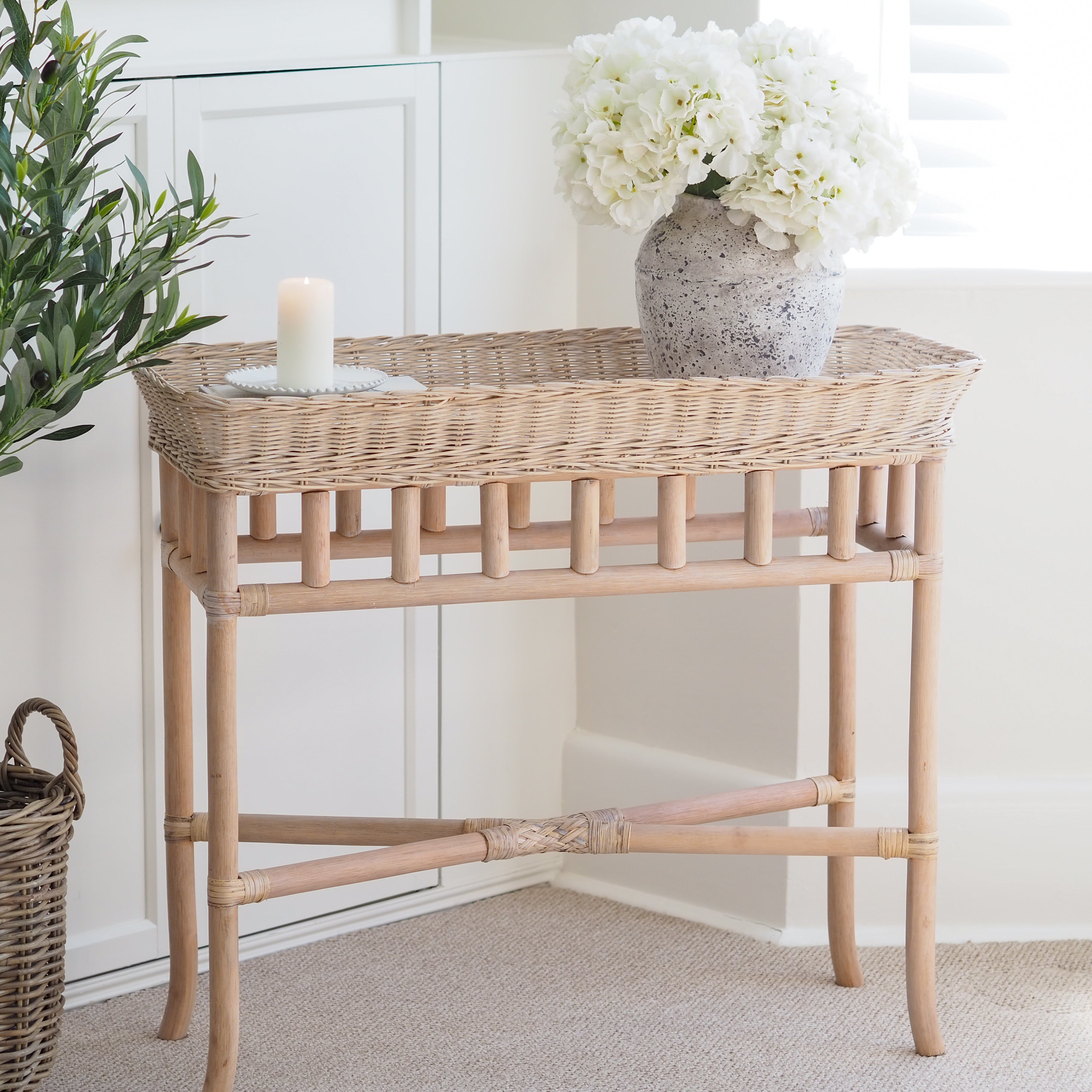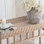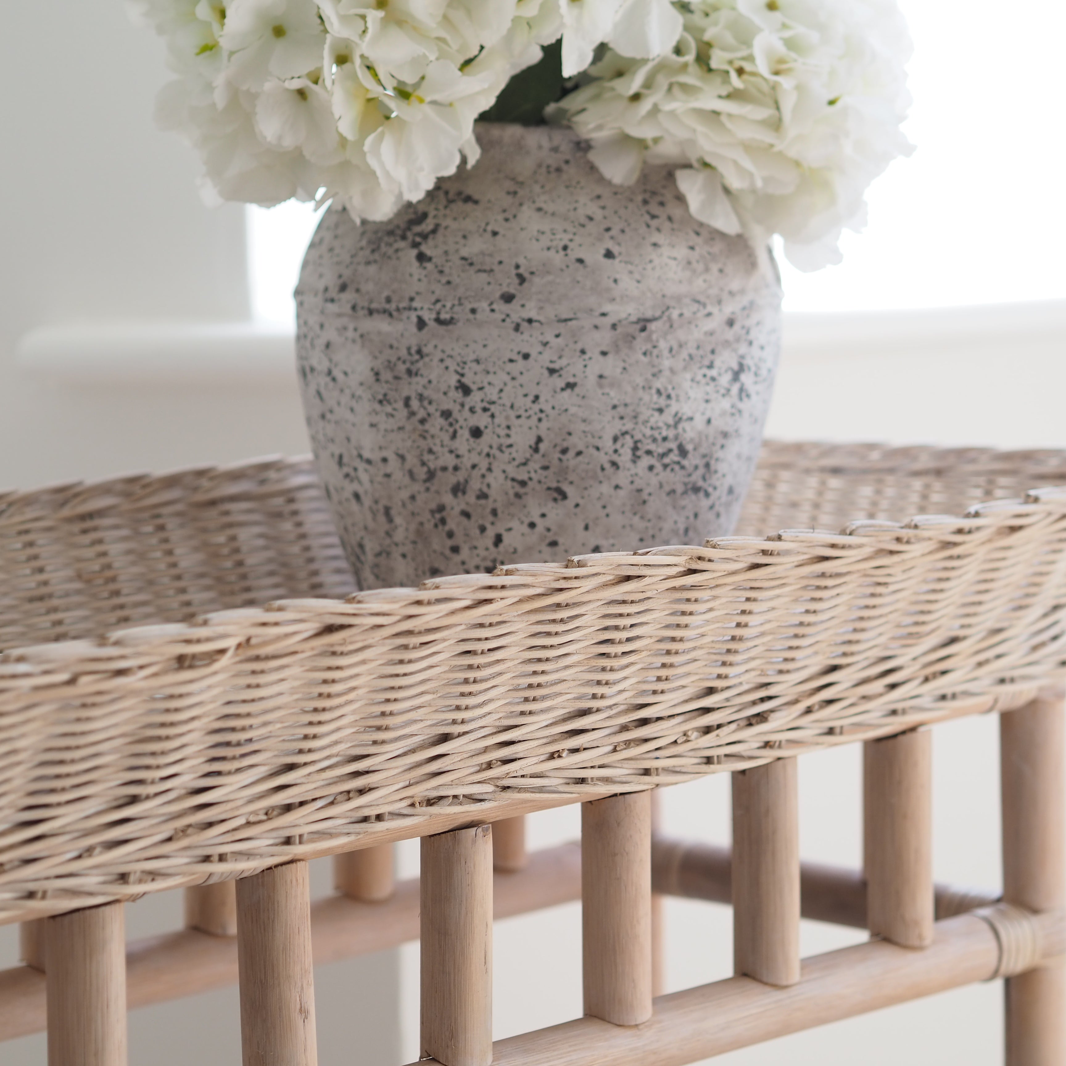 A truly stunning addition to our whitewash rattan collection. This console table is the perfect statement piece for your home. A natural finish frame is adorned with a stunning whitewash textured rattan basket top. Perfect for styling in your living space or hallway, this statement piece is a timeless addition to any home.